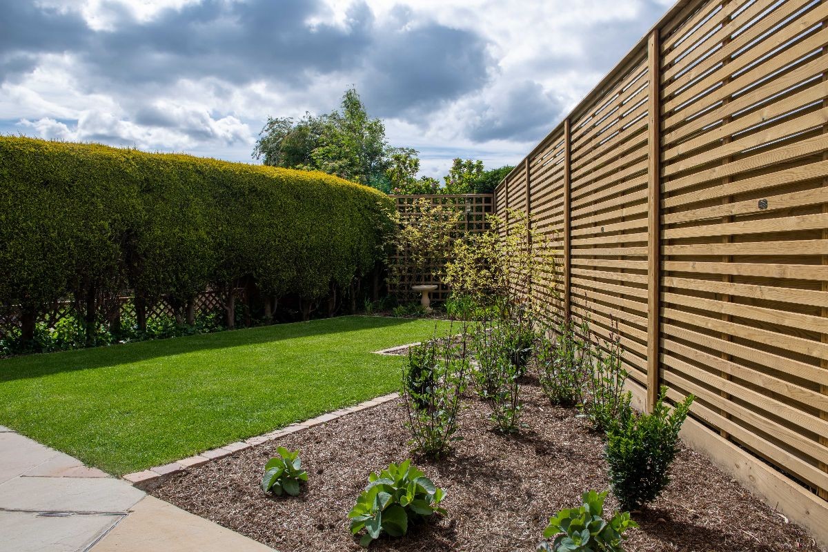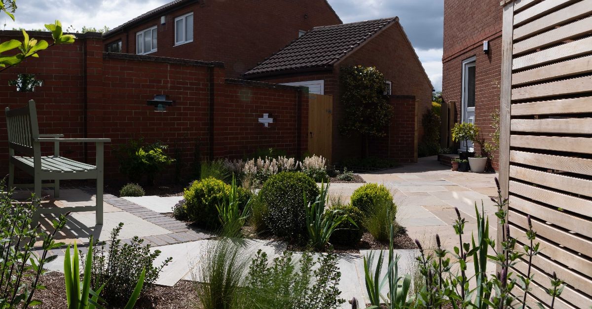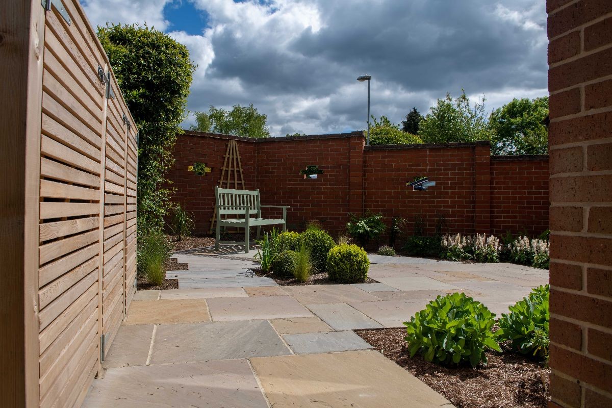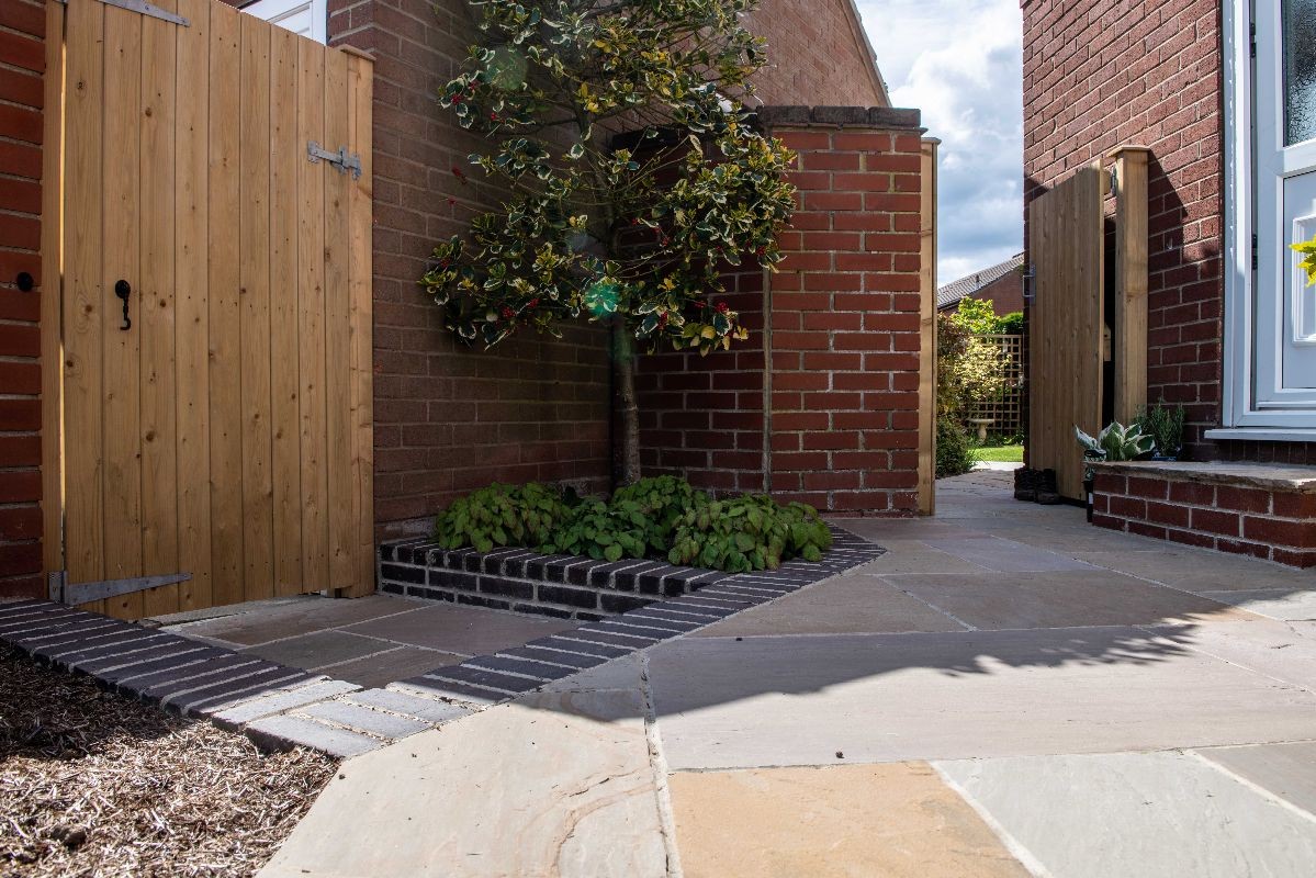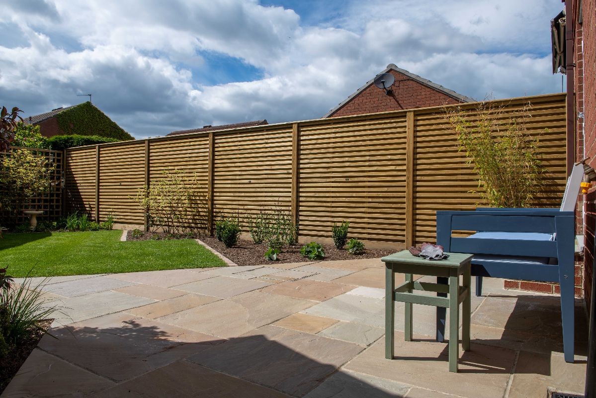 This garden uses Natural Paving Harvest to create geometric shapes broken up by planting areas. We constructed a bespoke bin store using Western Red Cedar cladding. The fencing used is the Venetian Hit-and-Miss panels and Jackposts provided by Jacksons Fencing.