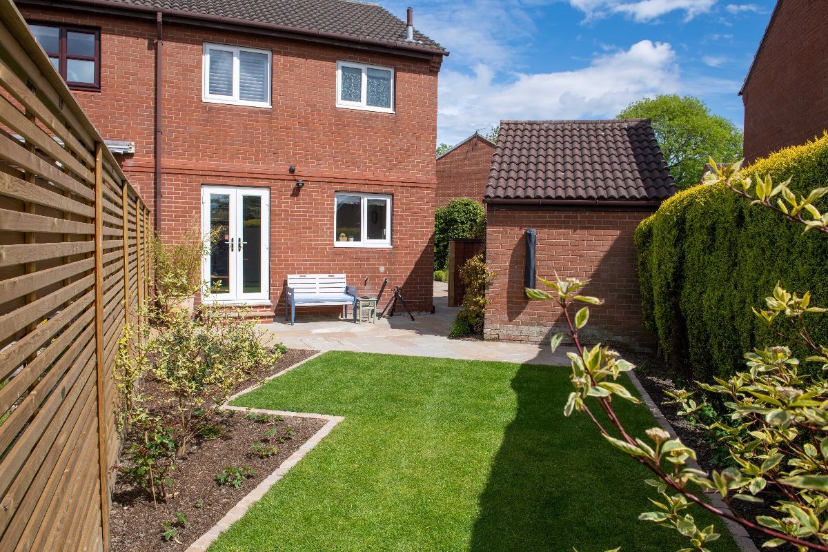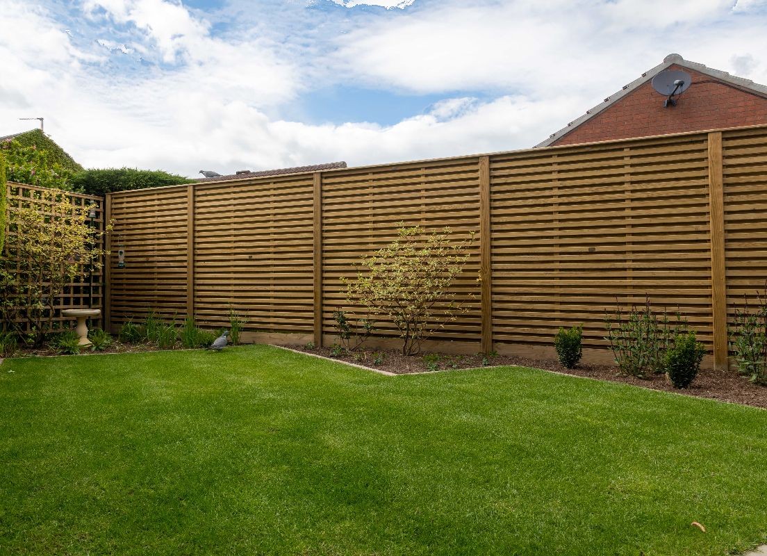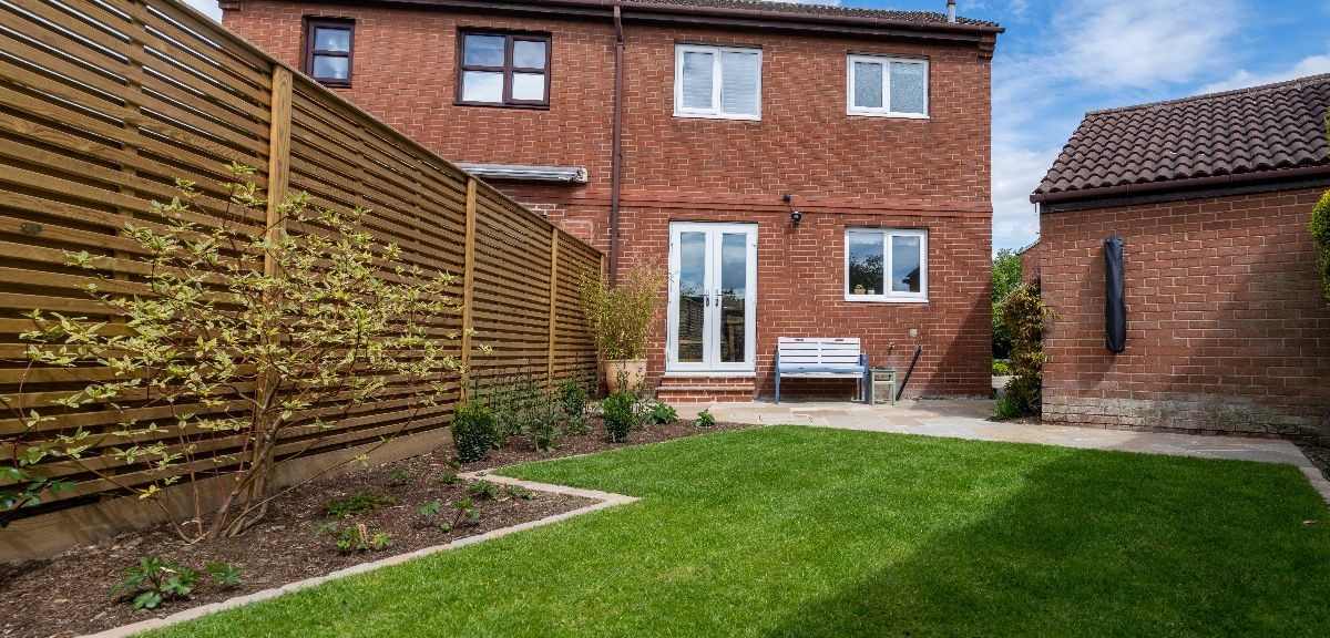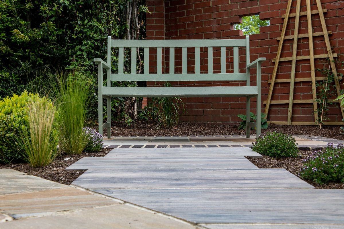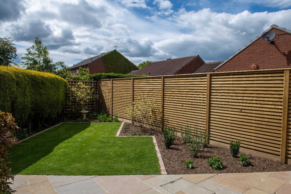 This garden uses Natural Paving Harvest to create geometric shapes broken up by planting areas. We constructed a bespoke bin store using Western Red Cedar cladding. The fencing used is the Venetian Hit-and-Miss panels and Jackposts provided by Jacksons Fencing.