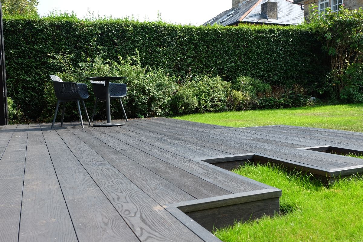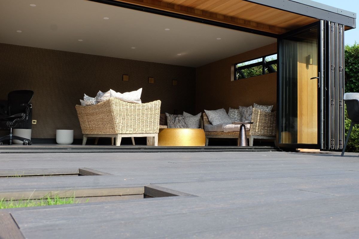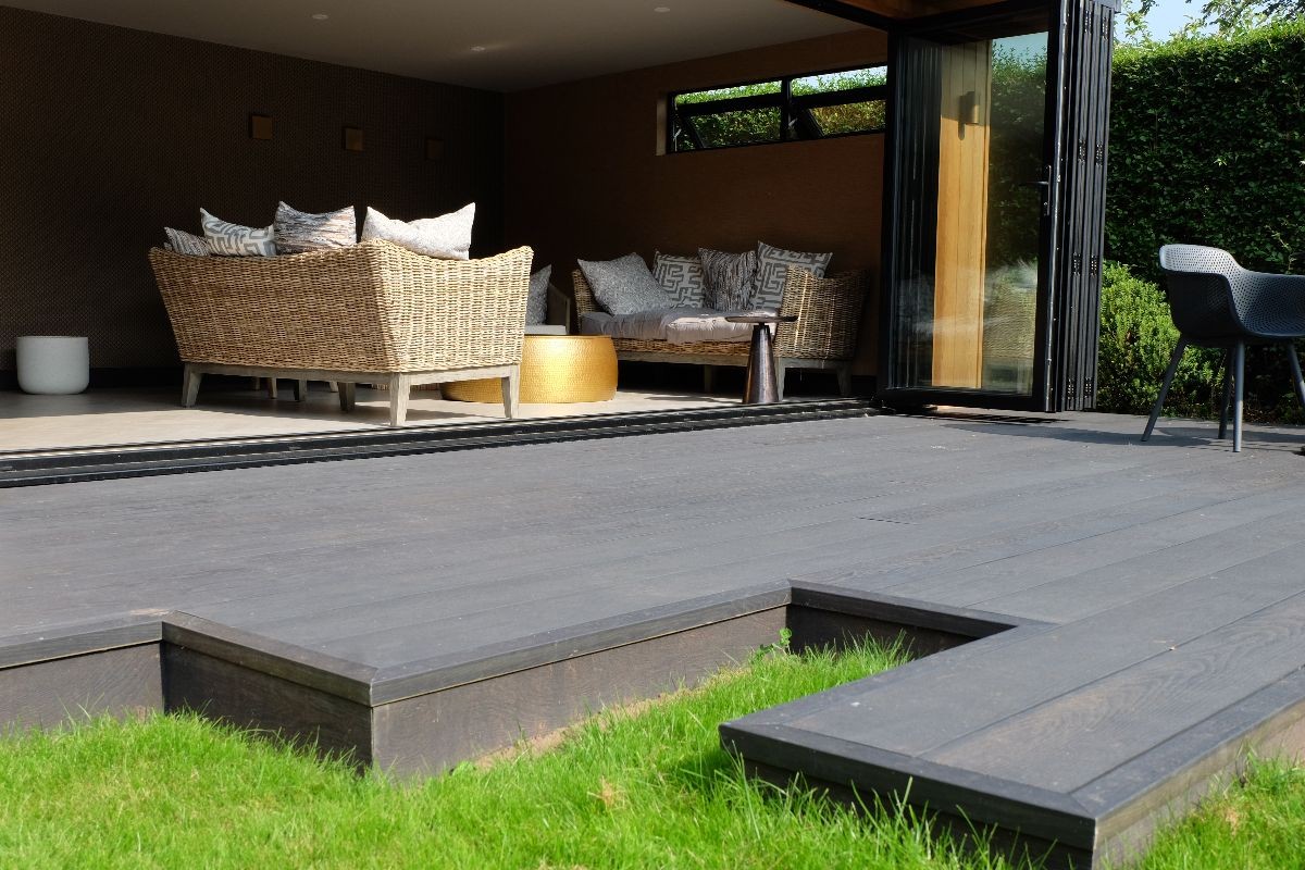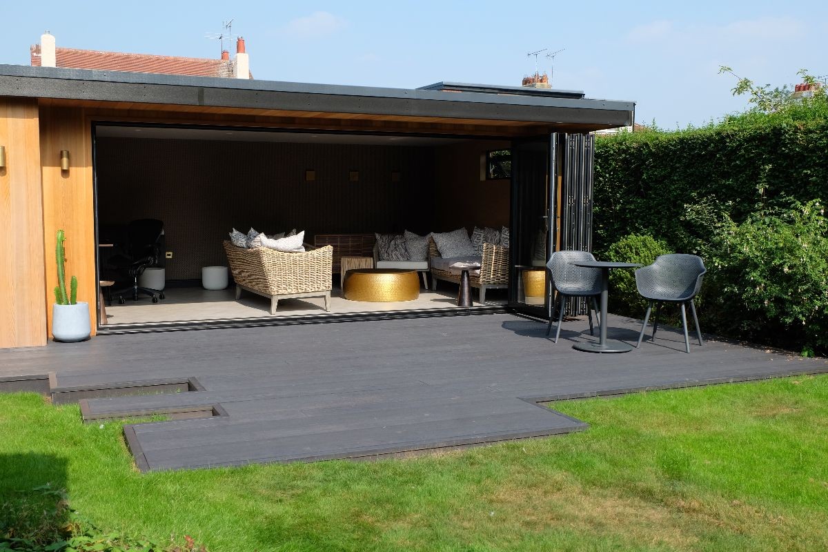 Our client wanted a contemporary decking area to complement their existing garden room. We built this deck using Ecoscape Forma Graphite composite decking. We built this so our client could walk directly from the garden room onto their new decking.