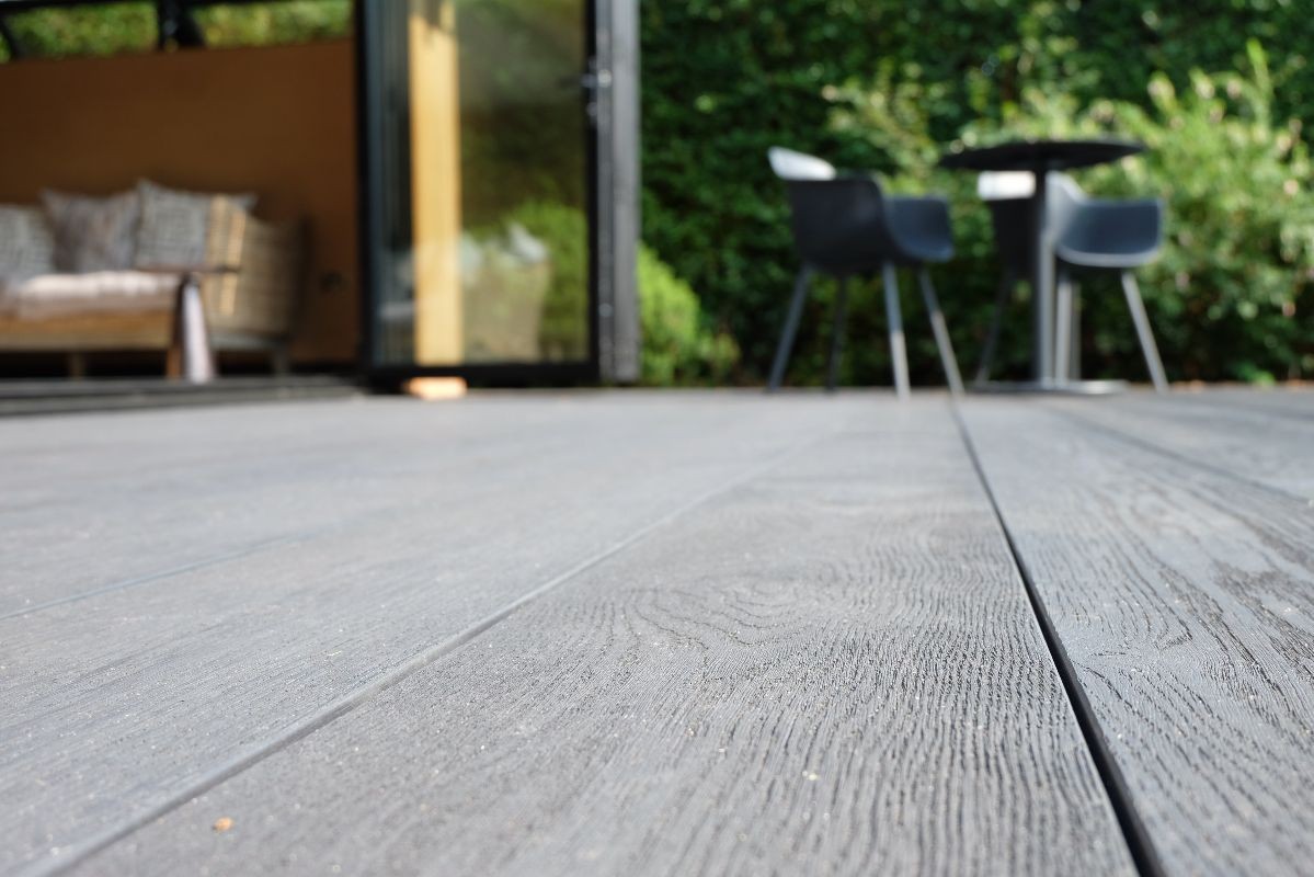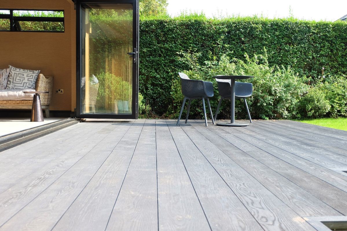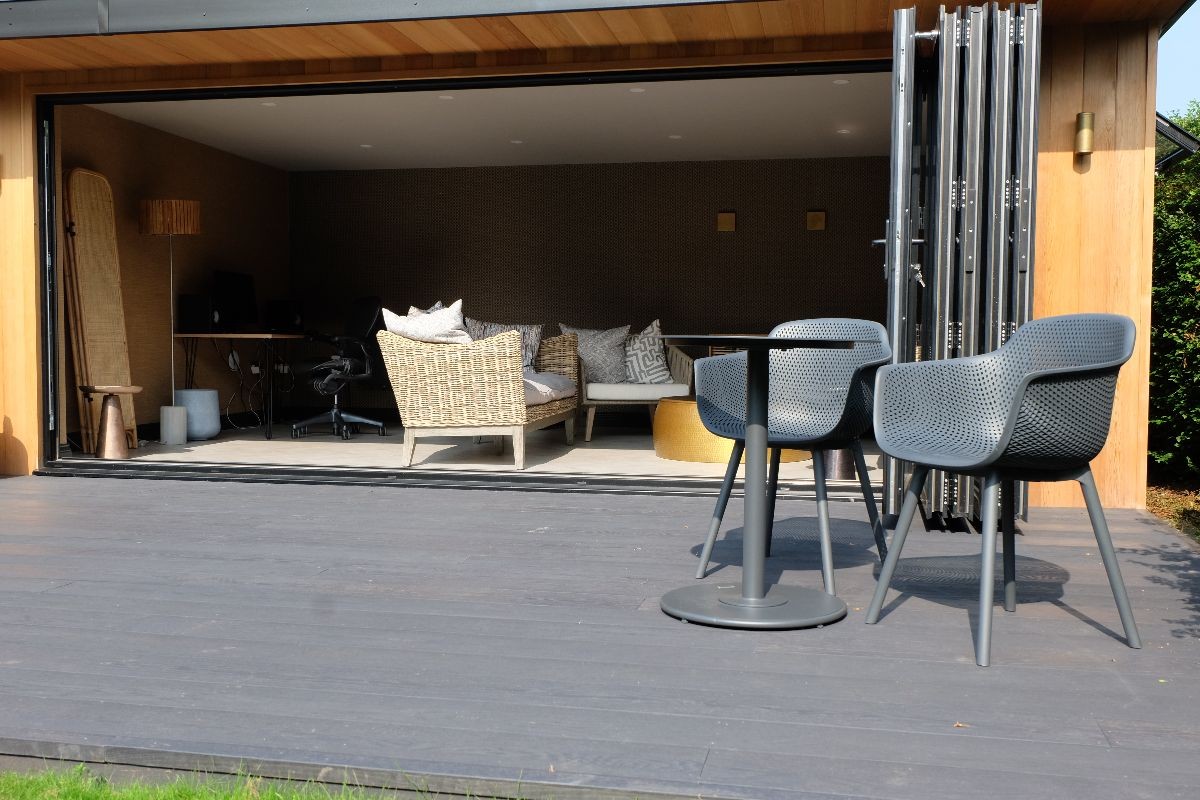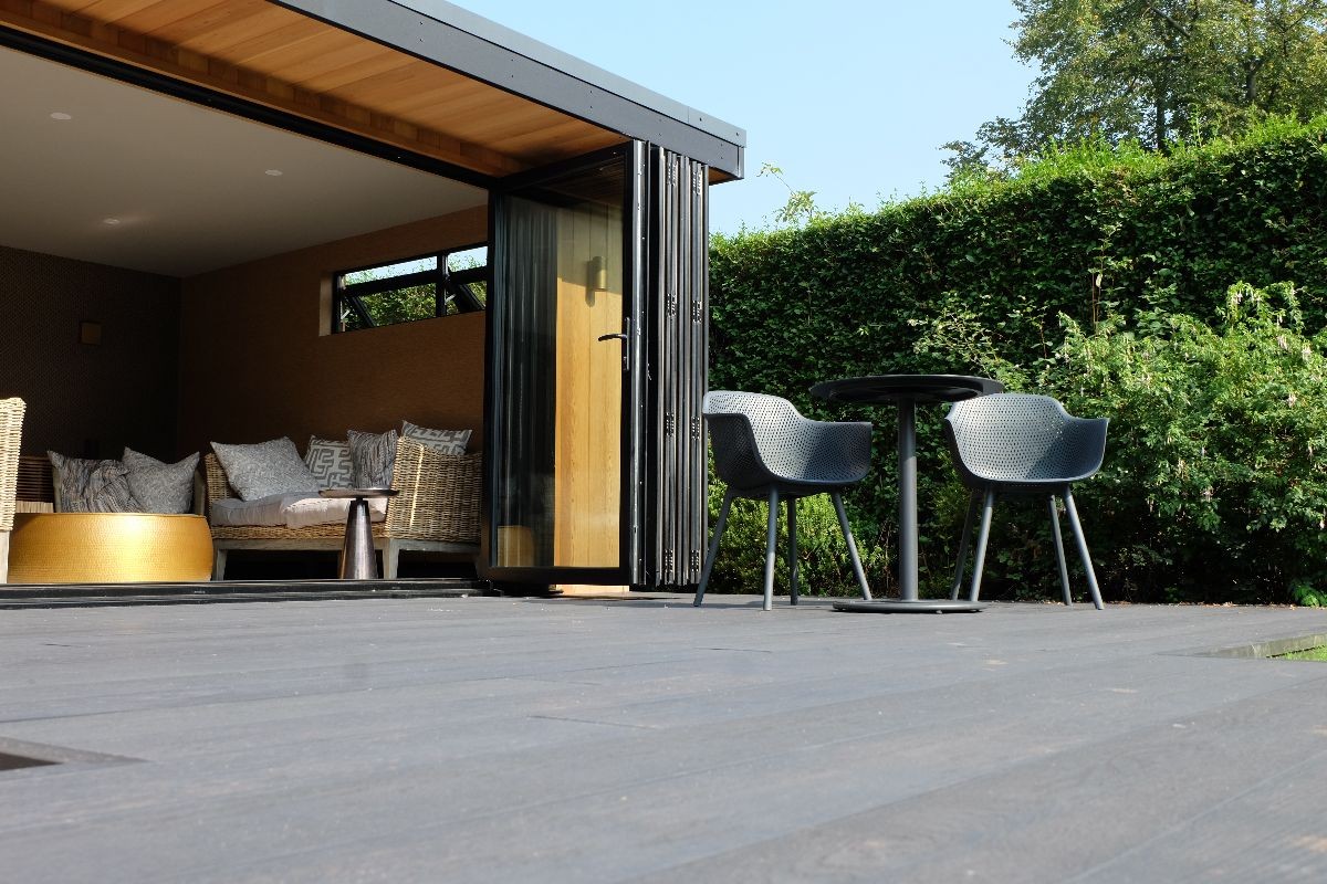 Our client wanted a contemporary decking area to complement their existing garden room. We built this deck using Ecoscape Forma Graphite composite decking. We built this so our client could walk directly from the garden room onto their new decking.