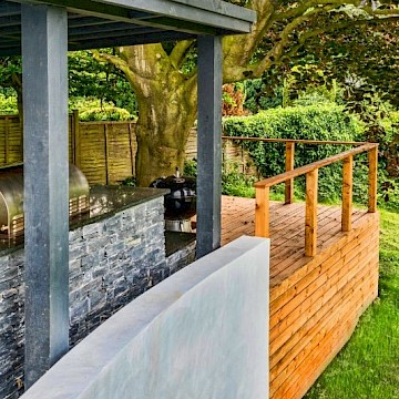 We installed an integrated barbecue and seating area, using Slate Cladding Panels and a granite worktop. As the client wanted an all-year-round space to use, we constructed a solid roof pergola so those barbecues could keep going even during the rain!