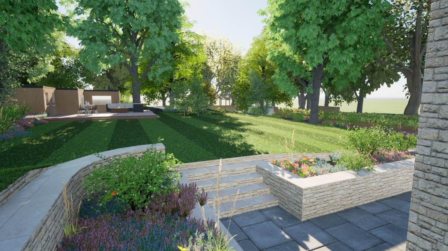 We designed the driveway, making it wider and thus easier for parking. The garden has a large lawn area, surrounded by a woodland garden with a winding pathway leading to a summerhouse. The garden room is designed to have a "cabin in the woods" feel, which will house an gym and bar. Outside the garden room is a large composite decking area which is a brilliant space for entertaining and relaxing.