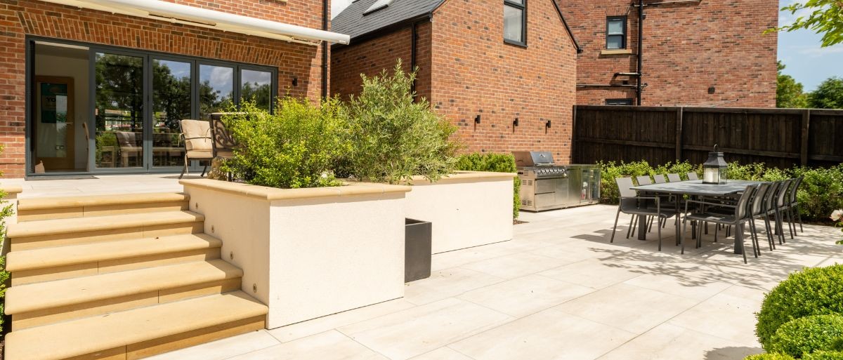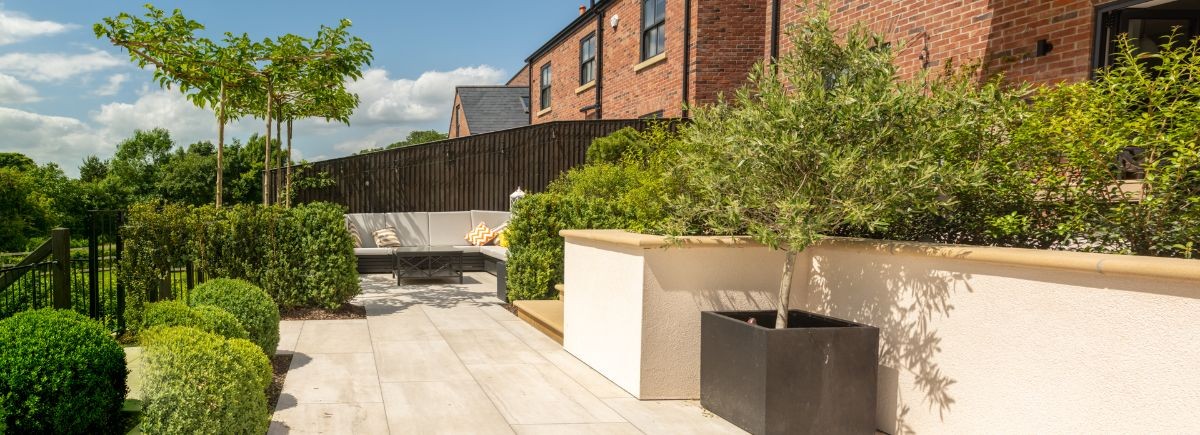 Garden designer Kit Peel designed an attractive two-tier garden that used sandstone and large shrubs. We coordinated the landscaping construction, the lighting and planting of the trees.