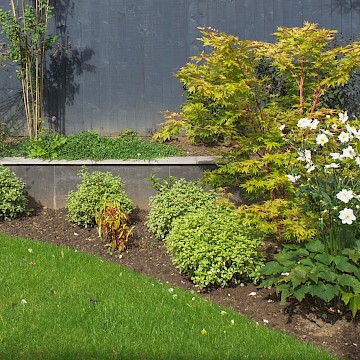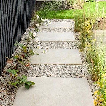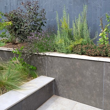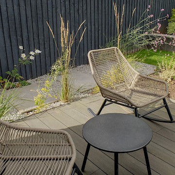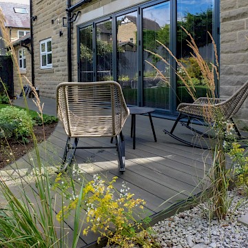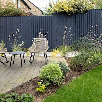 This client’s garden was left in a poor state after their home renovation, making the space unusable. Designer Camilla Grayley created a thoughtful layout featuring three key zones: a patio, a composite decking area extending from the French doors, and an oval-shaped lawn. The planting design helped soften the hard landscaping elements while adding privacy from neighboring properties.
