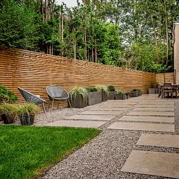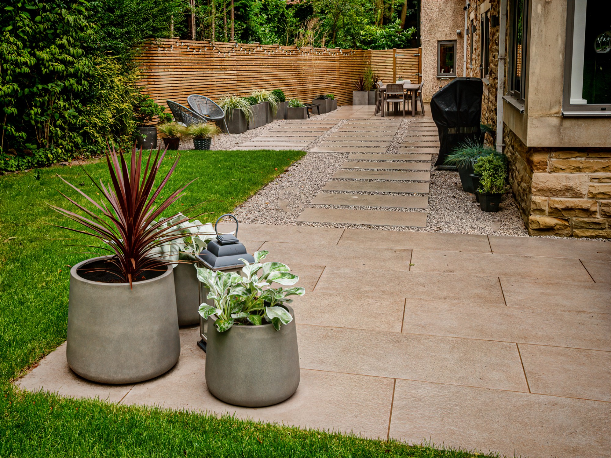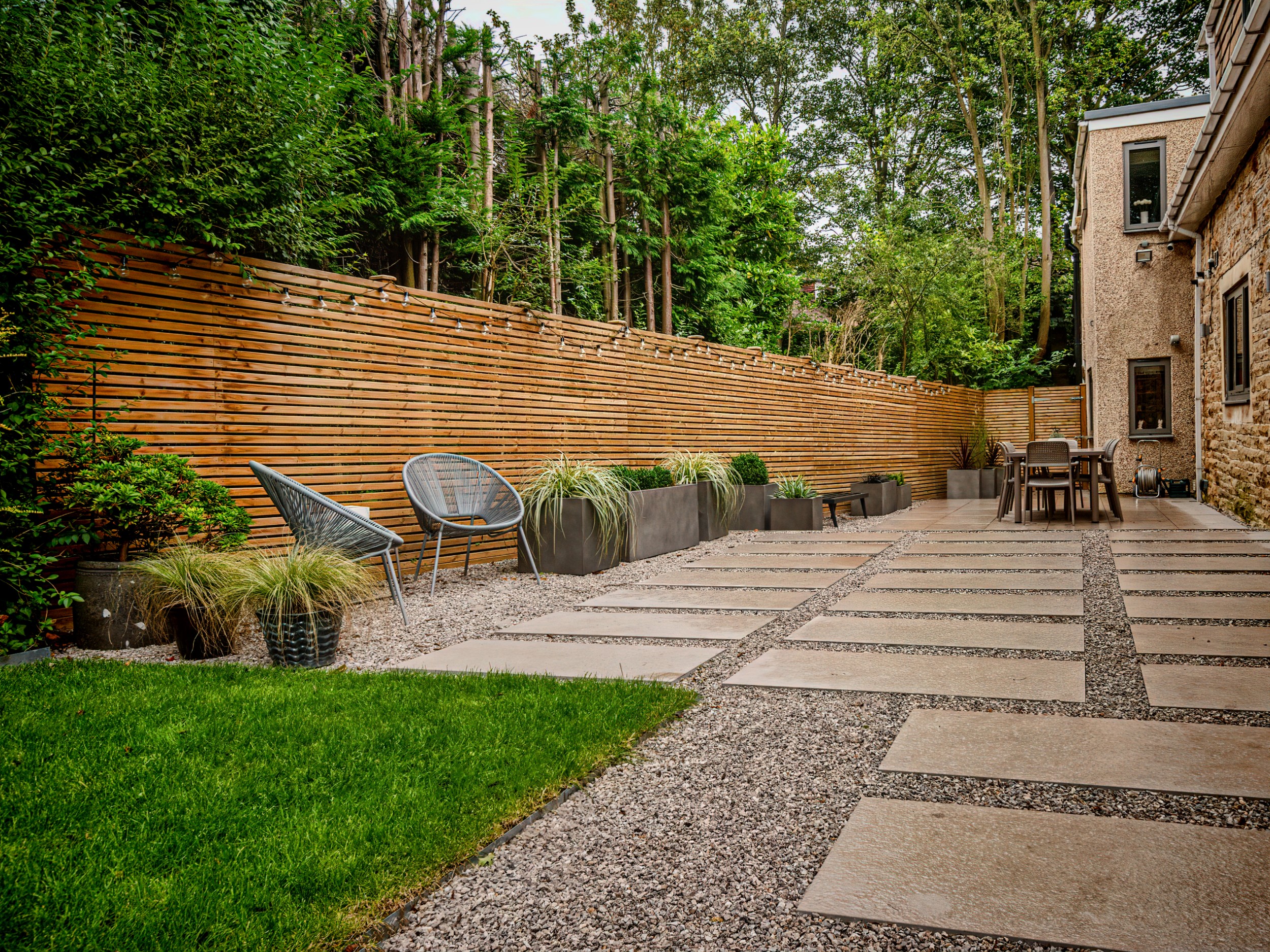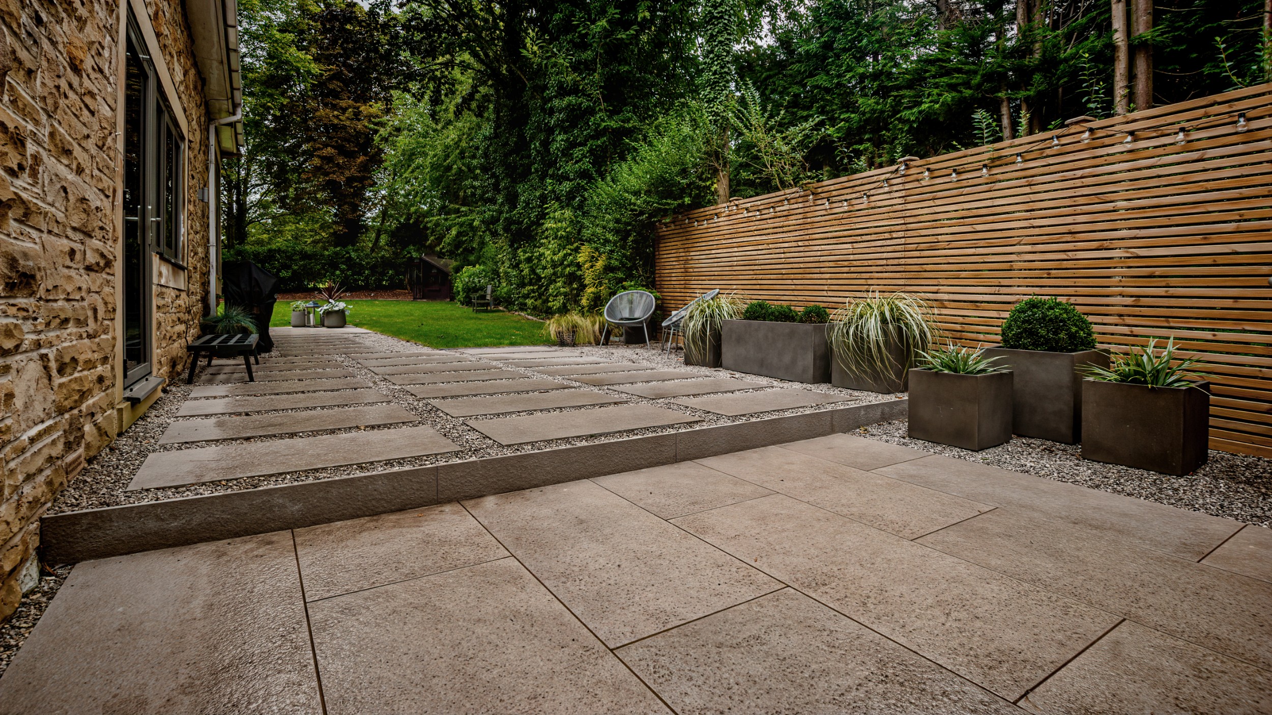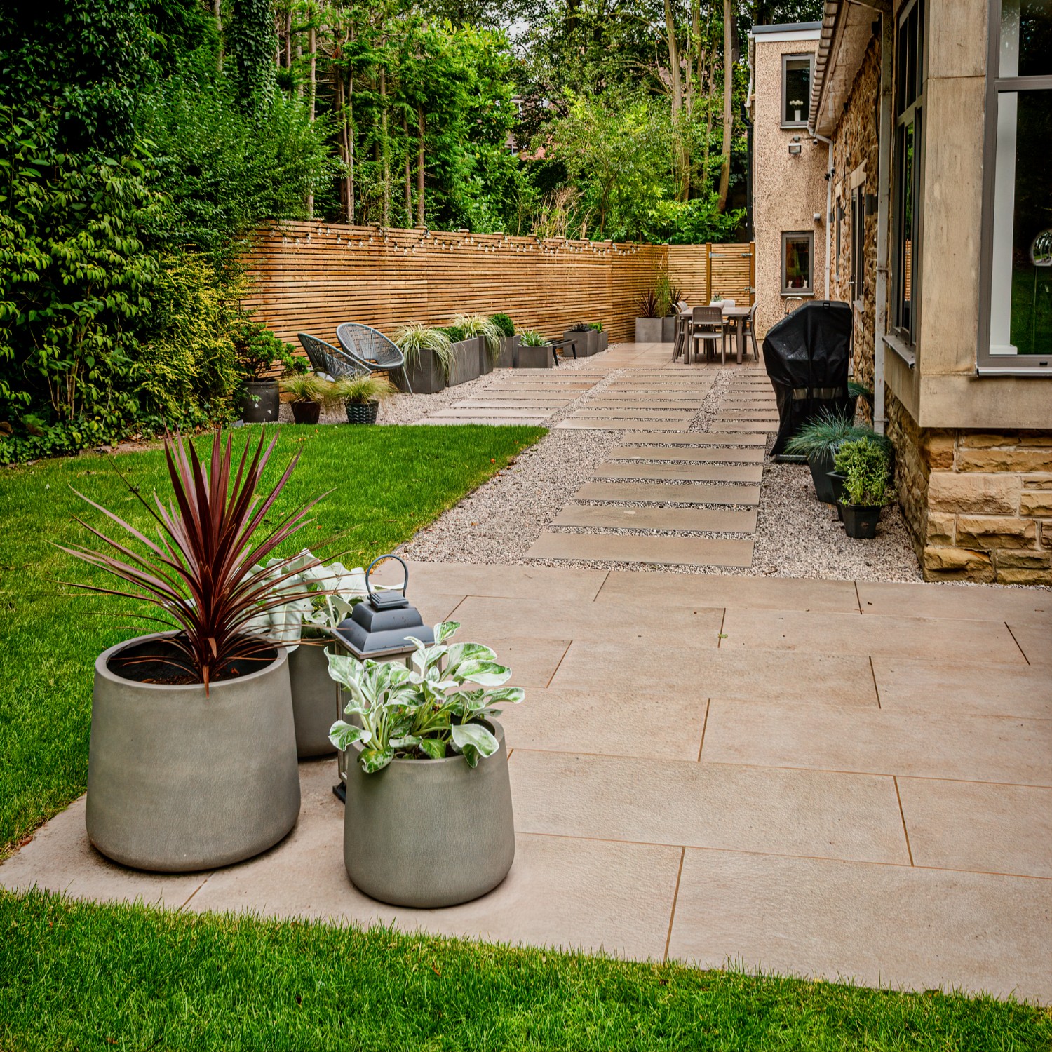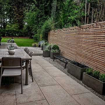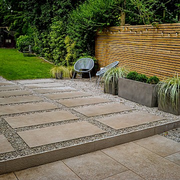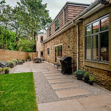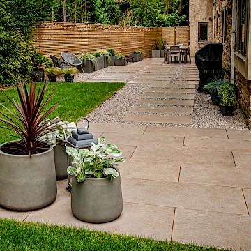 In this project, we created a garden that carefully balances traditional character with contemporary style. The design complements the sandstone exterior of the house while reflecting the clean lines of its modern windows. A porcelain patio forms the main seating area, with matching stepping stones set within gravel to add texture and flow. Venetian-style fencing frames the space, providing structure and a distinctive finishing touch.