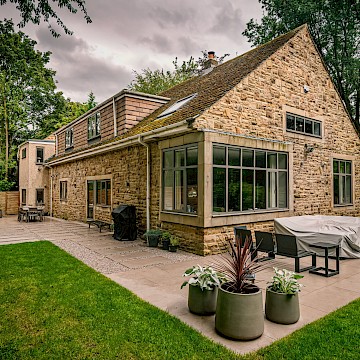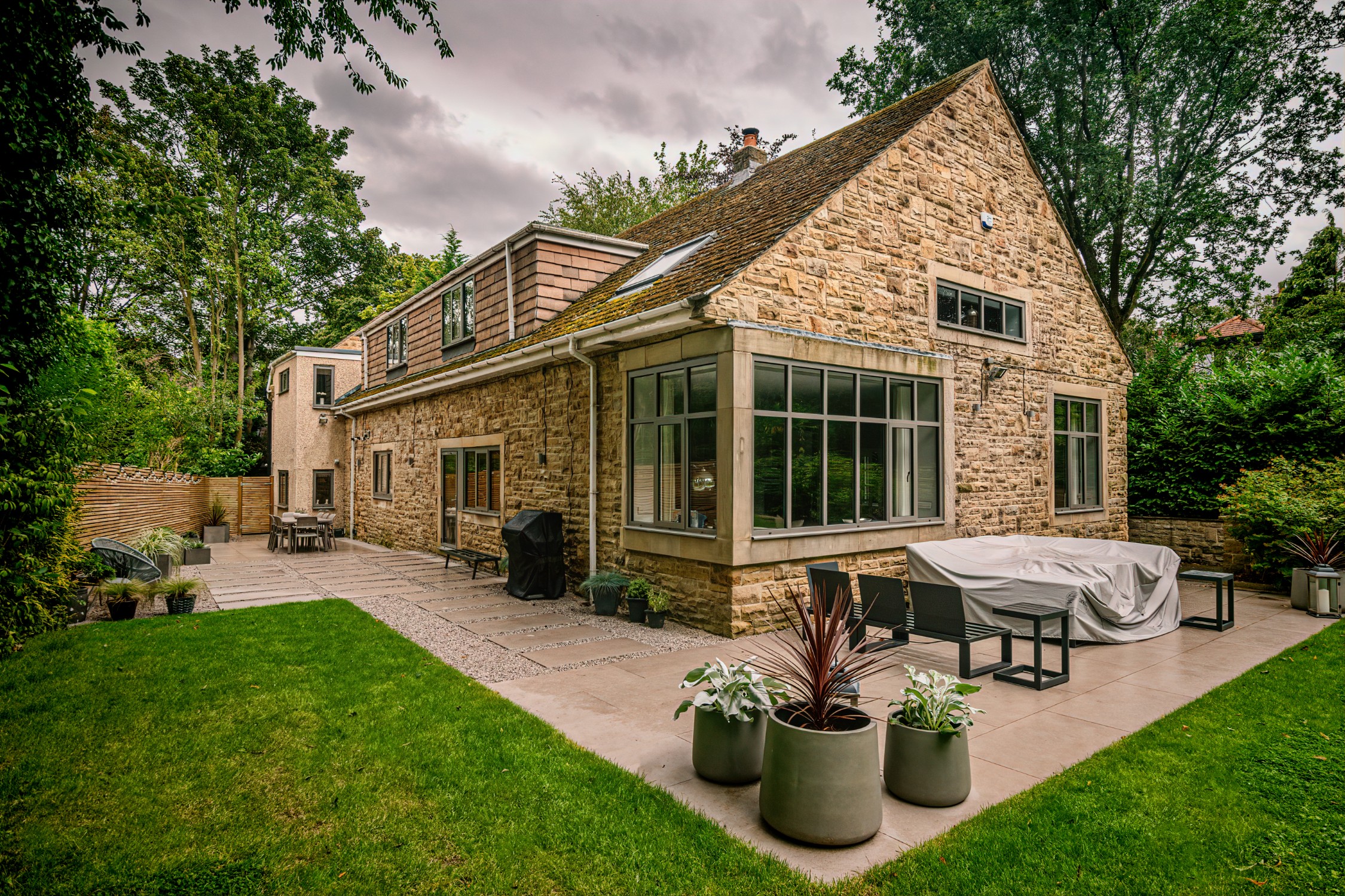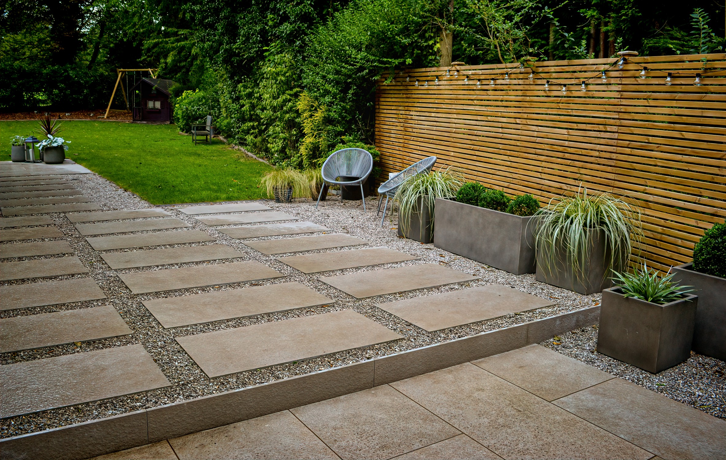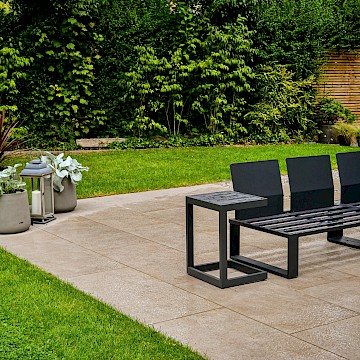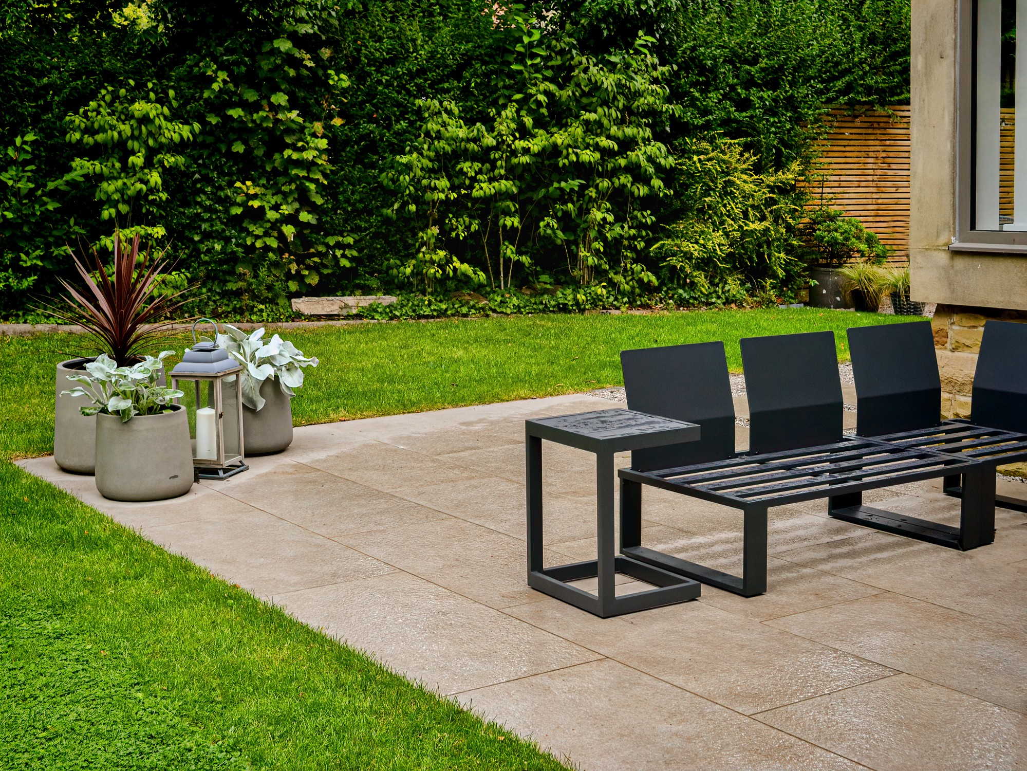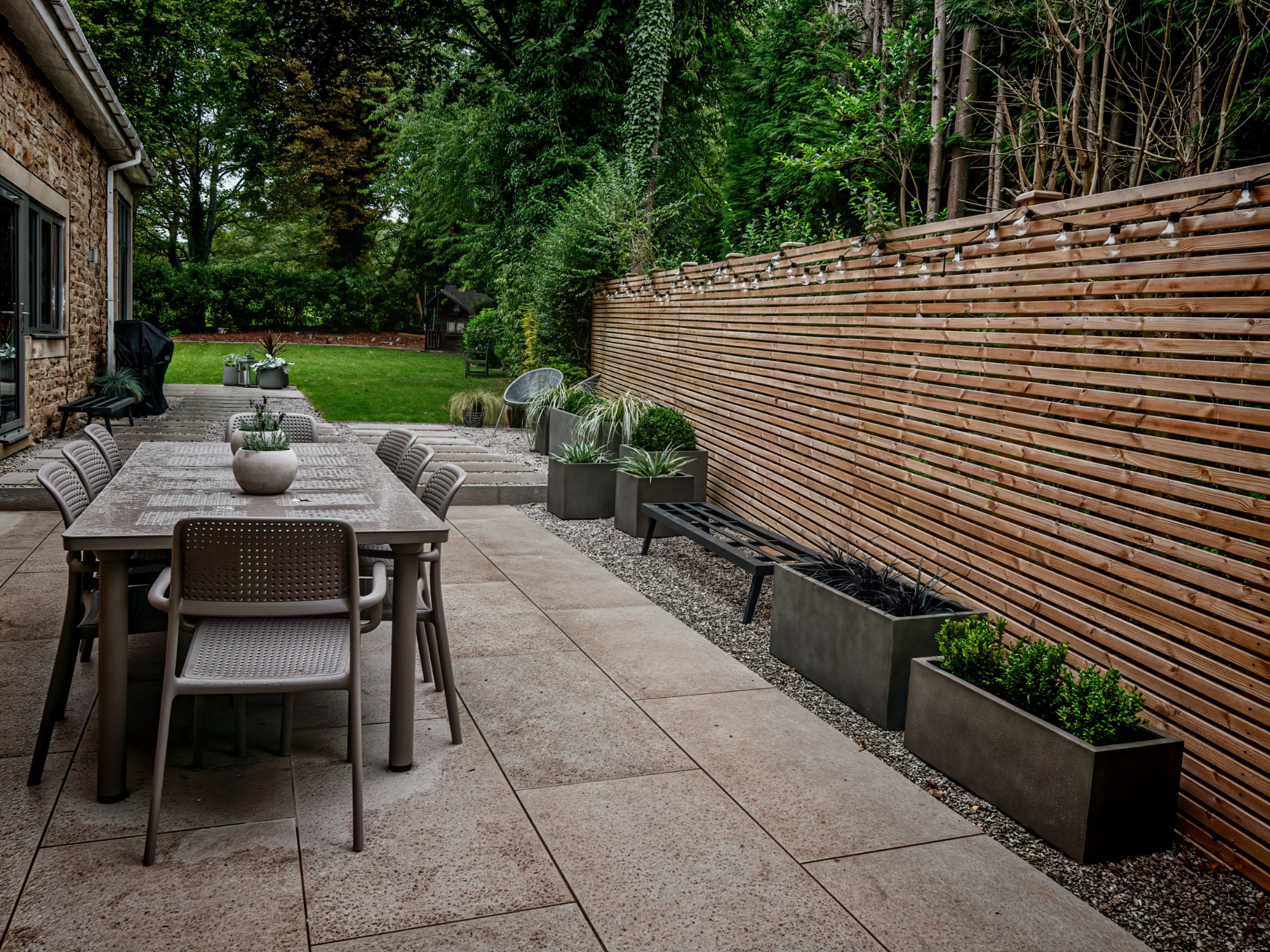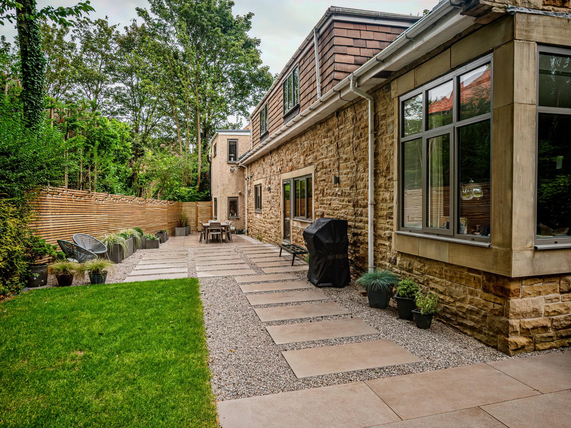 In this project, we created a garden that carefully balances traditional character with contemporary style. The design complements the sandstone exterior of the house while reflecting the clean lines of its modern windows. A porcelain patio forms the main seating area, with matching stepping stones set within gravel to add texture and flow. Venetian-style fencing frames the space, providing structure and a distinctive finishing touch.