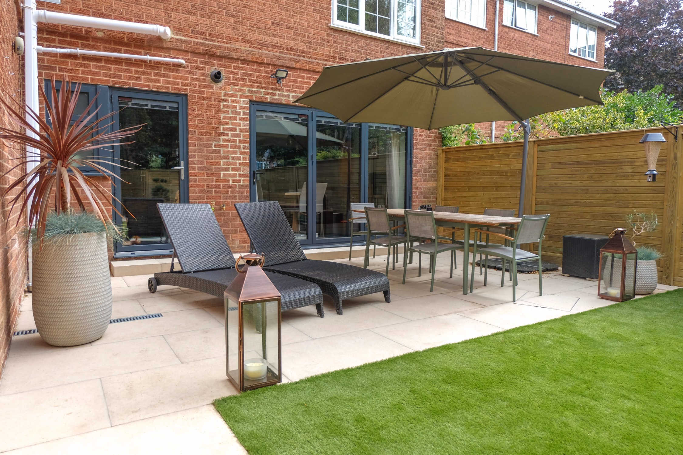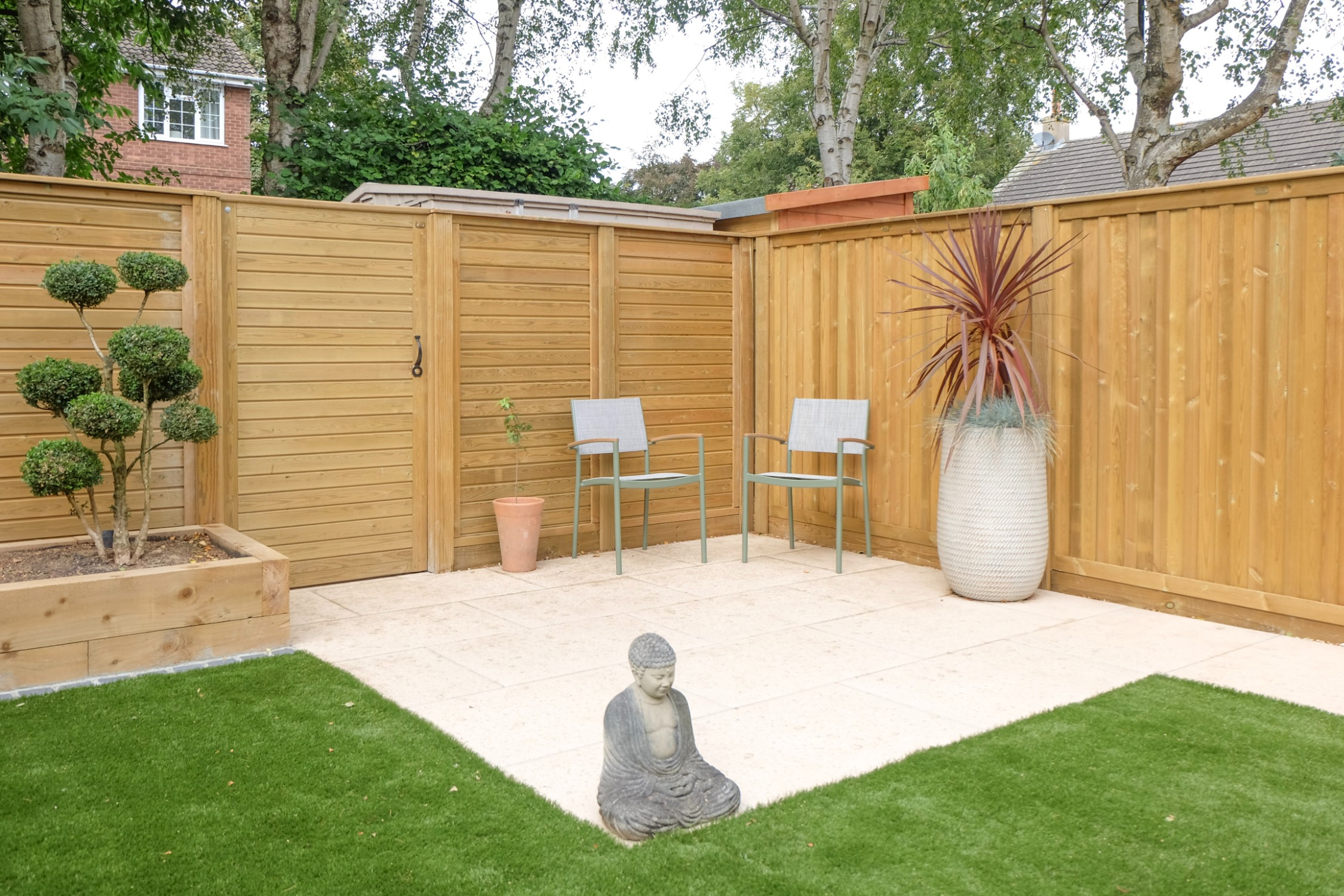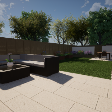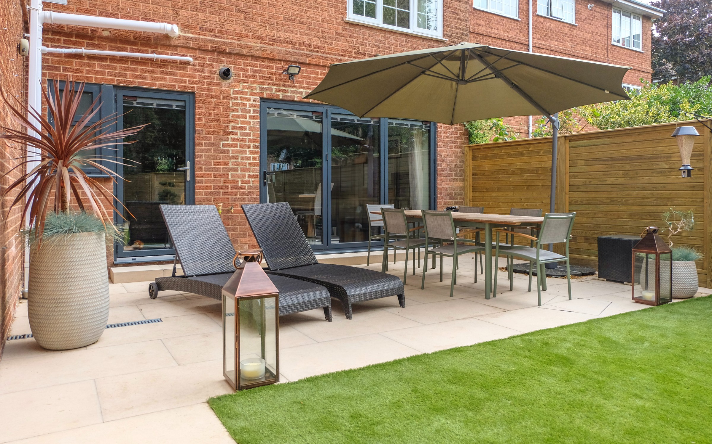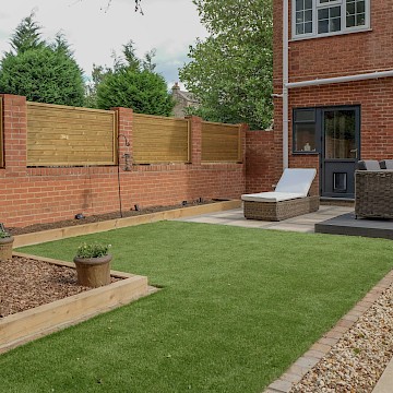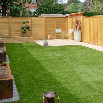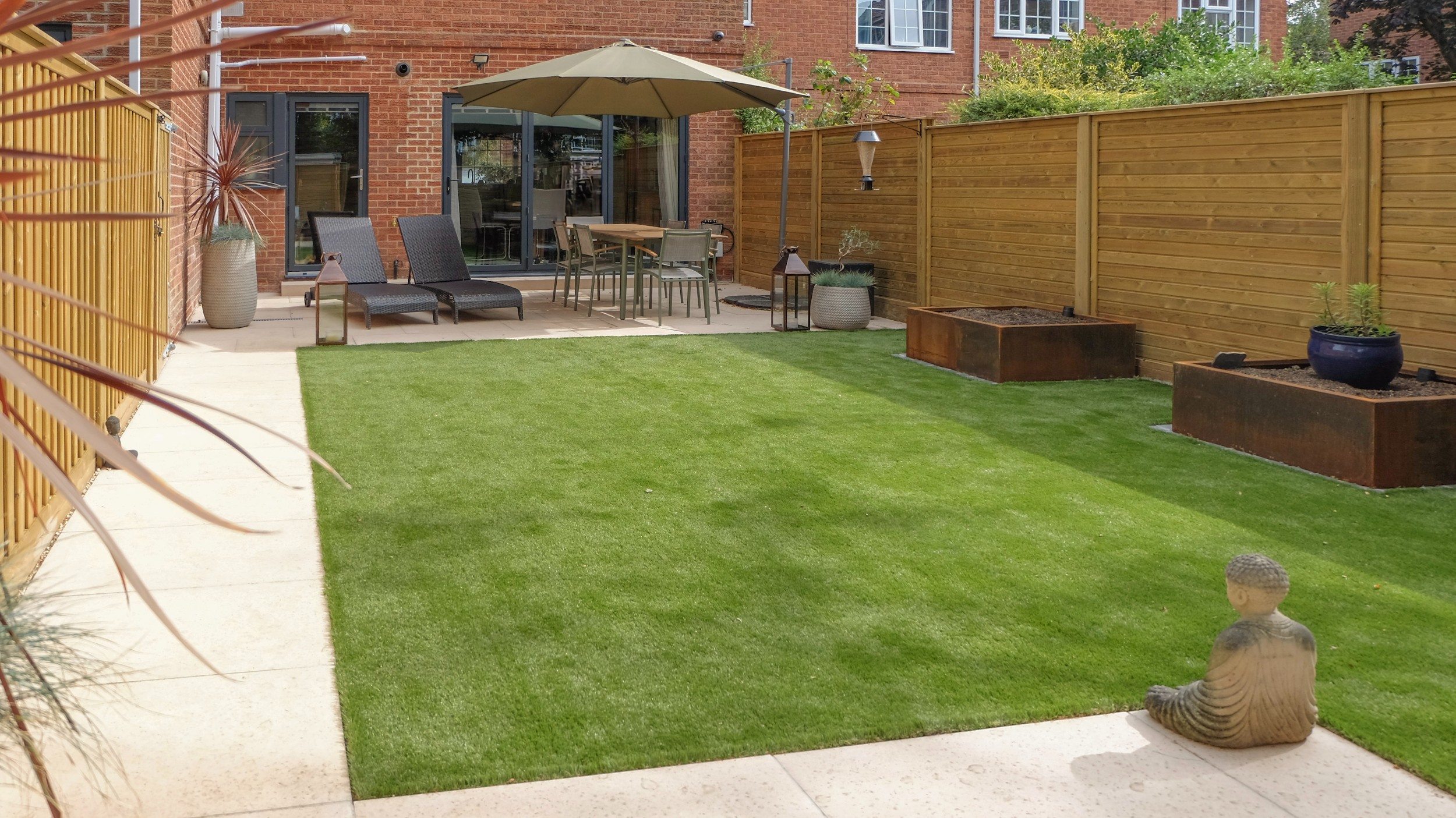 Our client wanted a minimal, easy-to-maintain garden that would also function well for entertaining. We streamlined the layout by creating a spacious patio for outdoor dining, paired with an artificial lawn and sawn sandstone paving for a clean, modern look.