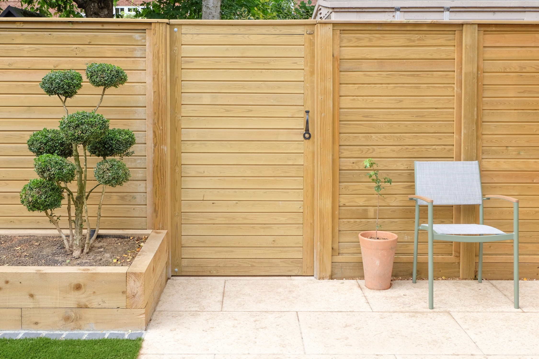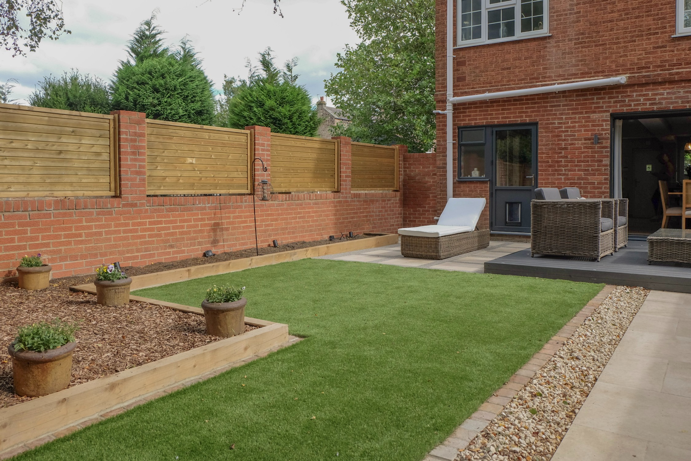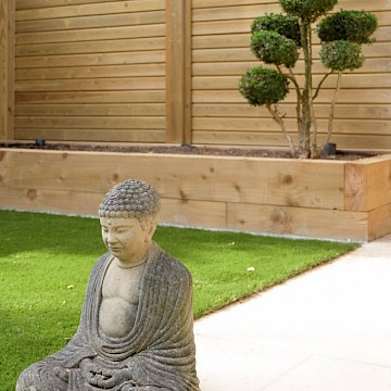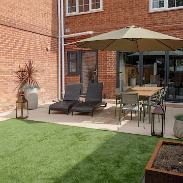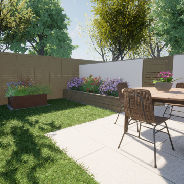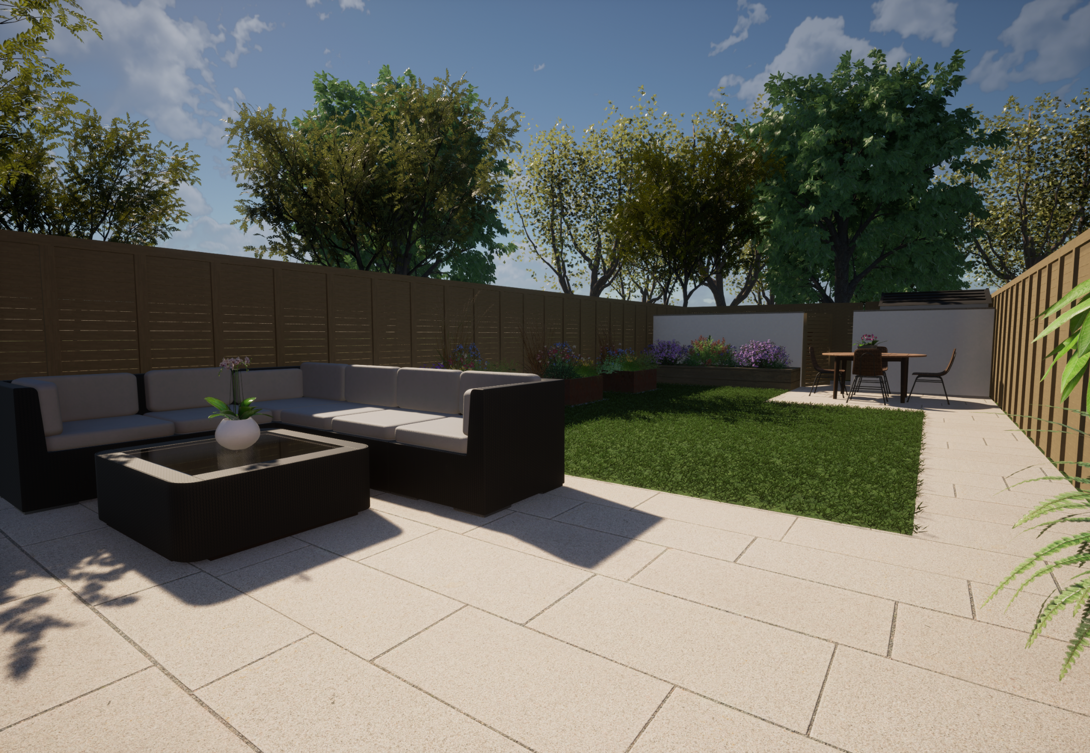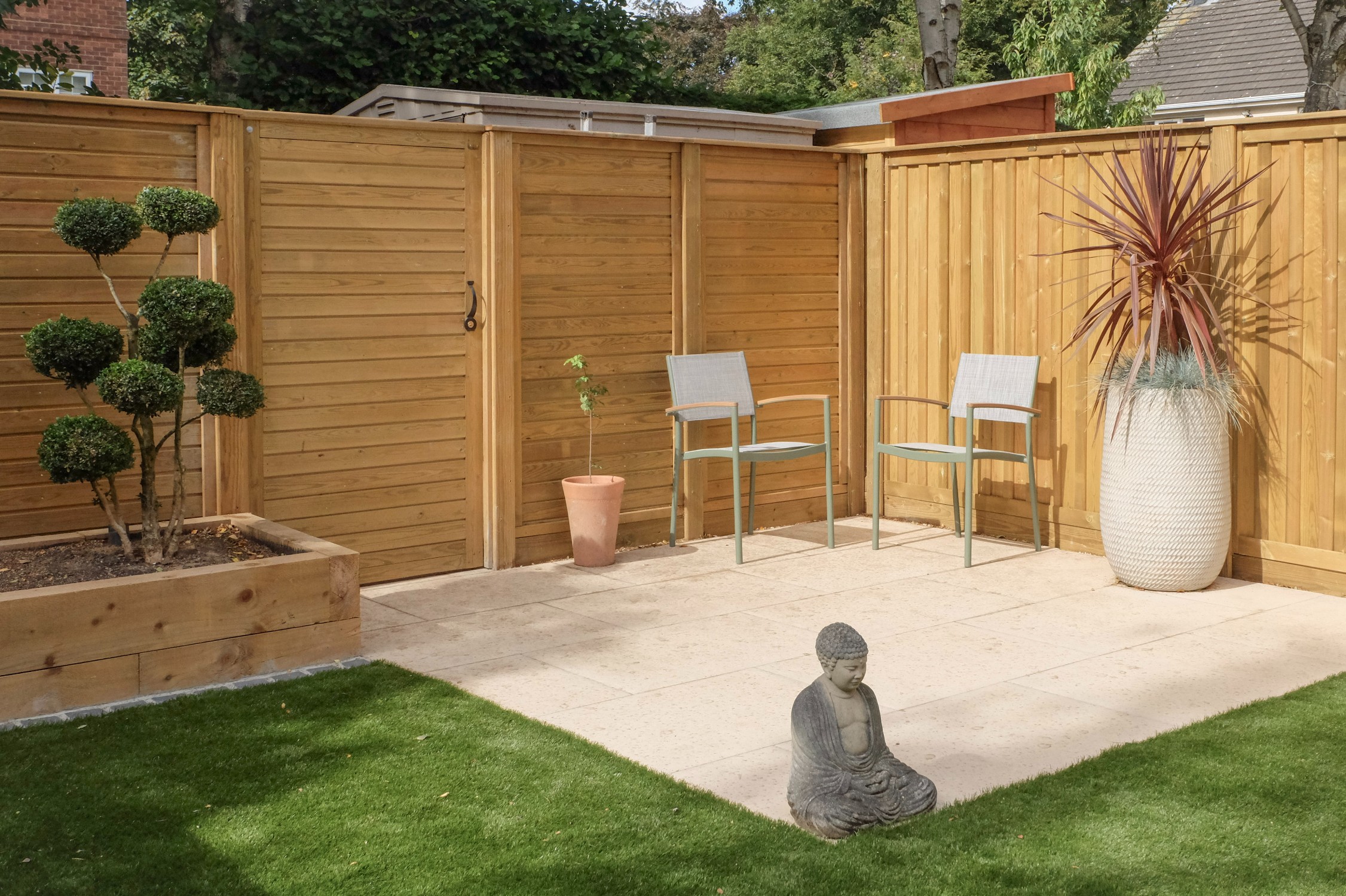 Our client wanted a minimal, easy-to-maintain garden that would also function well for entertaining. We streamlined the layout by creating a spacious patio for outdoor dining, paired with an artificial lawn and sawn sandstone paving for a clean, modern look.