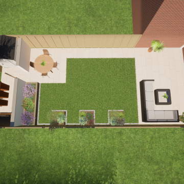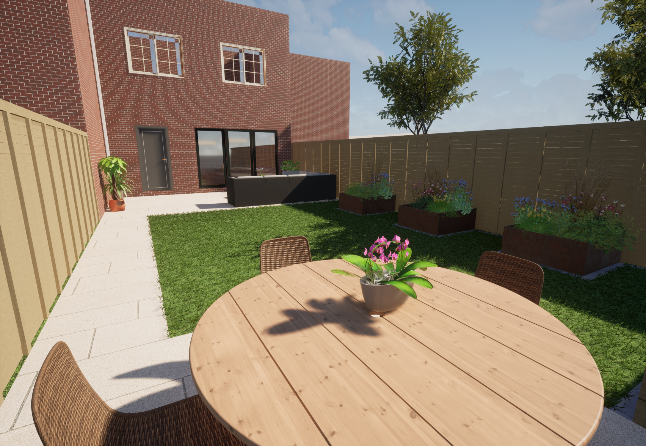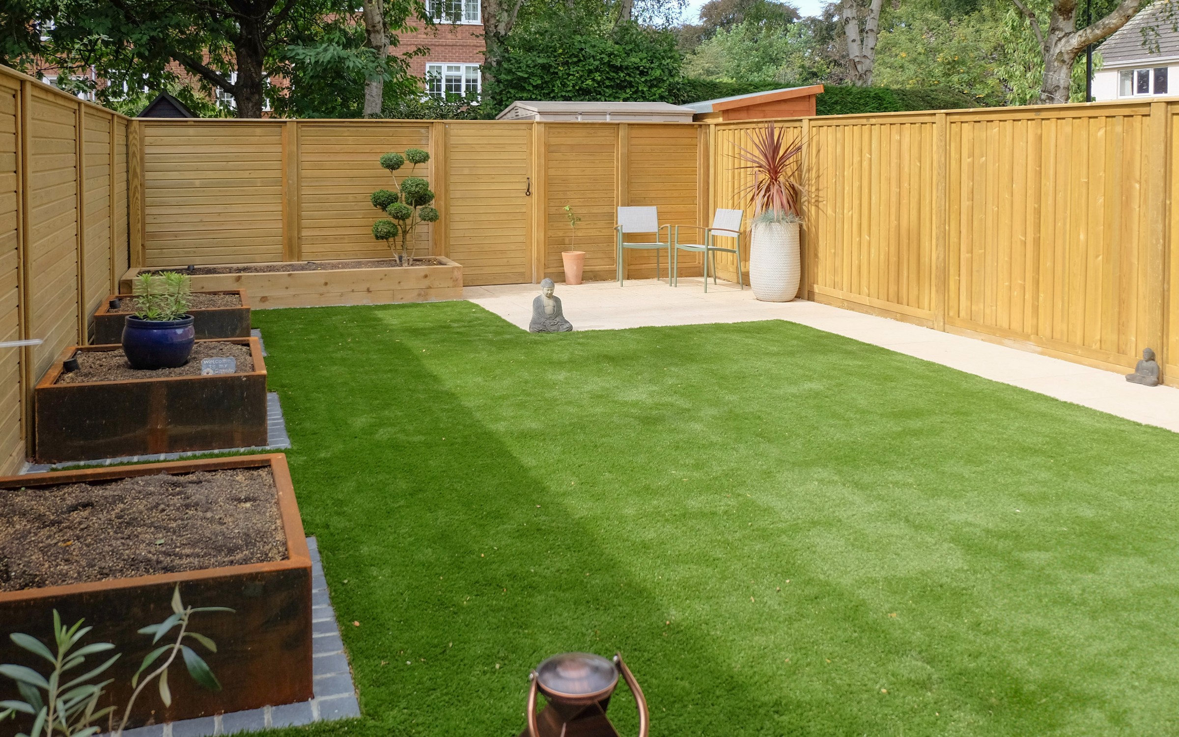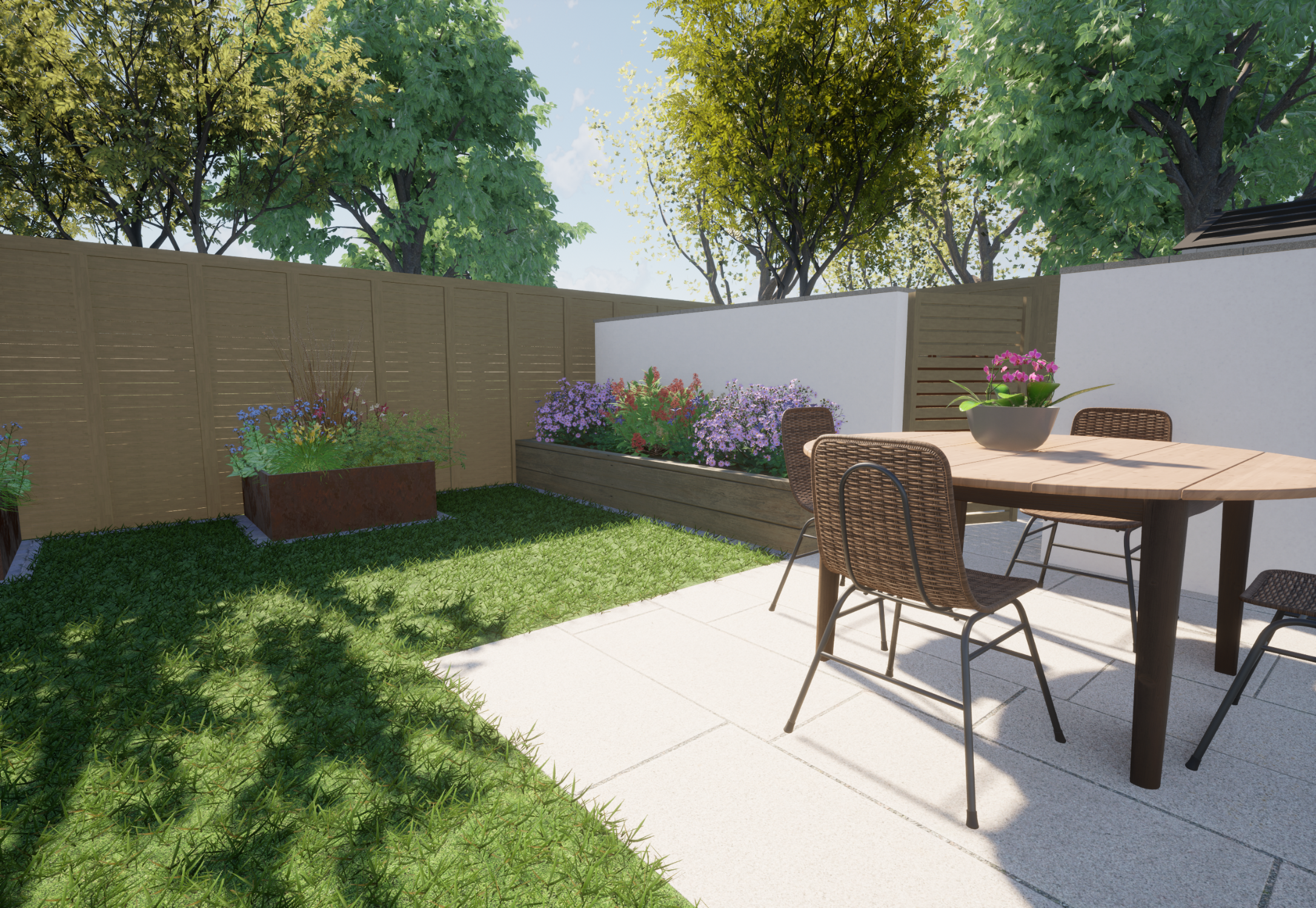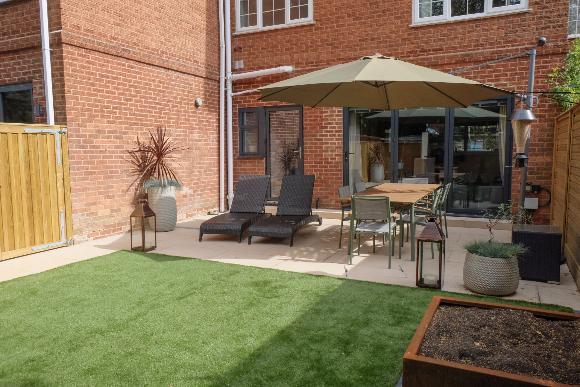 Our client wanted a minimal, easy-to-maintain garden that would also function well for entertaining. We streamlined the layout by creating a spacious patio for outdoor dining, paired with an artificial lawn and sawn sandstone paving for a clean, modern look.