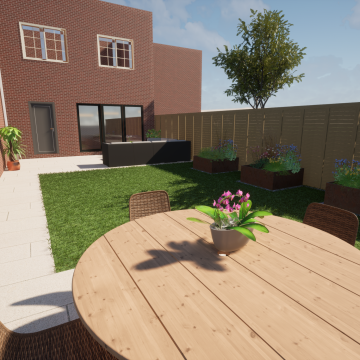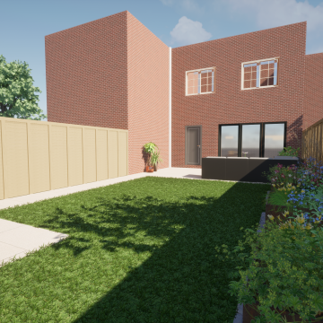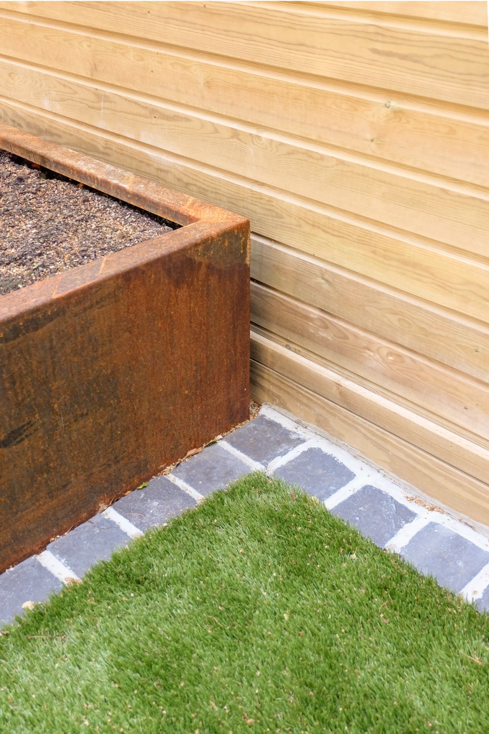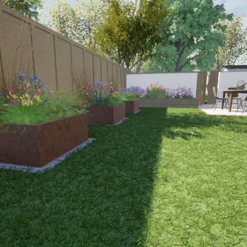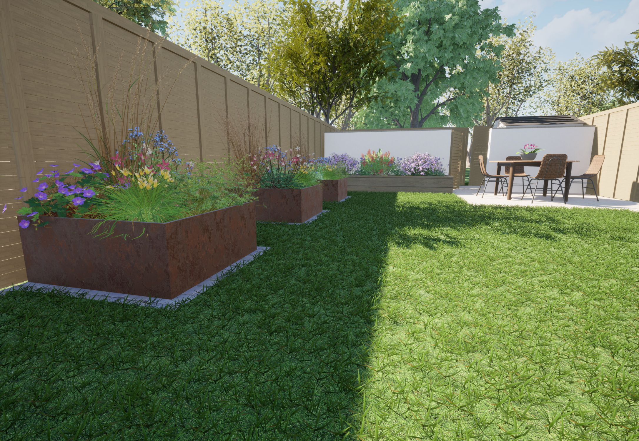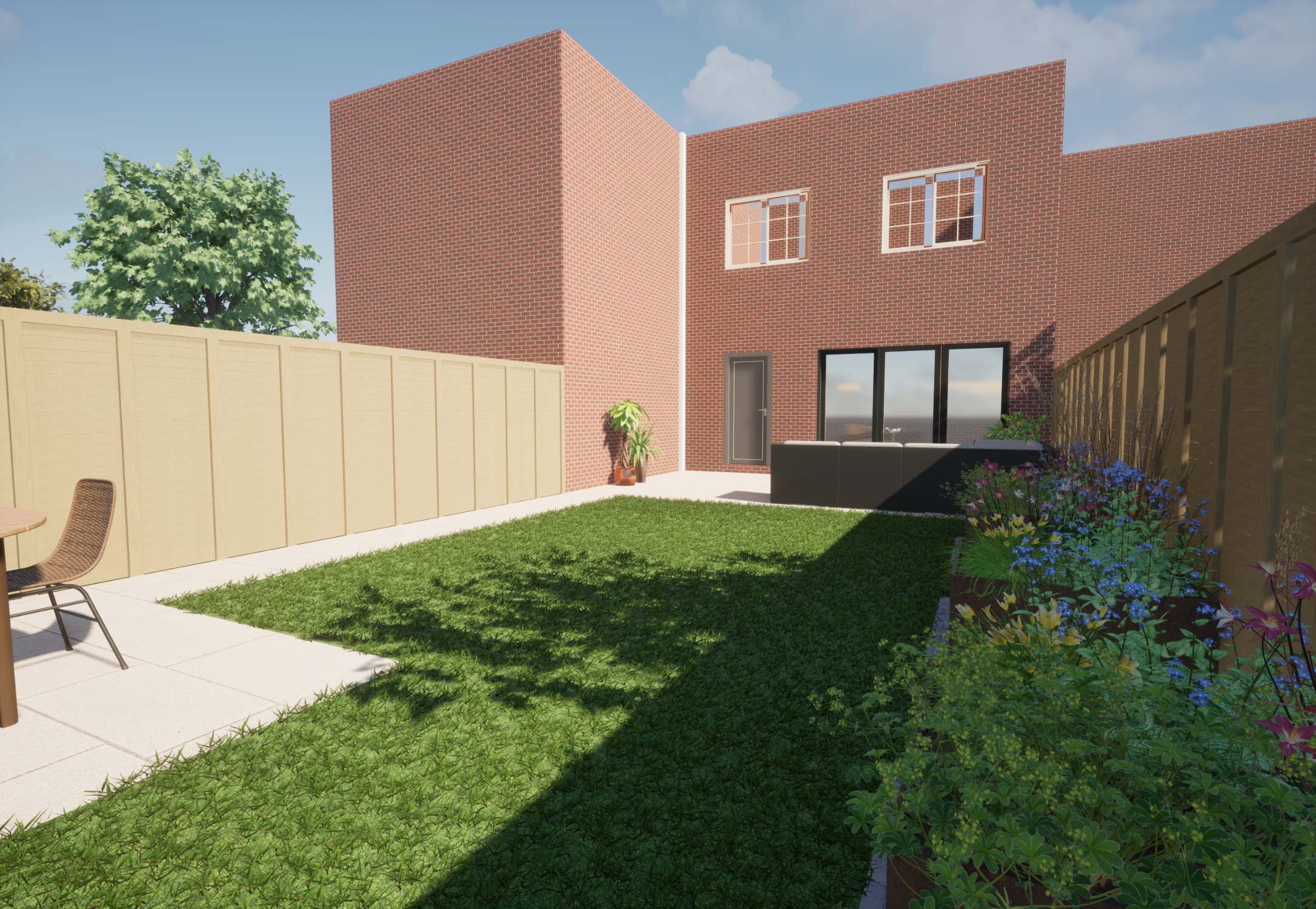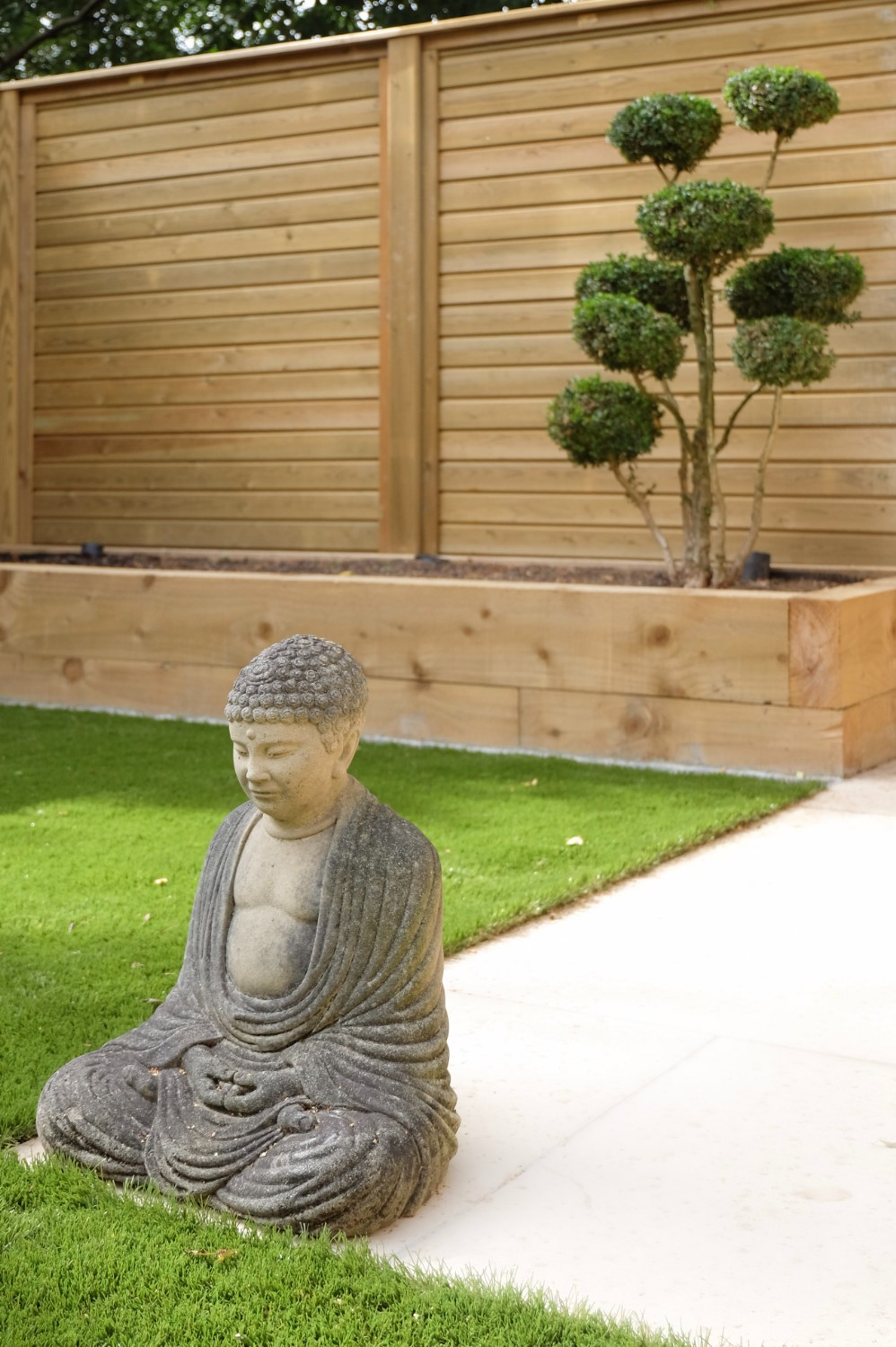 Our client wanted a minimal, easy-to-maintain garden that would also function well for entertaining. We streamlined the layout by creating a spacious patio for outdoor dining, paired with an artificial lawn and sawn sandstone paving for a clean, modern look.