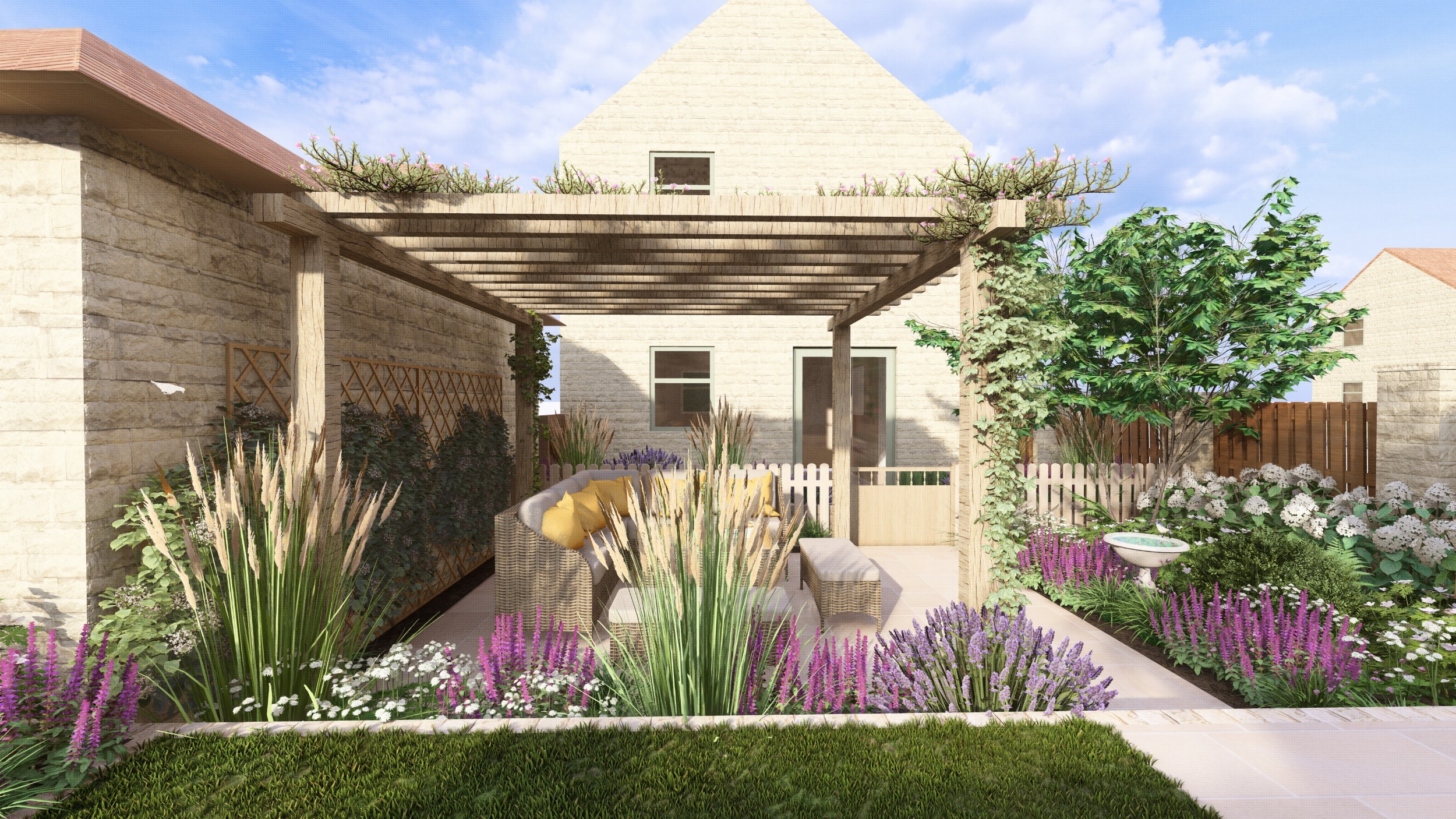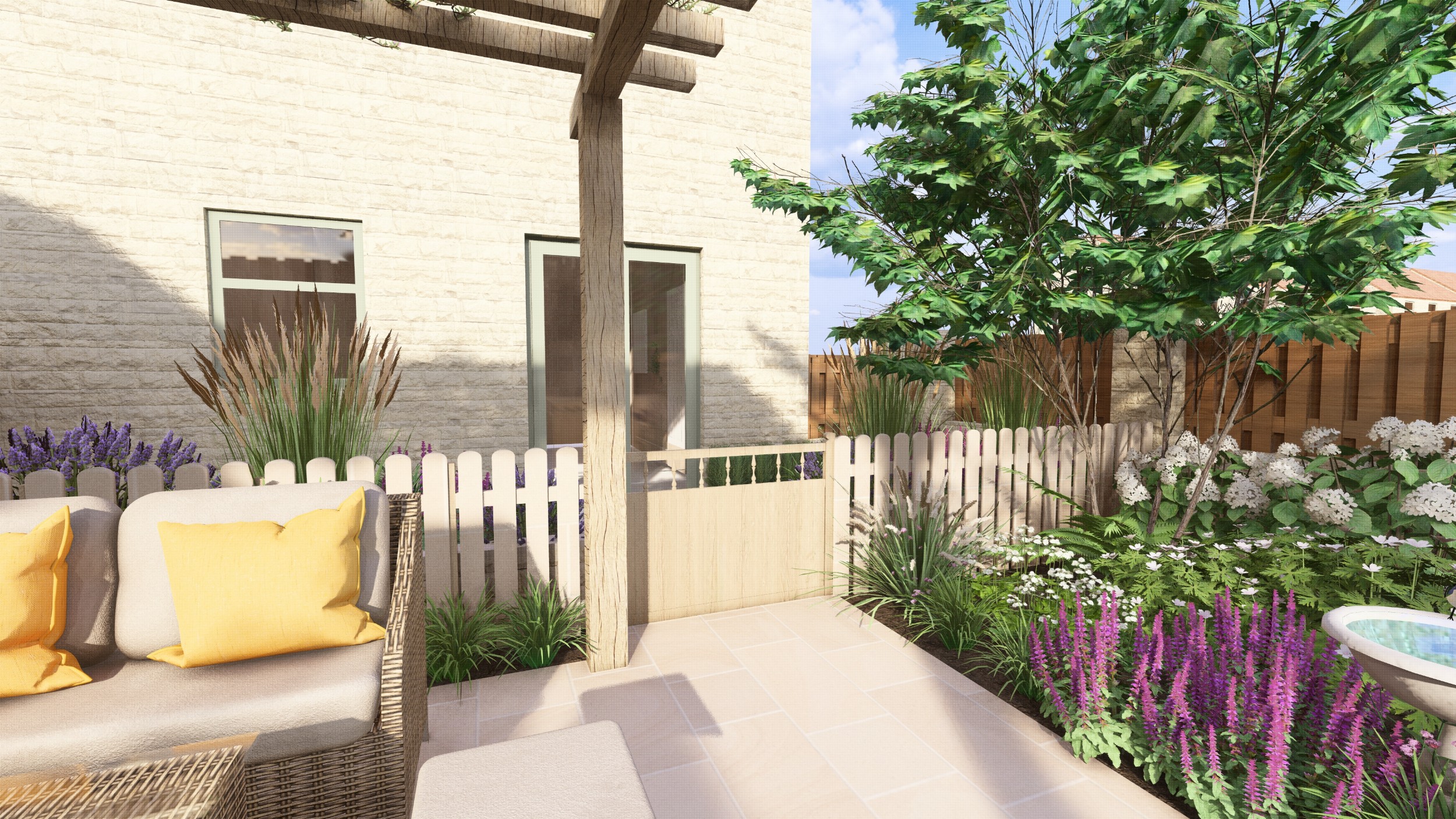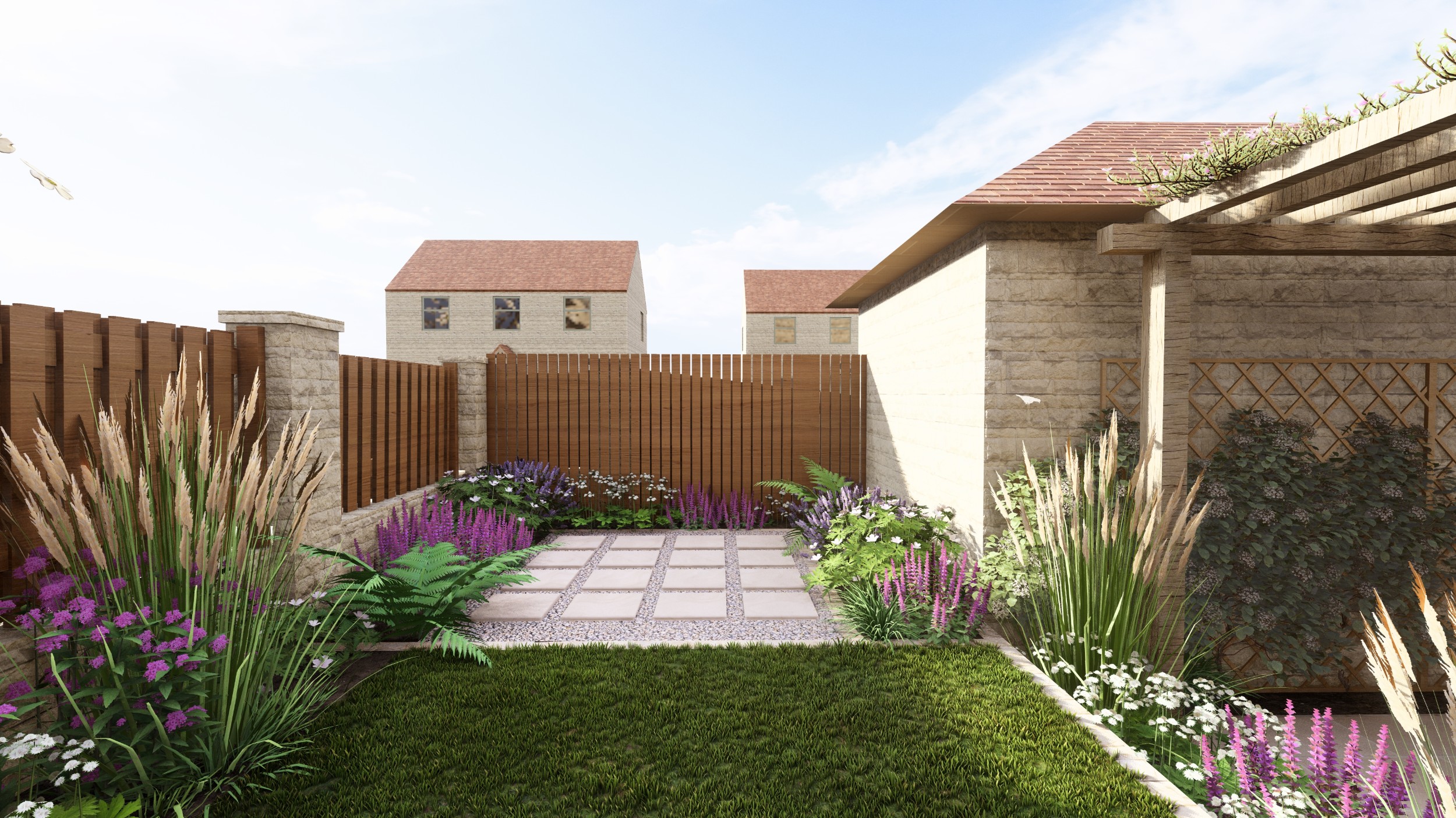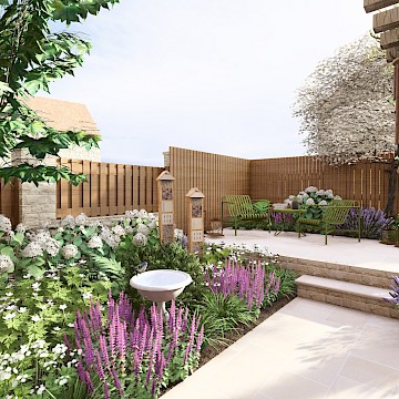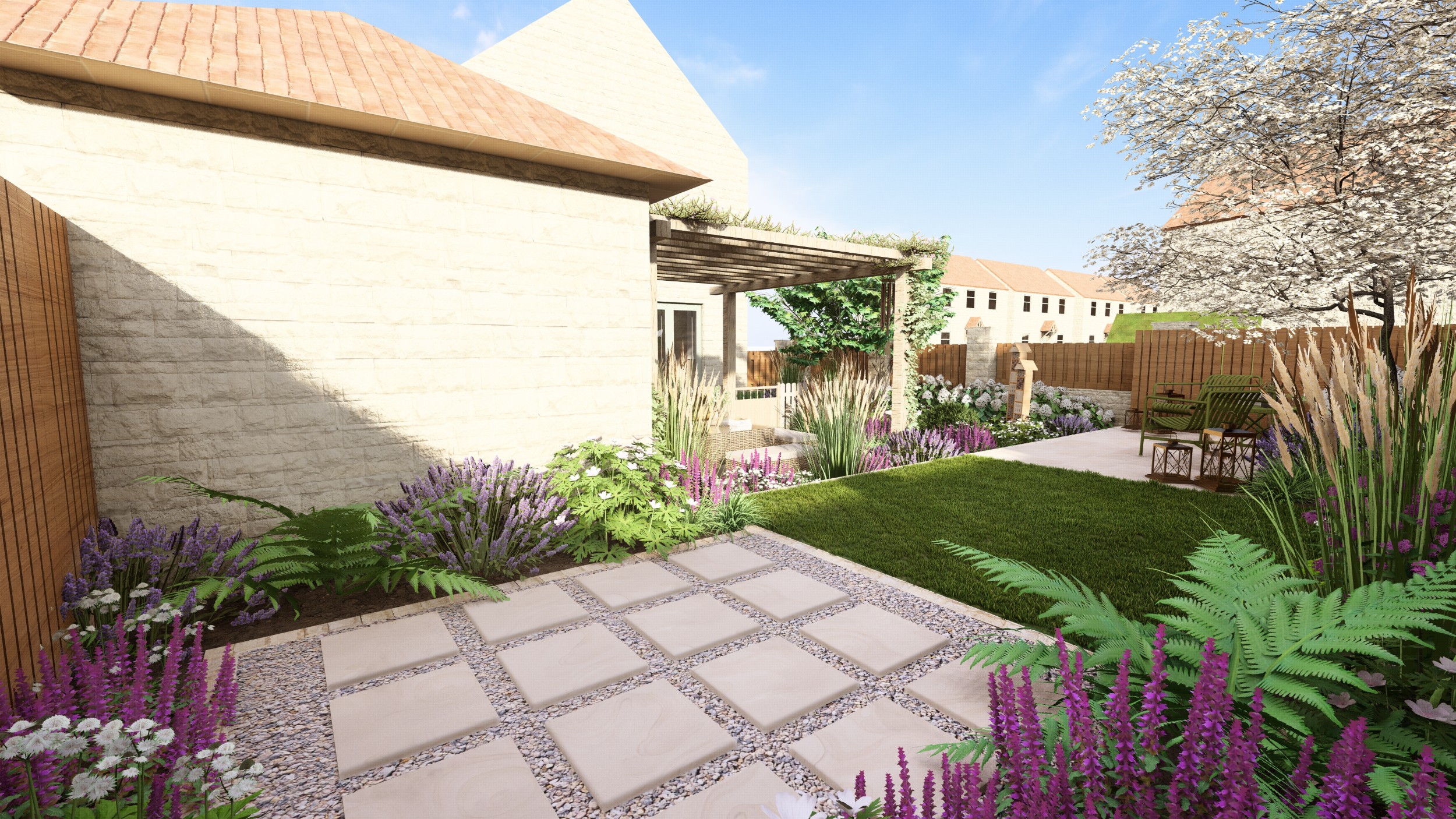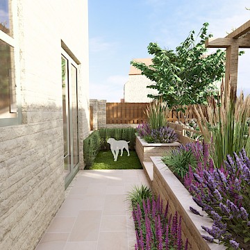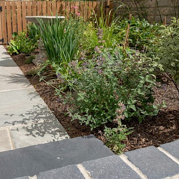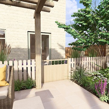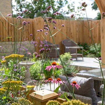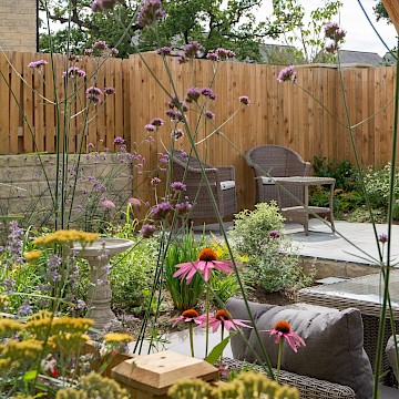 We designed this garden for a home in a new-build development where, as is often the case, the outdoor space initially consisted of a simple lawn with a small area of paving. Our client envisioned a garden rich in planting that would feel lush and immersive, offering a peaceful retreat during the summer months. She also required a way to limit her dog’s access to certain areas of the garden, without compromising the overall design.