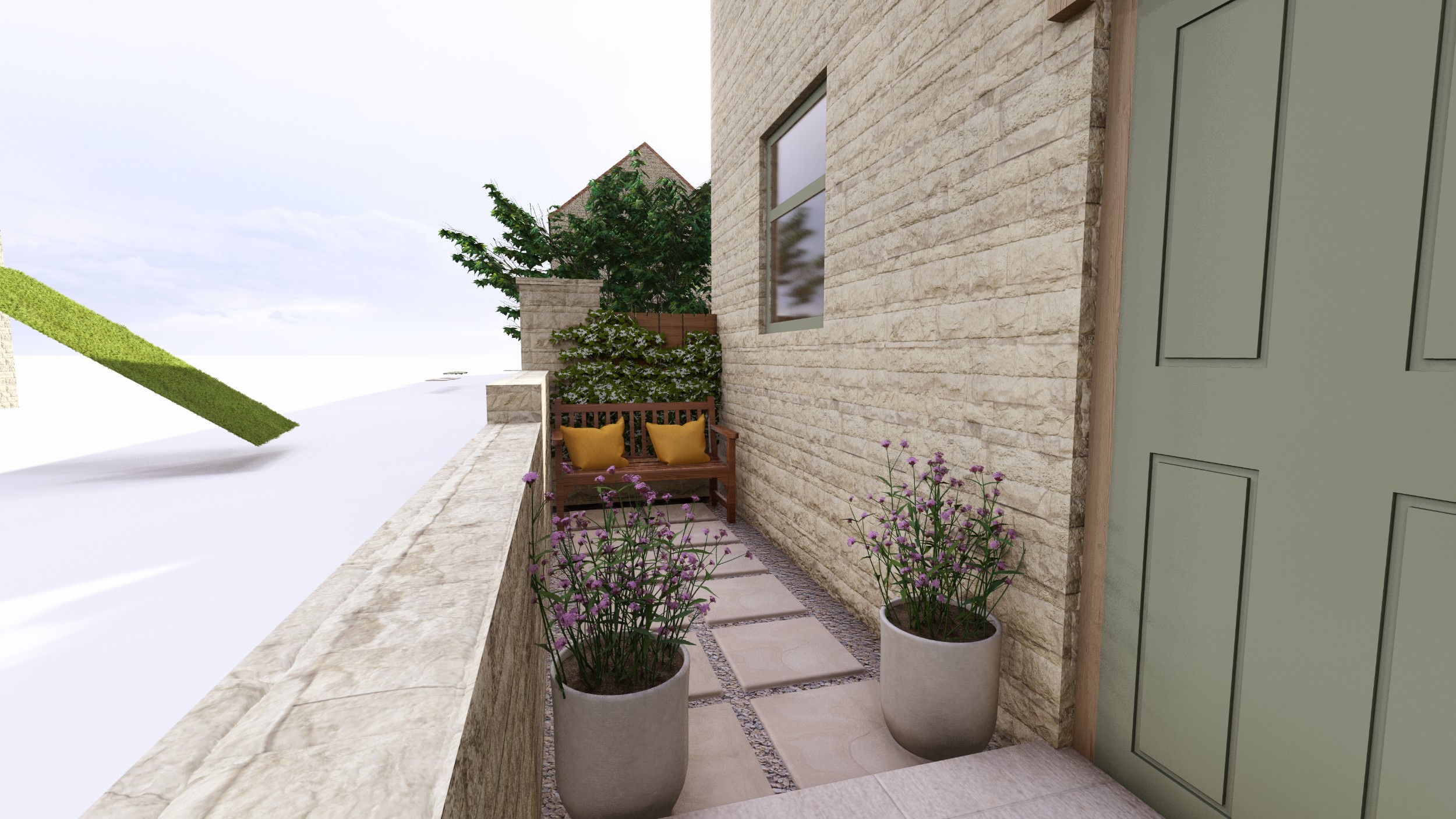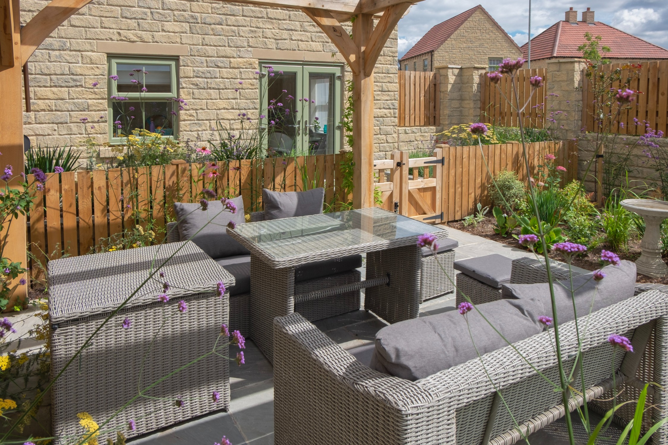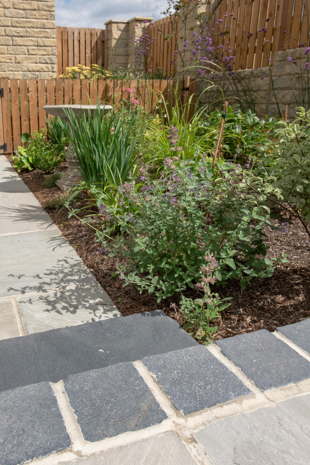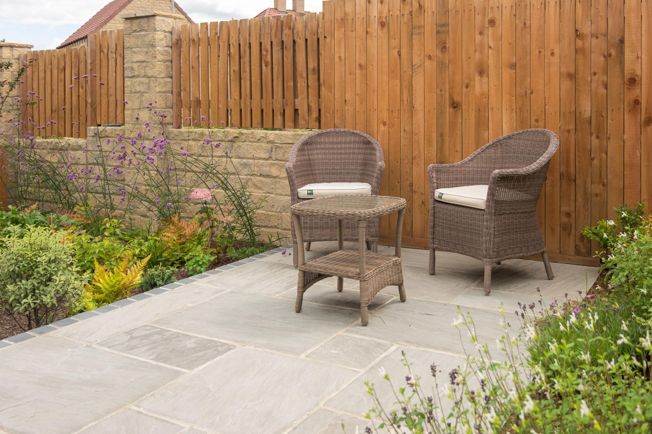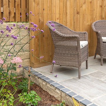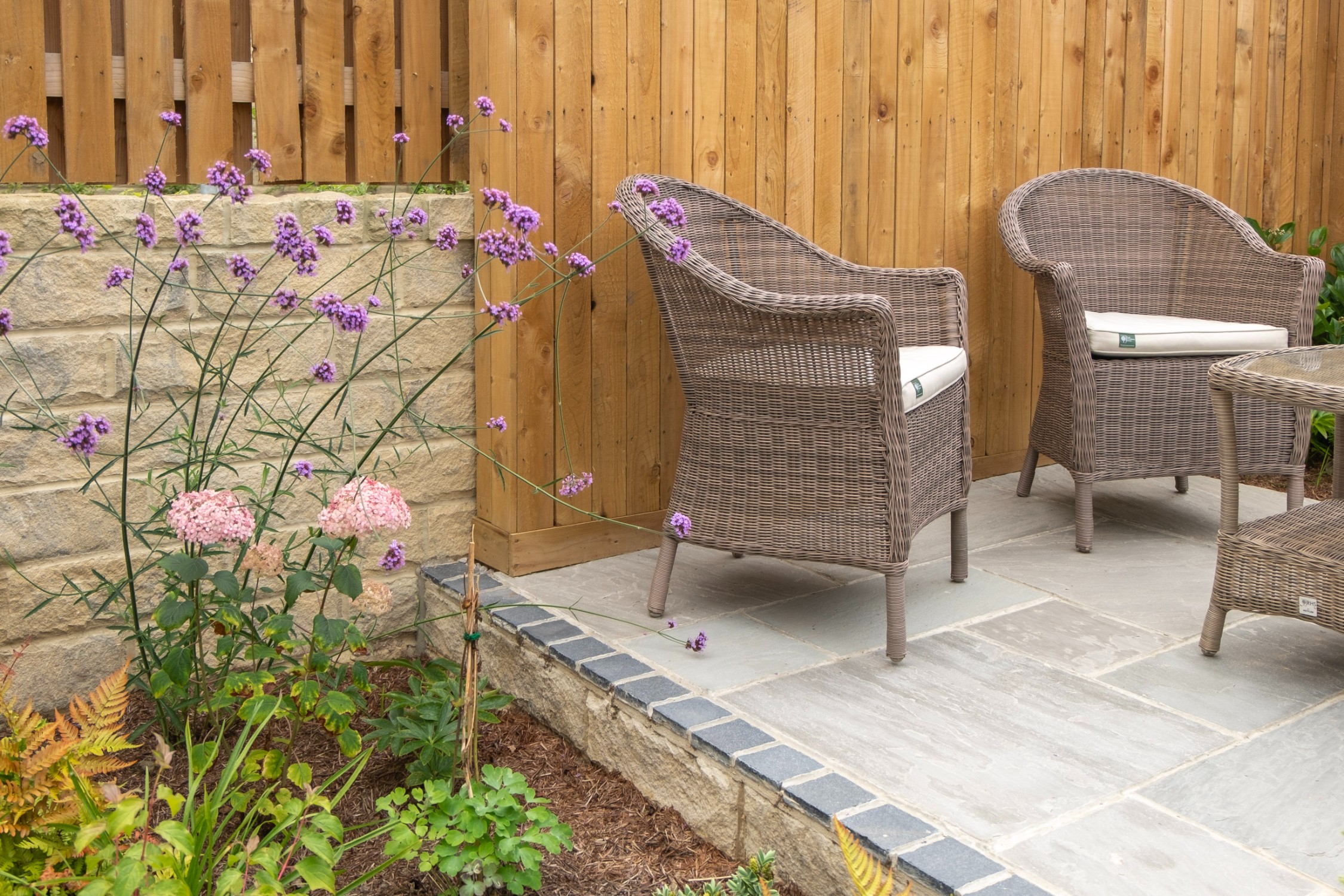 We designed this garden for a home in a new-build development where, as is often the case, the outdoor space initially consisted of a simple lawn with a small area of paving. Our client envisioned a garden rich in planting that would feel lush and immersive, offering a peaceful retreat during the summer months. She also required a way to limit her dog’s access to certain areas of the garden, without compromising the overall design.