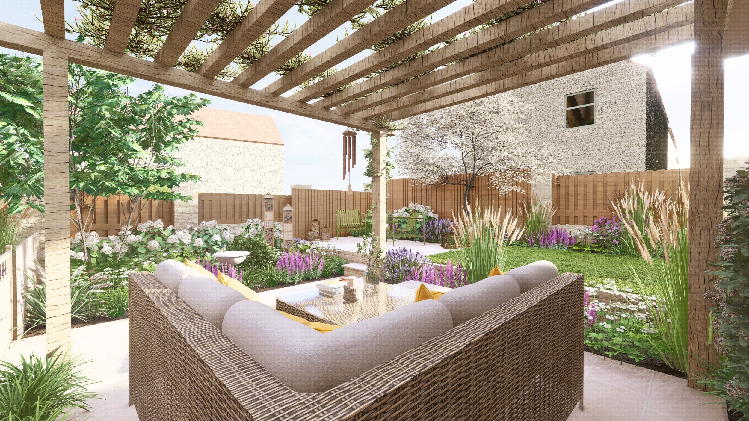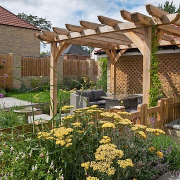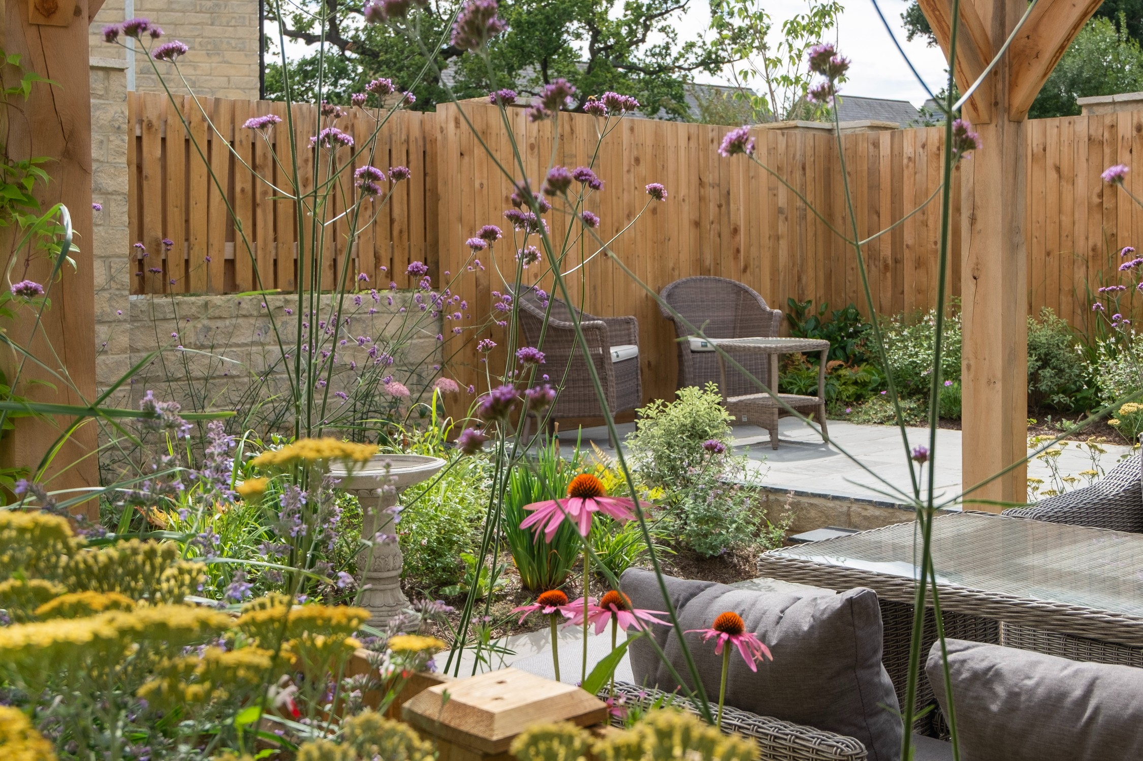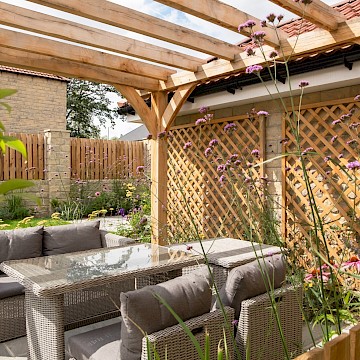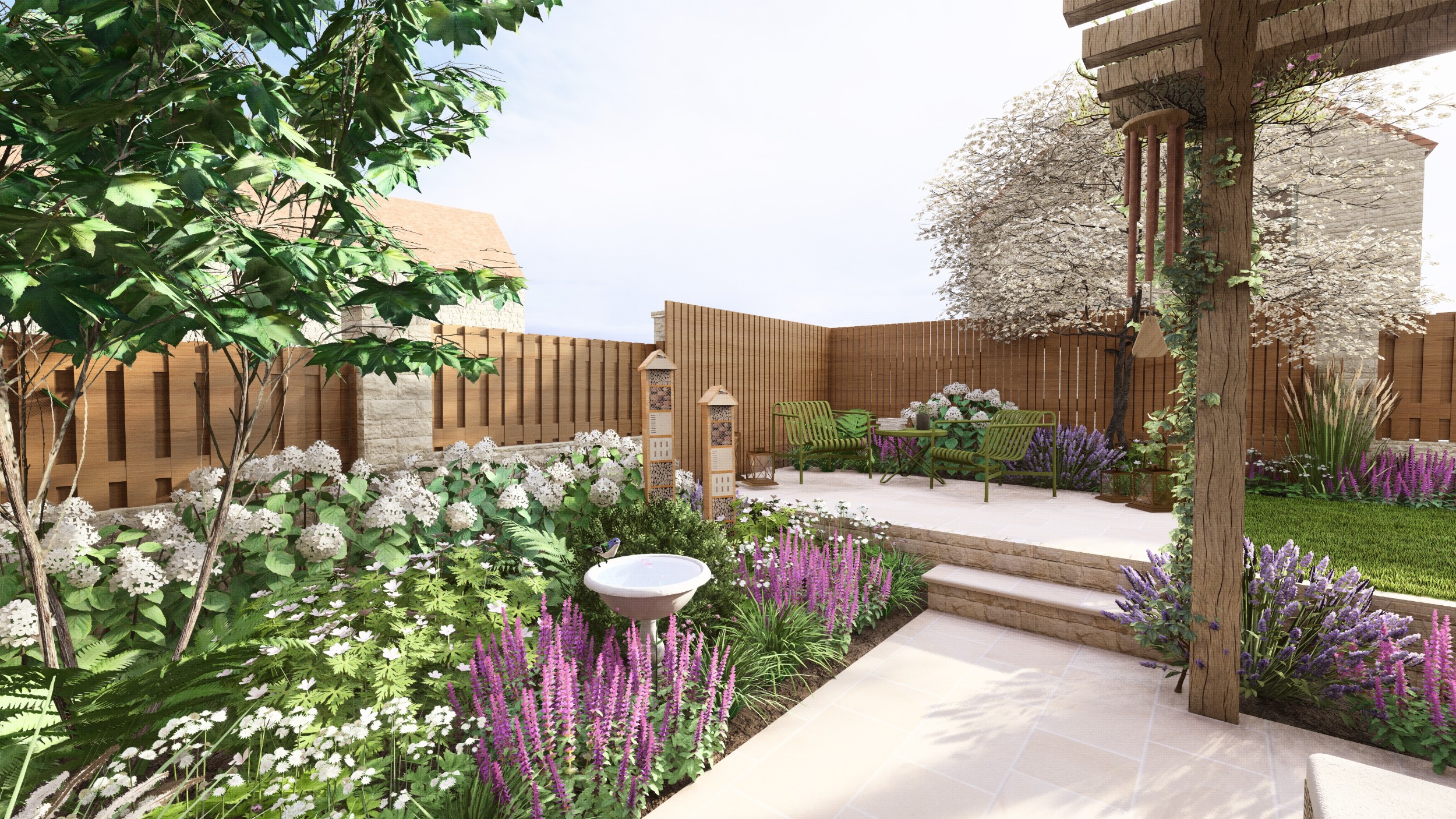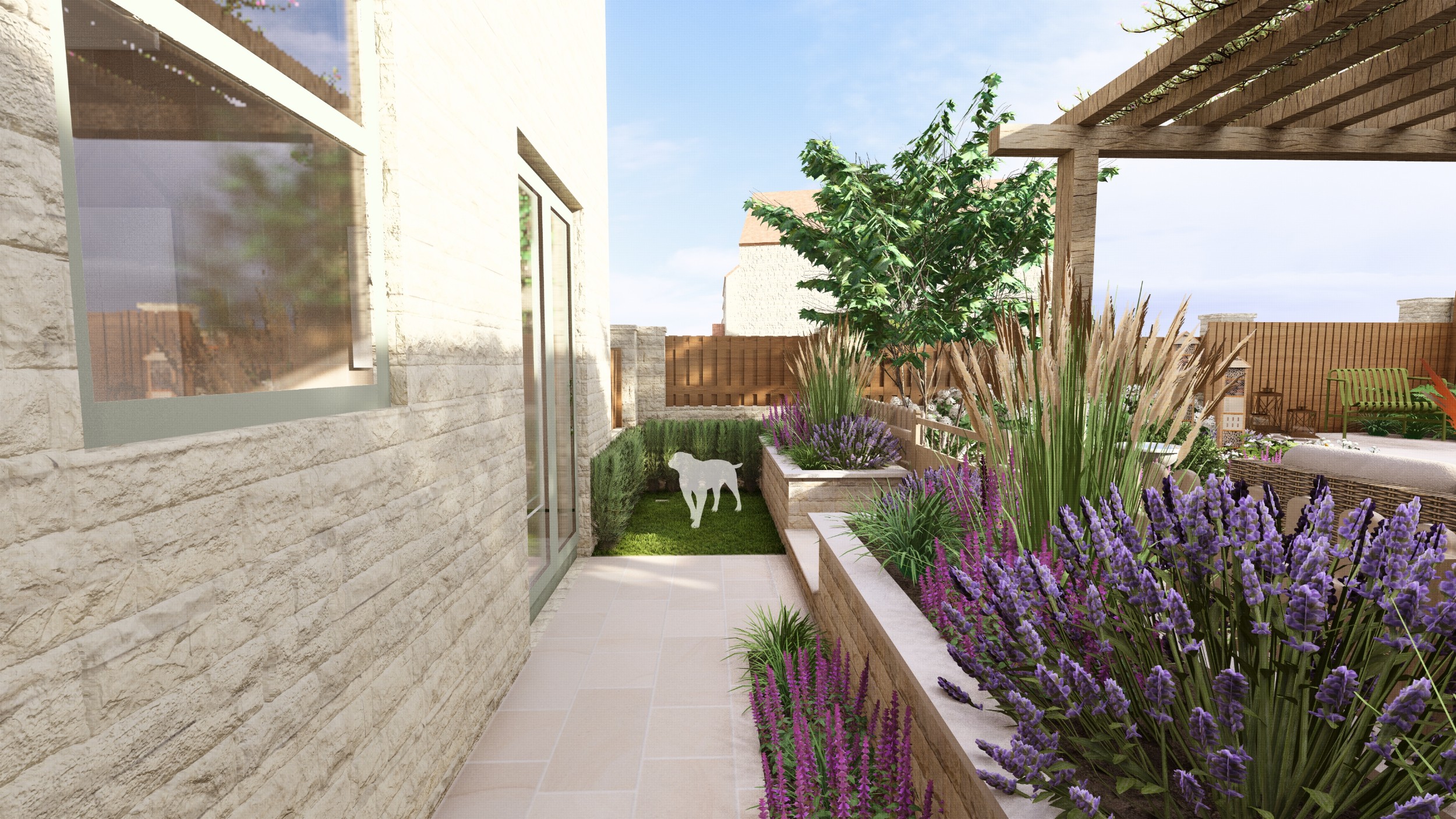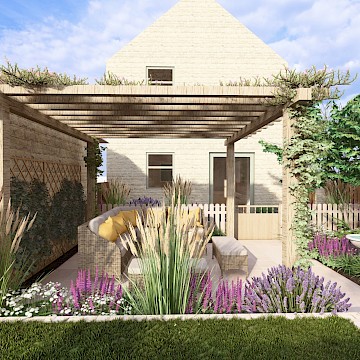 We created a garden with generous planting beds that wrap around the entire space, enveloping it in greenery and colour while attracting butterflies and bees. A dividing wall and gate were introduced to restrict the dog’s access to certain areas of the garden. Beyond this, a seating area sits beneath an oak pergola, surrounded by lush, layered planting. The upper level features a small lawn and a paved area, perfectly positioned to catch the light at the end of the day.