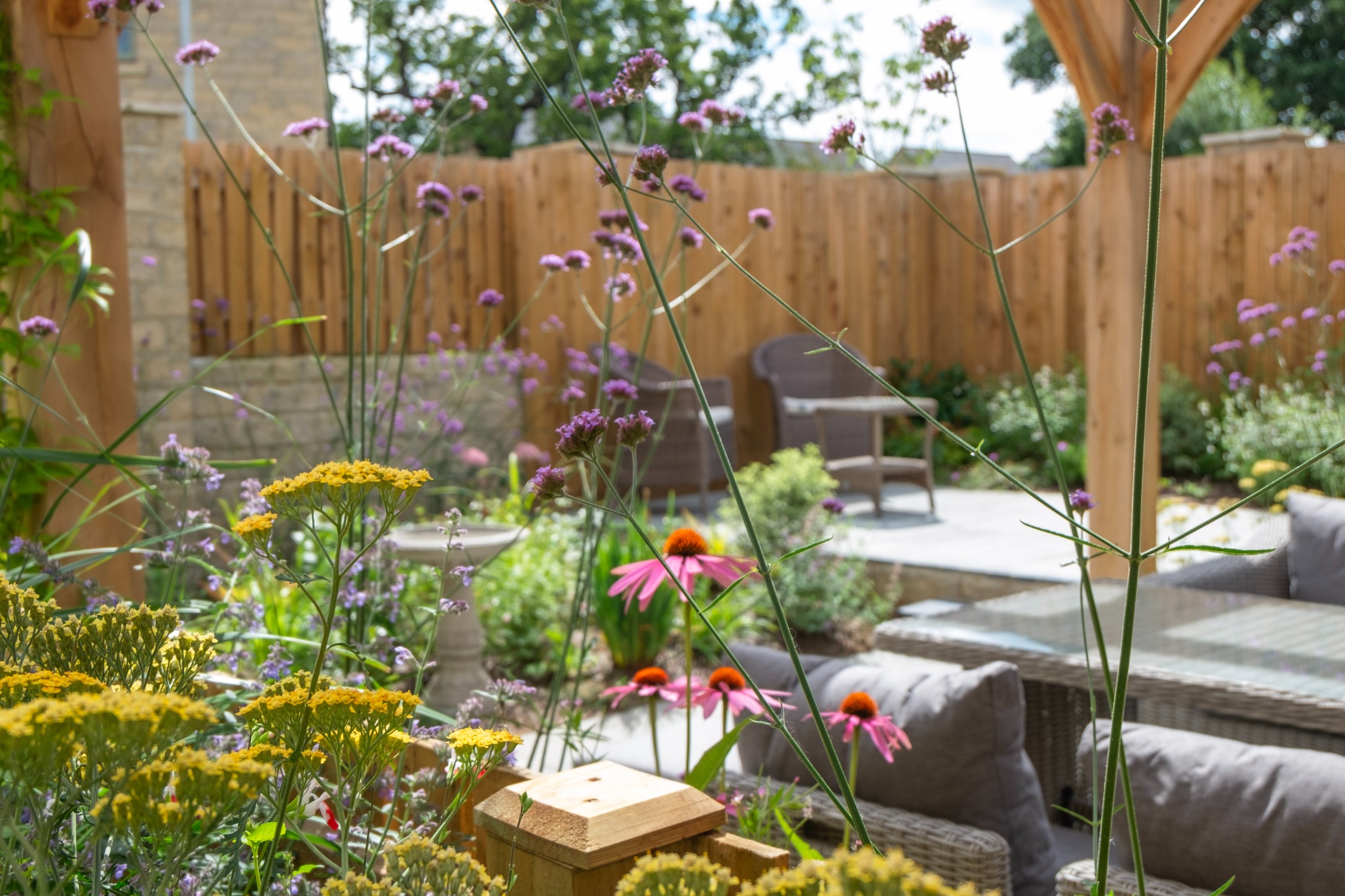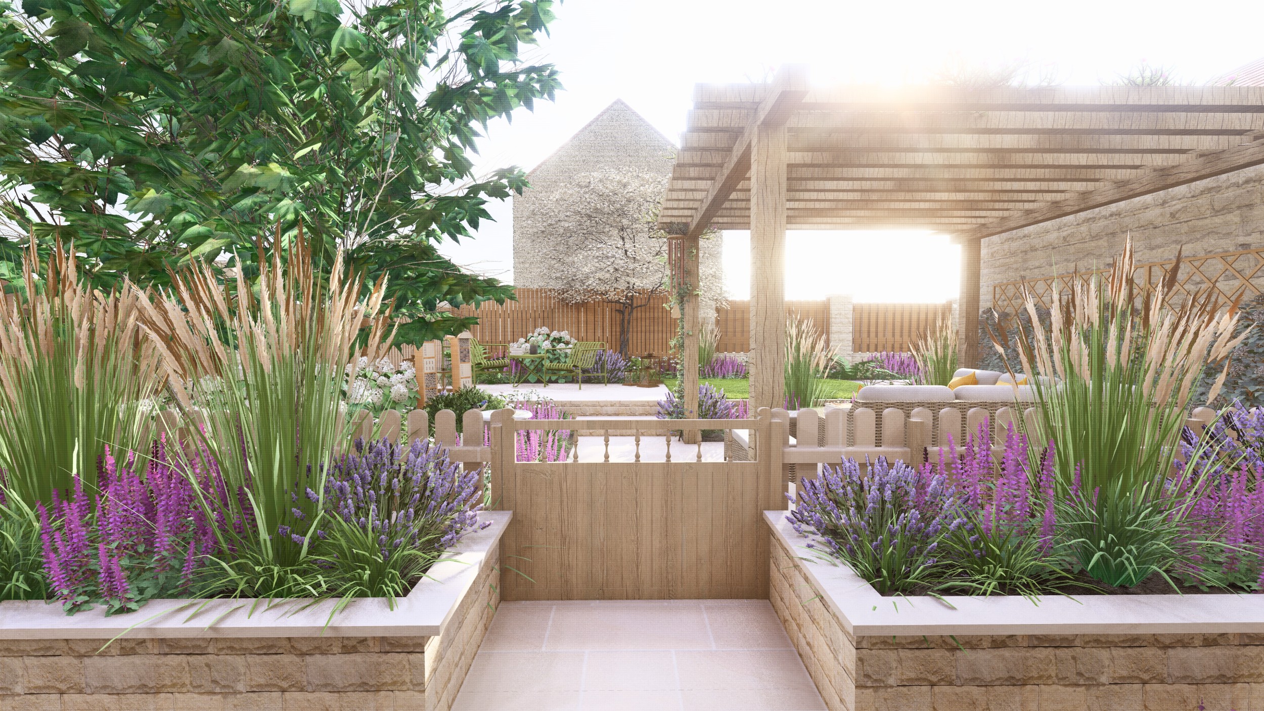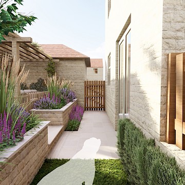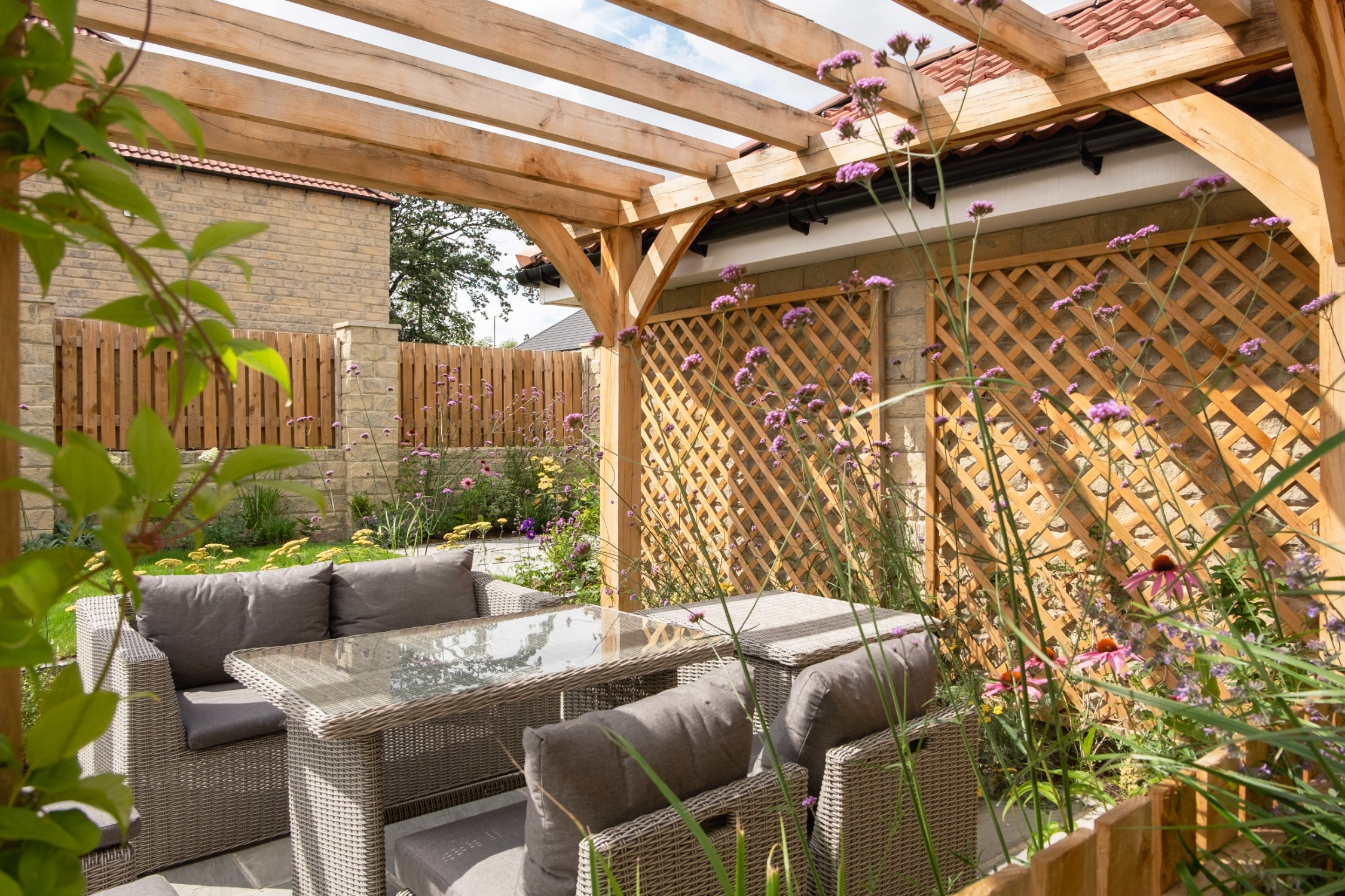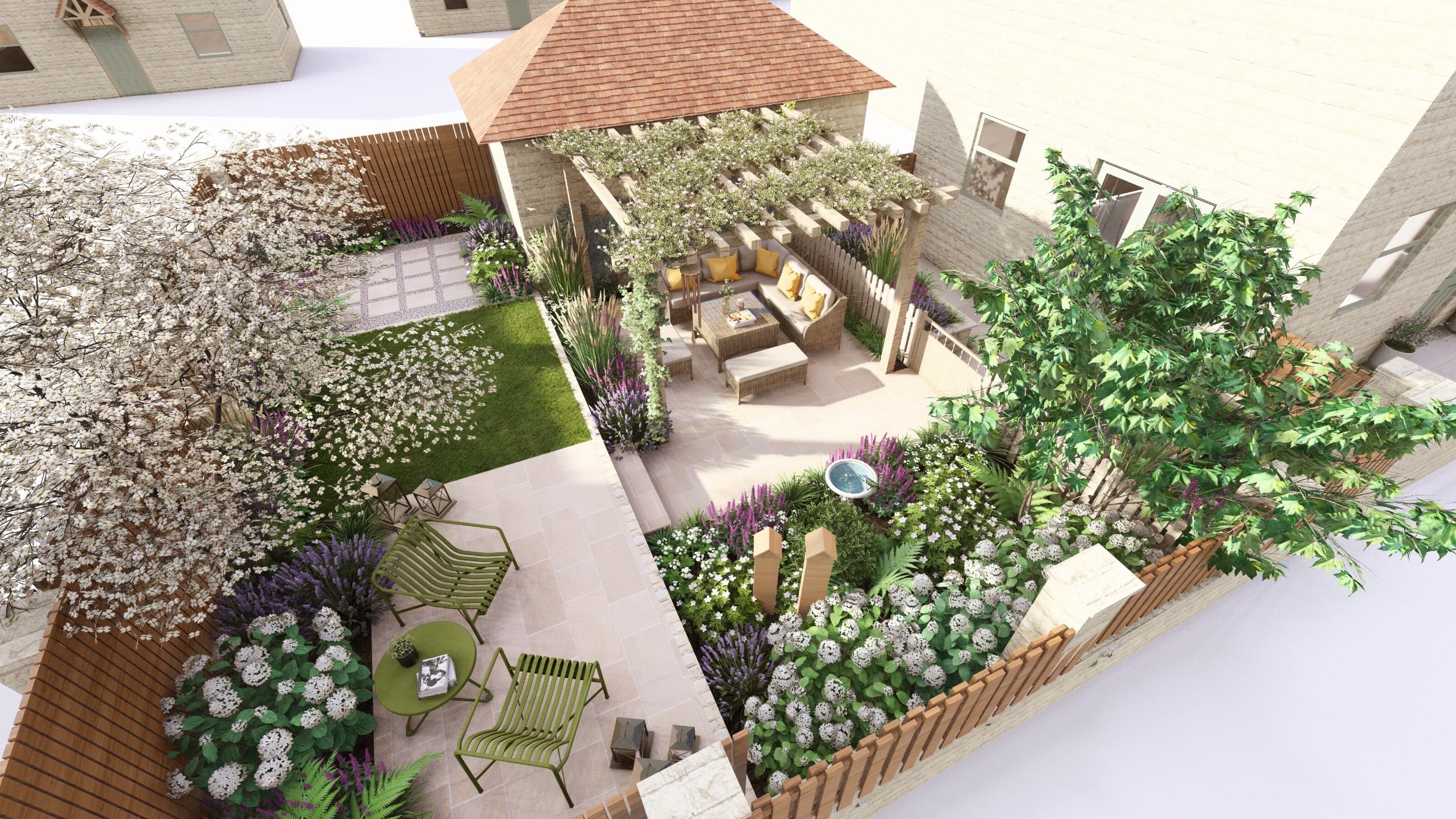 We created a garden with generous planting beds that wrap around the entire space, enveloping it in greenery and colour while attracting butterflies and bees. A dividing wall and gate were introduced to restrict the dog’s access to certain areas of the garden. Beyond this, a seating area sits beneath an oak pergola, surrounded by lush, layered planting. The upper level features a small lawn and a paved area, perfectly positioned to catch the light at the end of the day.
