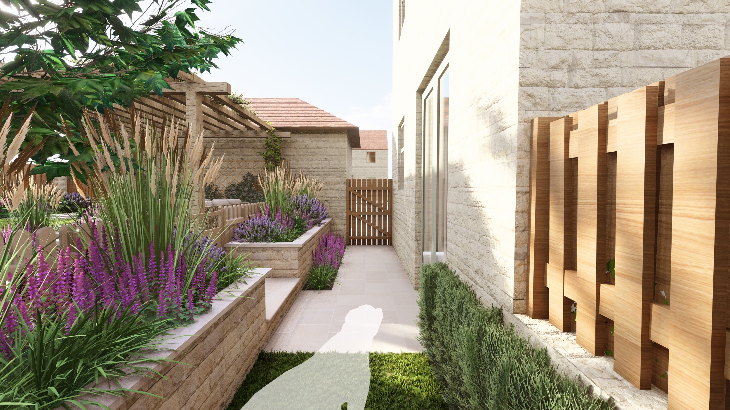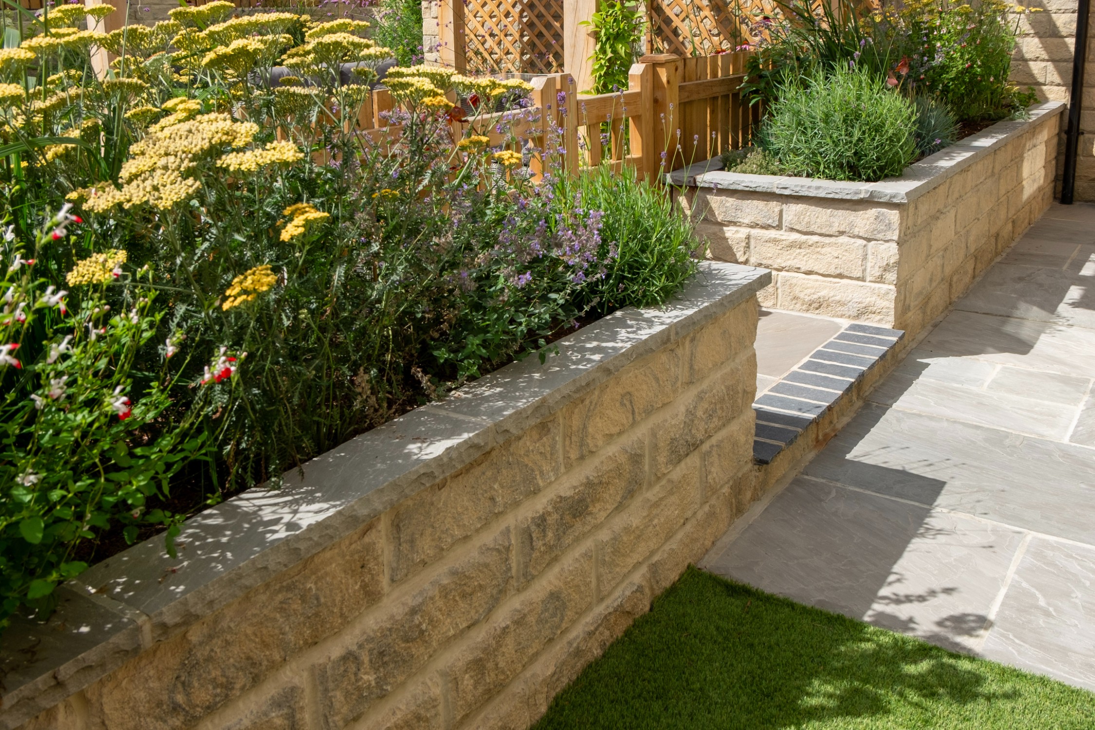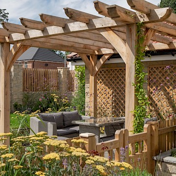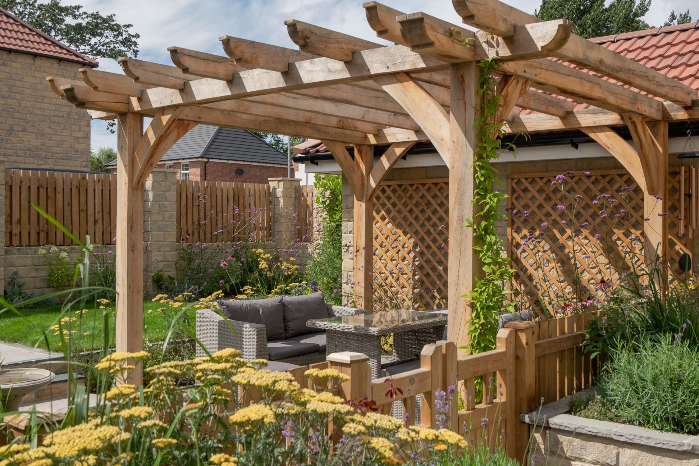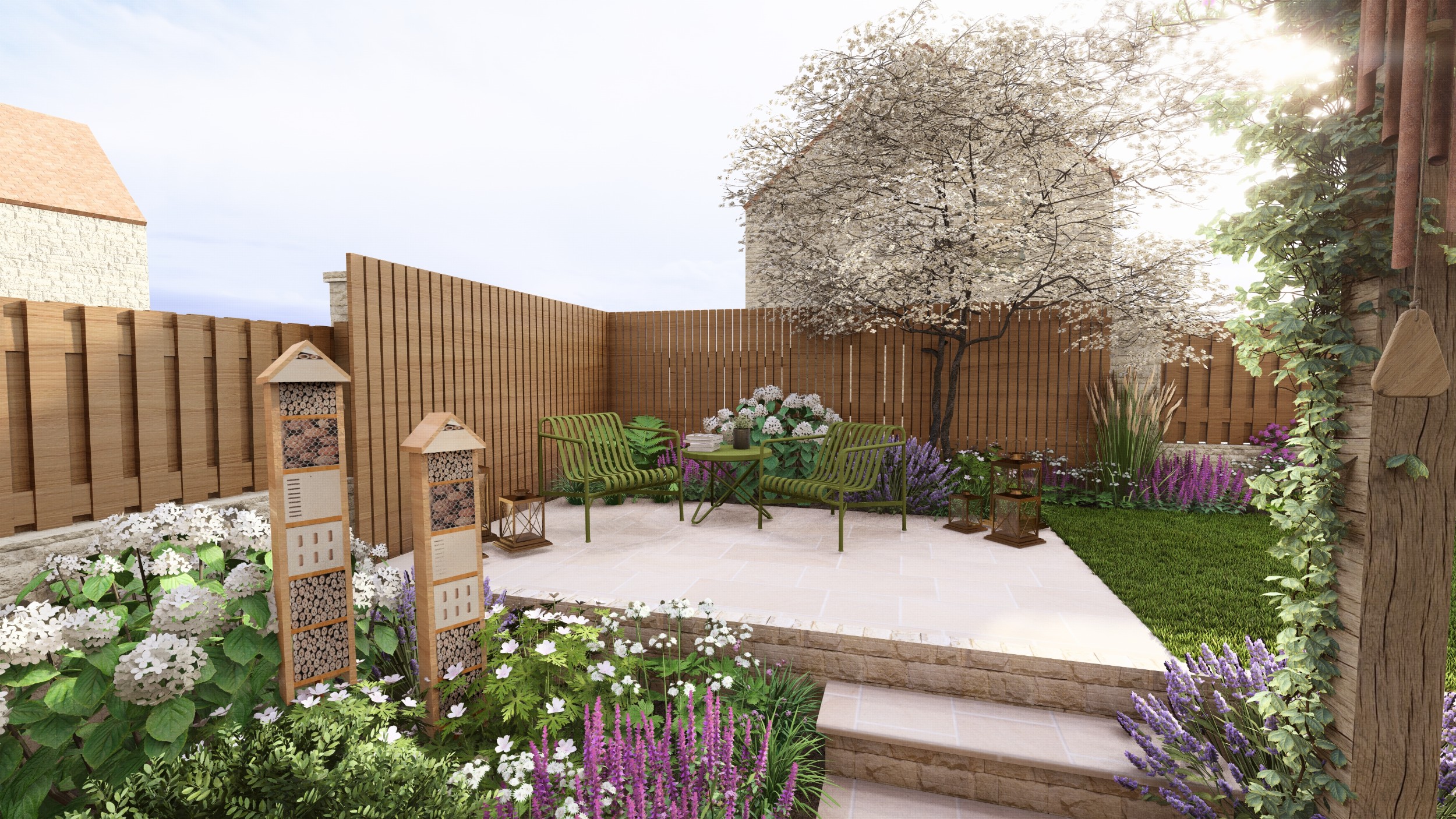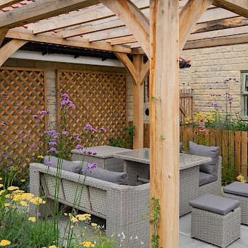We created a garden with generous planting beds that wrap around the entire space, enveloping it in greenery and colour while attracting butterflies and bees. A dividing wall and gate were introduced to restrict the dog’s access to certain areas of the garden. Beyond this, a seating area sits beneath an oak pergola, surrounded by lush, layered planting. The upper level features a small lawn and a paved area, perfectly positioned to catch the light at the end of the day.