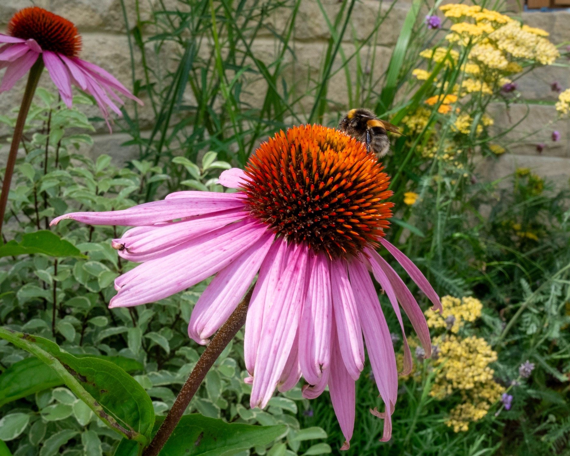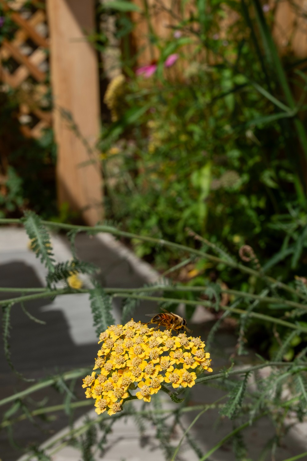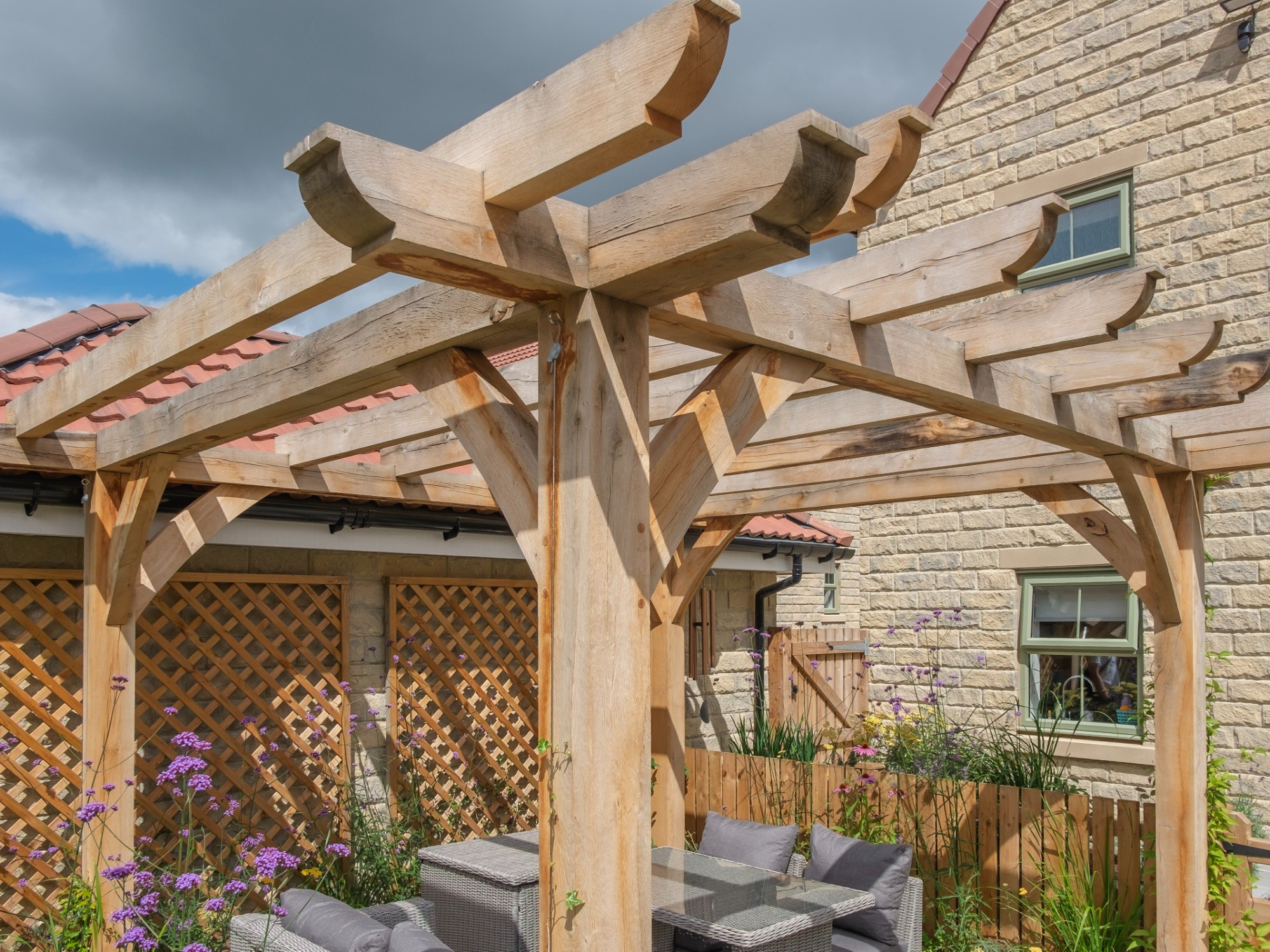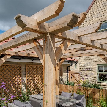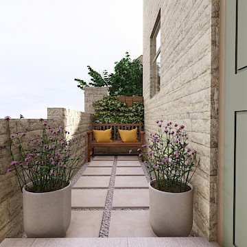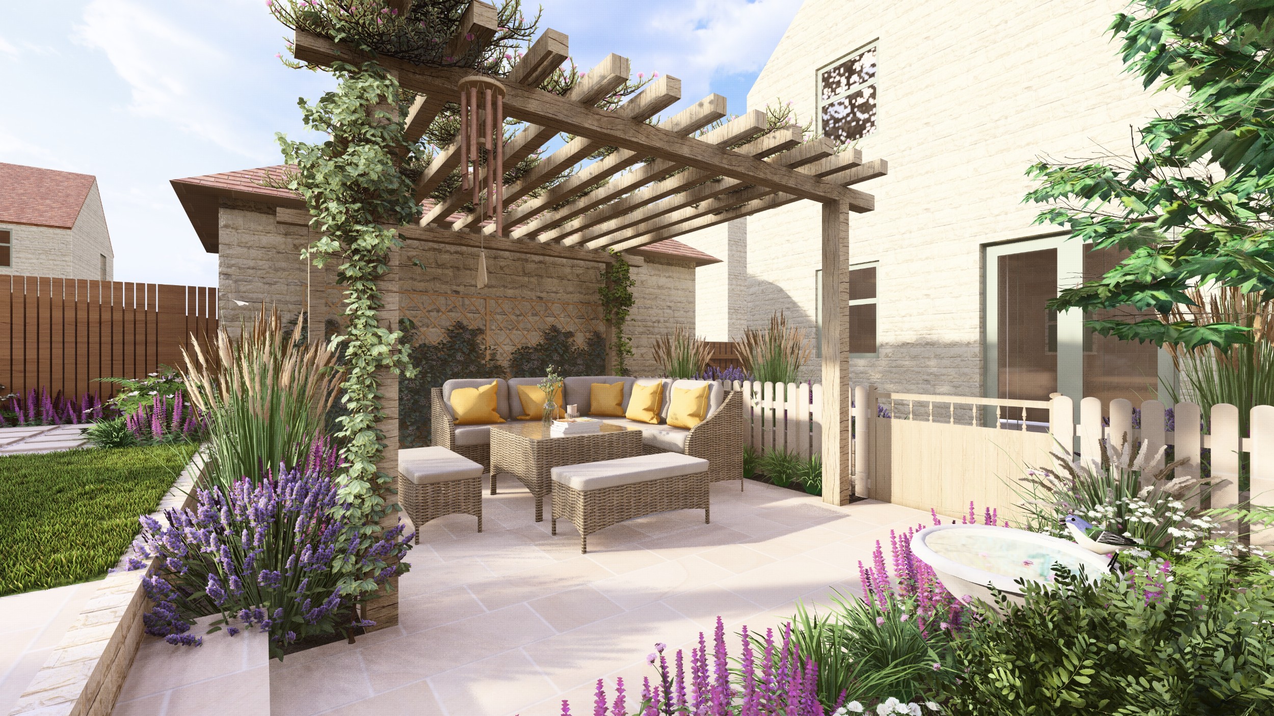 We created a garden with generous planting beds that wrap around the entire space, enveloping it in greenery and colour while attracting butterflies and bees. A dividing wall and gate were introduced to restrict the dog’s access to certain areas of the garden. Beyond this, a seating area sits beneath an oak pergola, surrounded by lush, layered planting. The upper level features a small lawn and a paved area, perfectly positioned to catch the light at the end of the day.