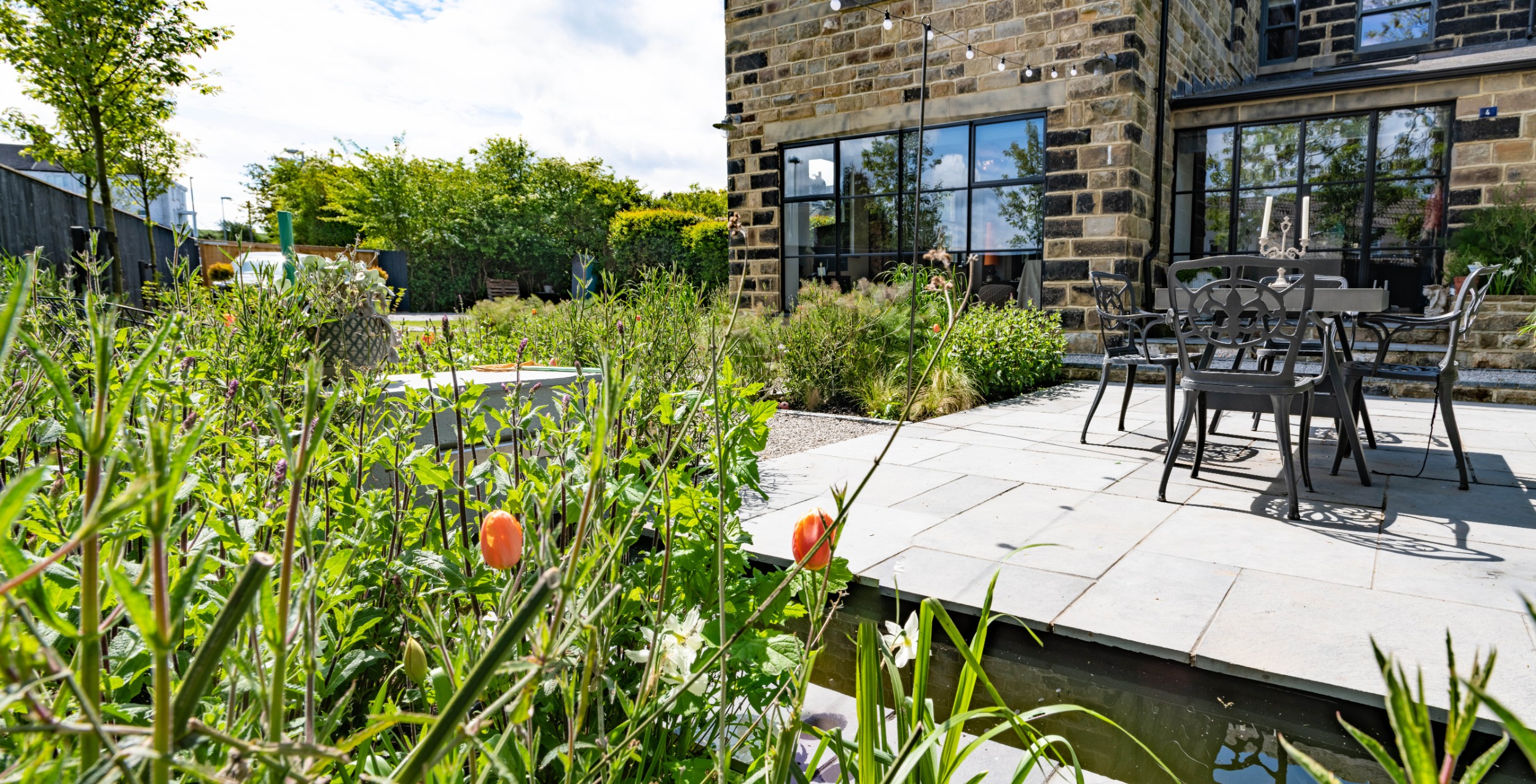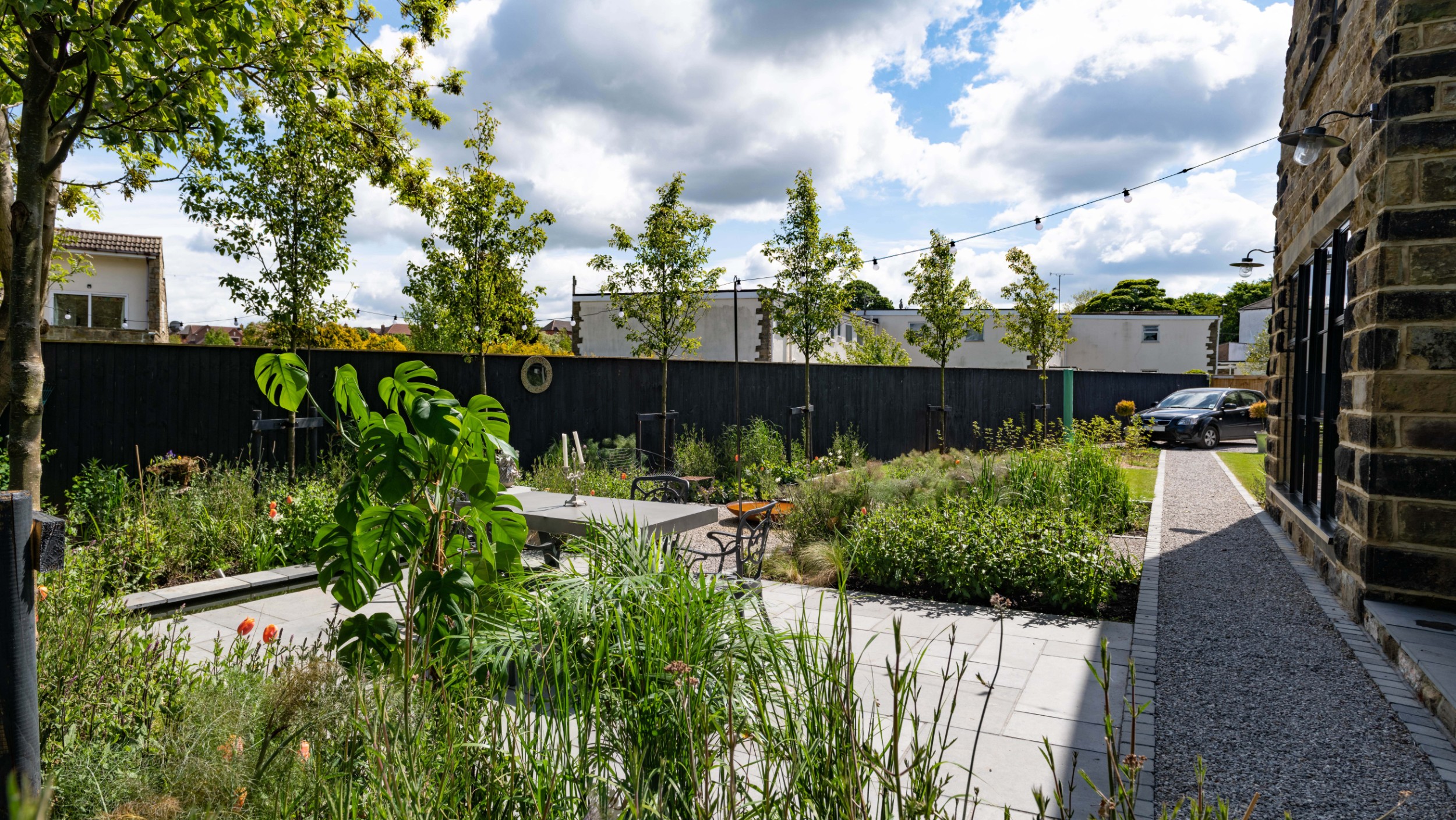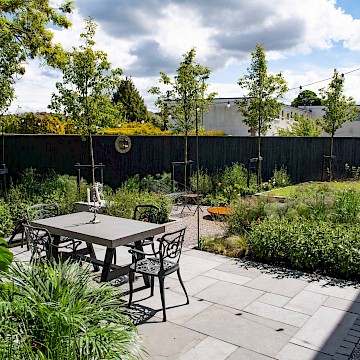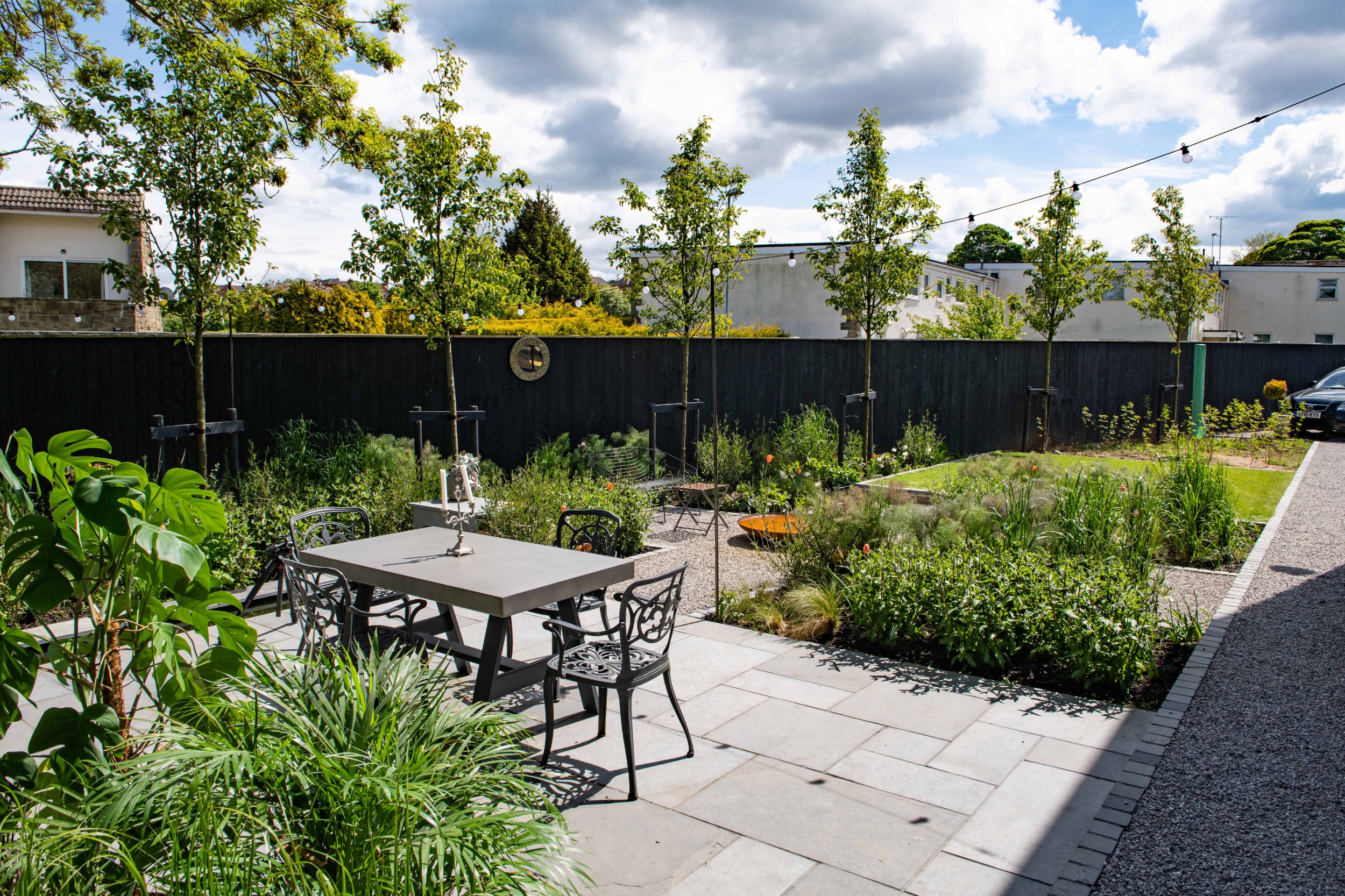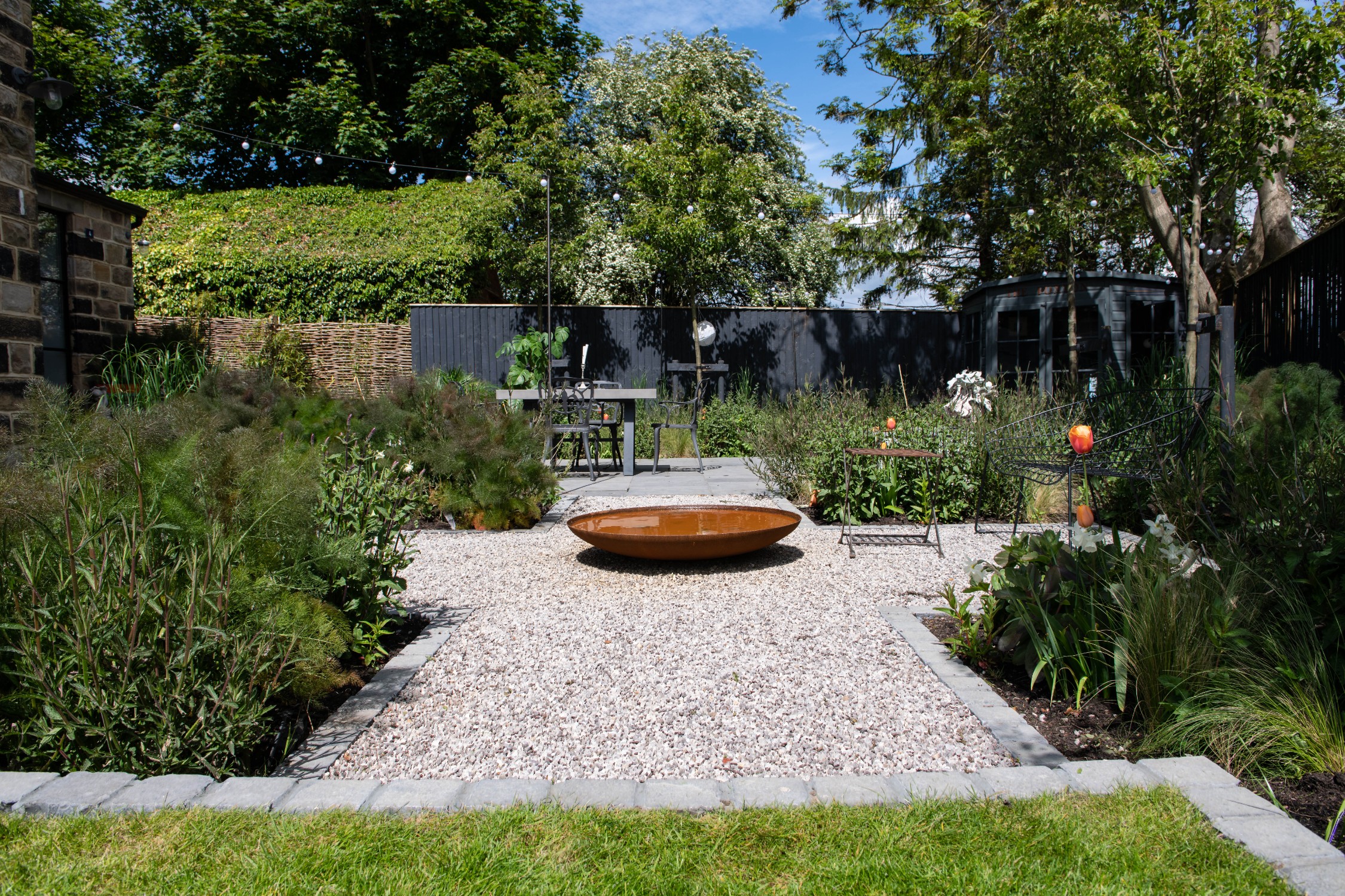 Our client commissioned a garden design to complement their recent house extension. The layout features a series of interlocking geometric shapes, softened by generous planting areas and enhanced with a distinctive water feature. Lush planting filled with wildflowers brings colour and movement to the space, while newly planted trees will mature over time to provide additional privacy.