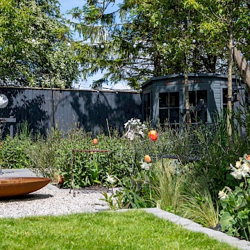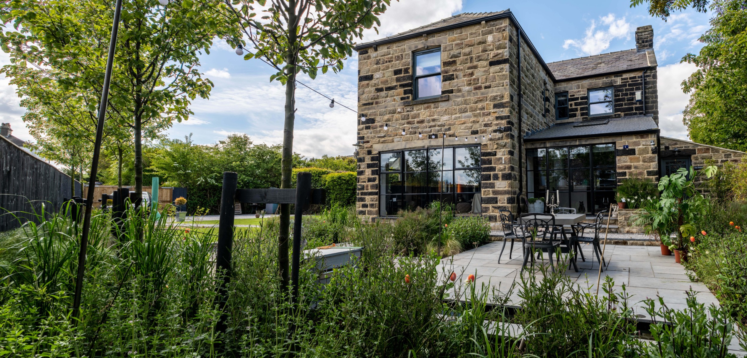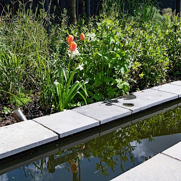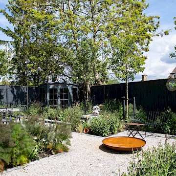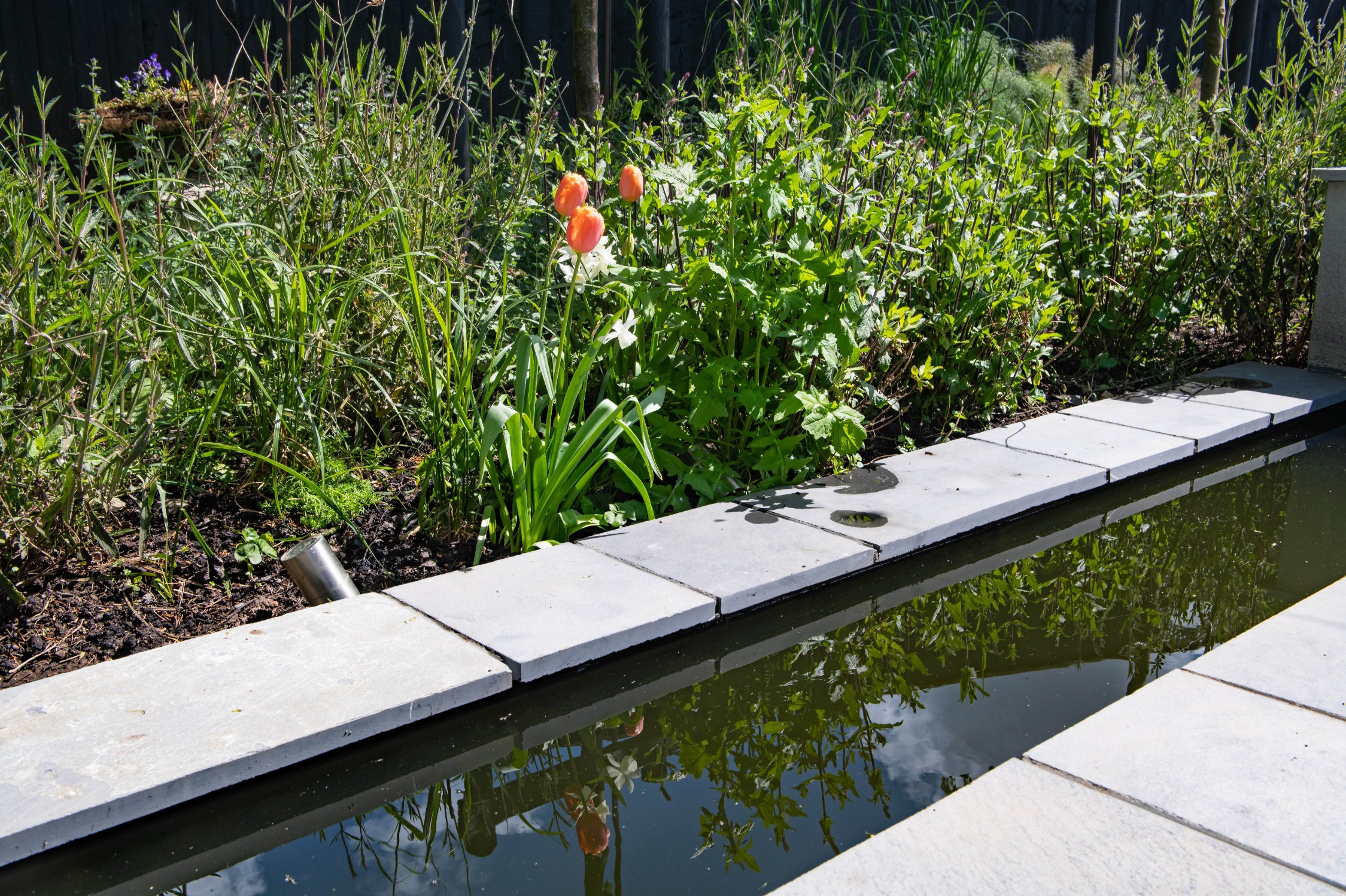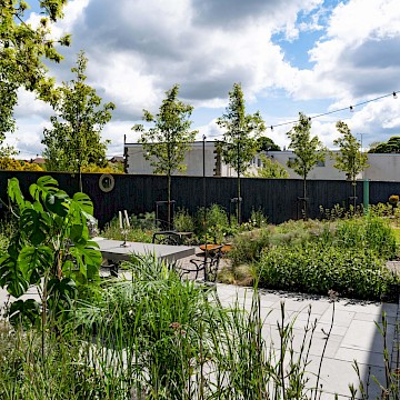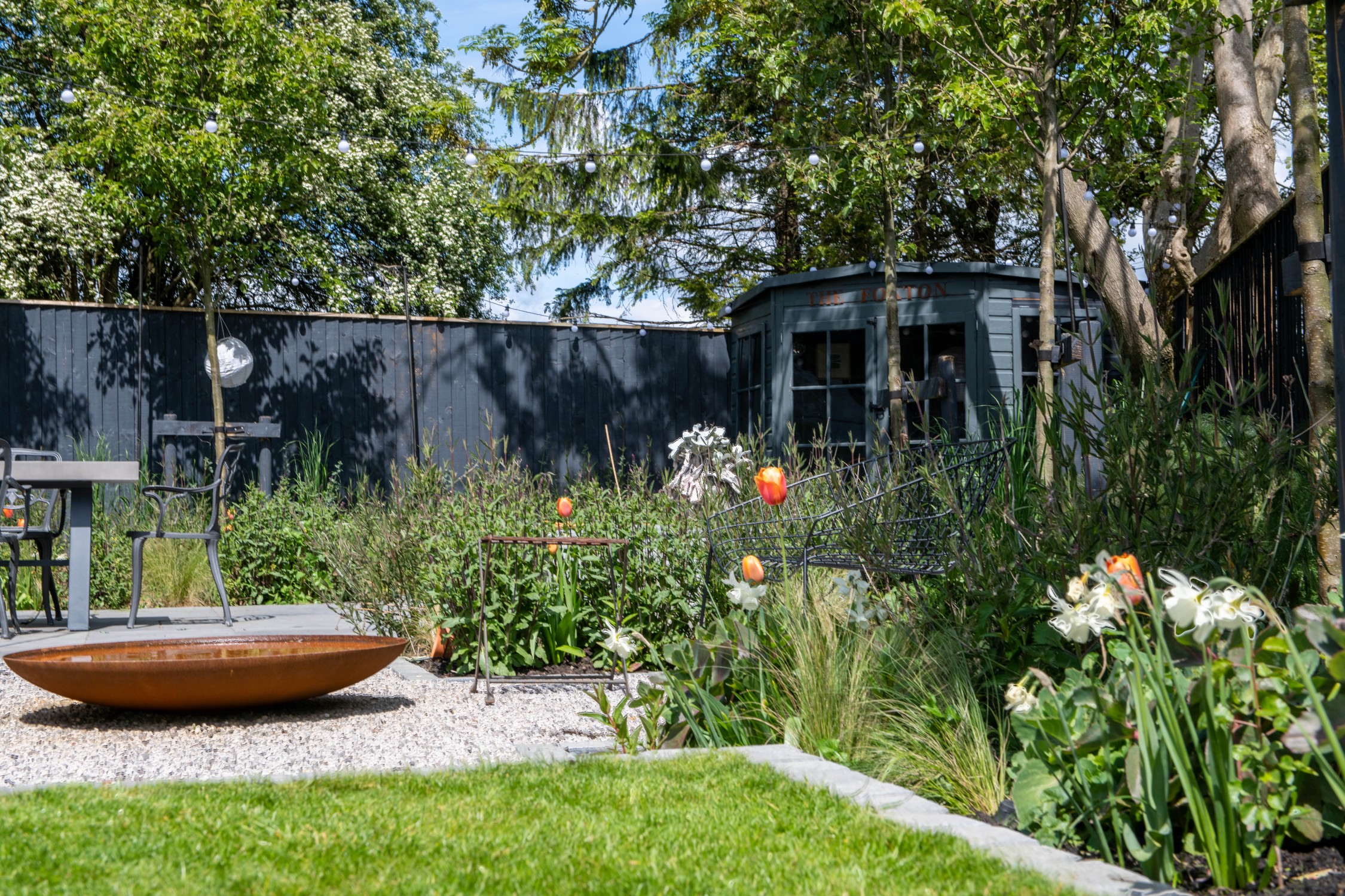 Our client commissioned a garden design to complement their recent house extension. The layout features a series of interlocking geometric shapes, softened by generous planting areas and enhanced with a distinctive water feature. Lush planting filled with wildflowers brings colour and movement to the space, while newly planted trees will mature over time to provide additional privacy.