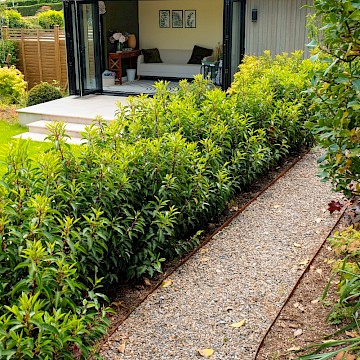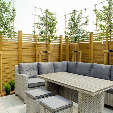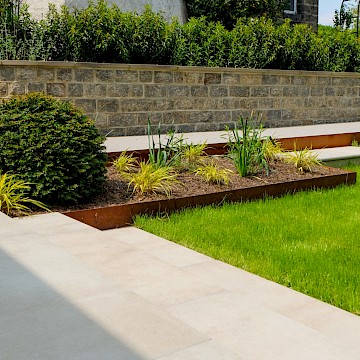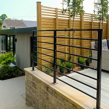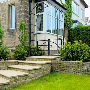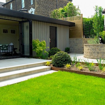 For this project, we collaborated with garden designer Melissa Morton to transform this large garden space in Menston. A small garage was demolished to make way for a bespoke garden room, fully serviced and plastered for year-round use. Throughout the garden, we constructed Yorkshire stone walling and gabion baskets, adding both structure and character. A composite decking seating area, complemented by Jacksons Fencing, creates a stylish and durable outdoor space, while pleached trees provide privacy and shelter.