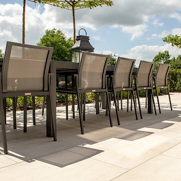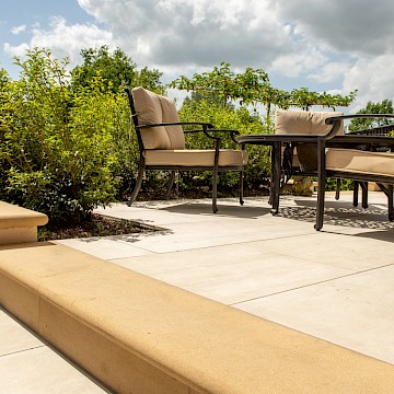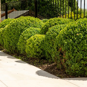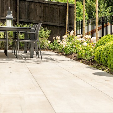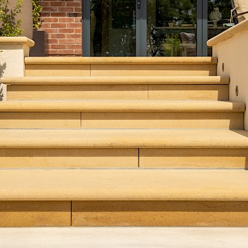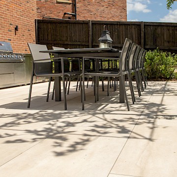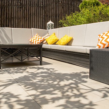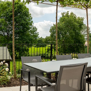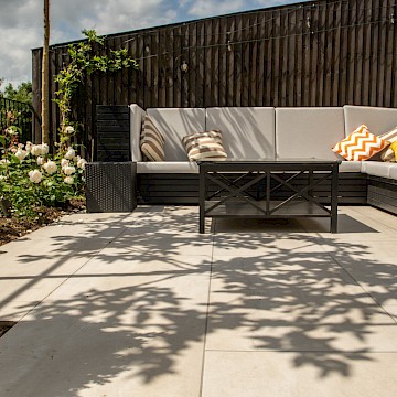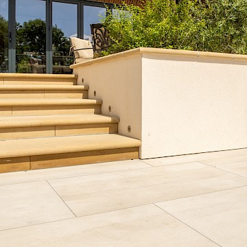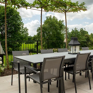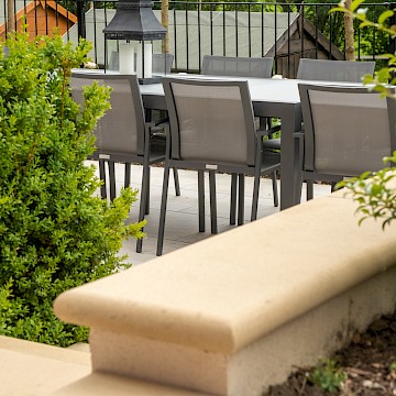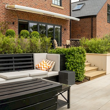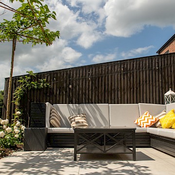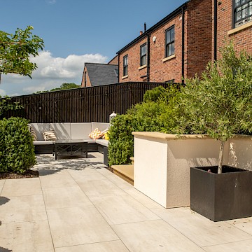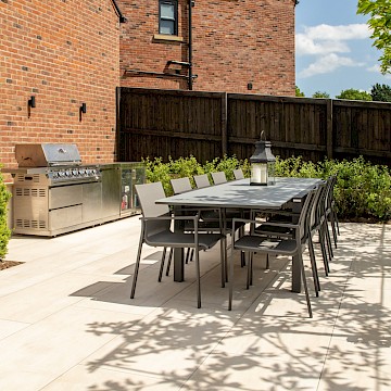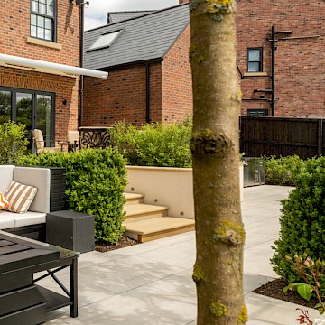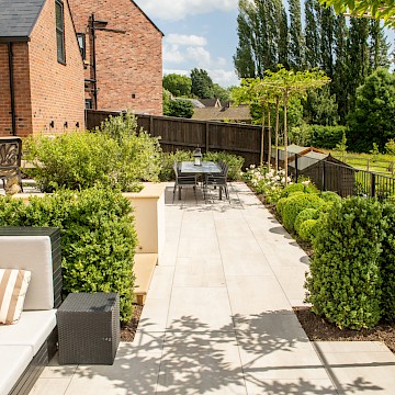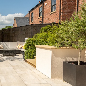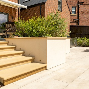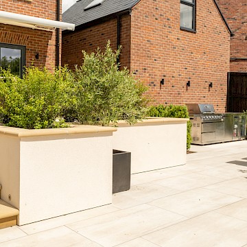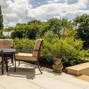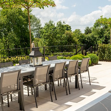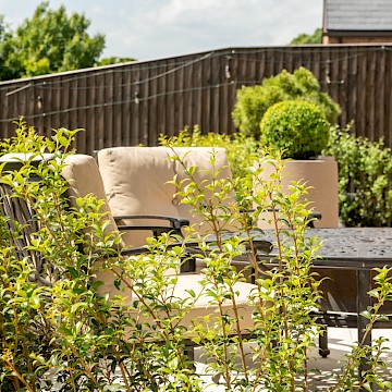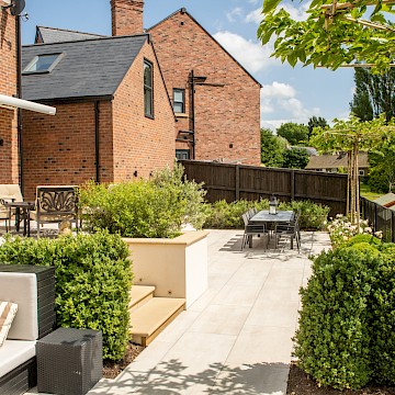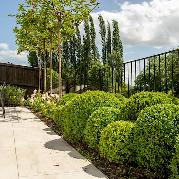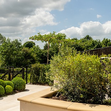 Garden designer Kit Peel created a stunning two-tier garden that seamlessly blends functionality with aesthetics. The upper tier serves as a seating area, with steps leading down to the lower tier, designed for cooking, dining, and relaxation. Lush planting softens the strong structural elements, harmonizing with the open landscape views at the rear of the property. This complex project also included the installation of a full lighting system and the planting of several willow trees, enhancing both ambiance and natural beauty.