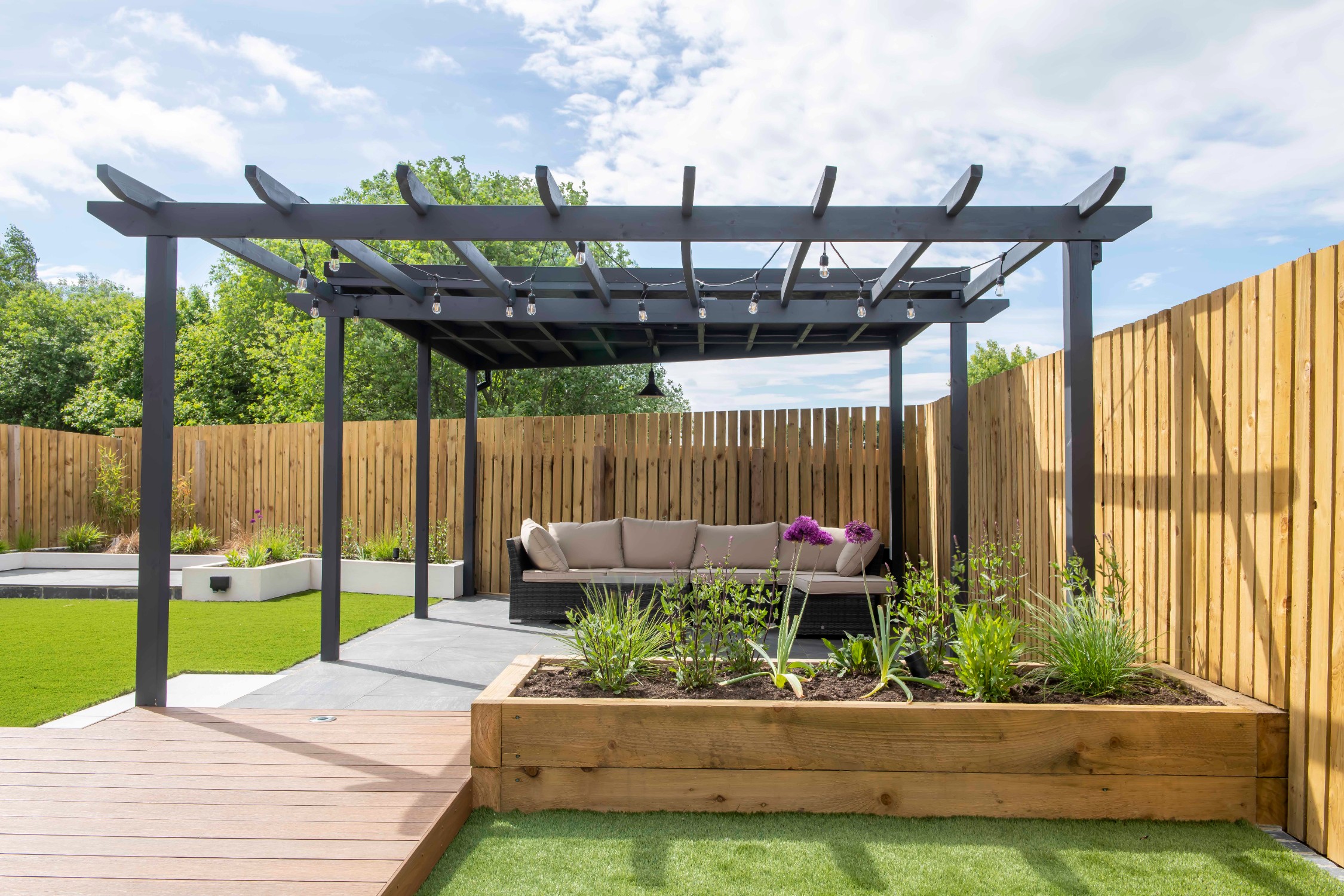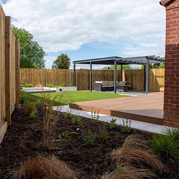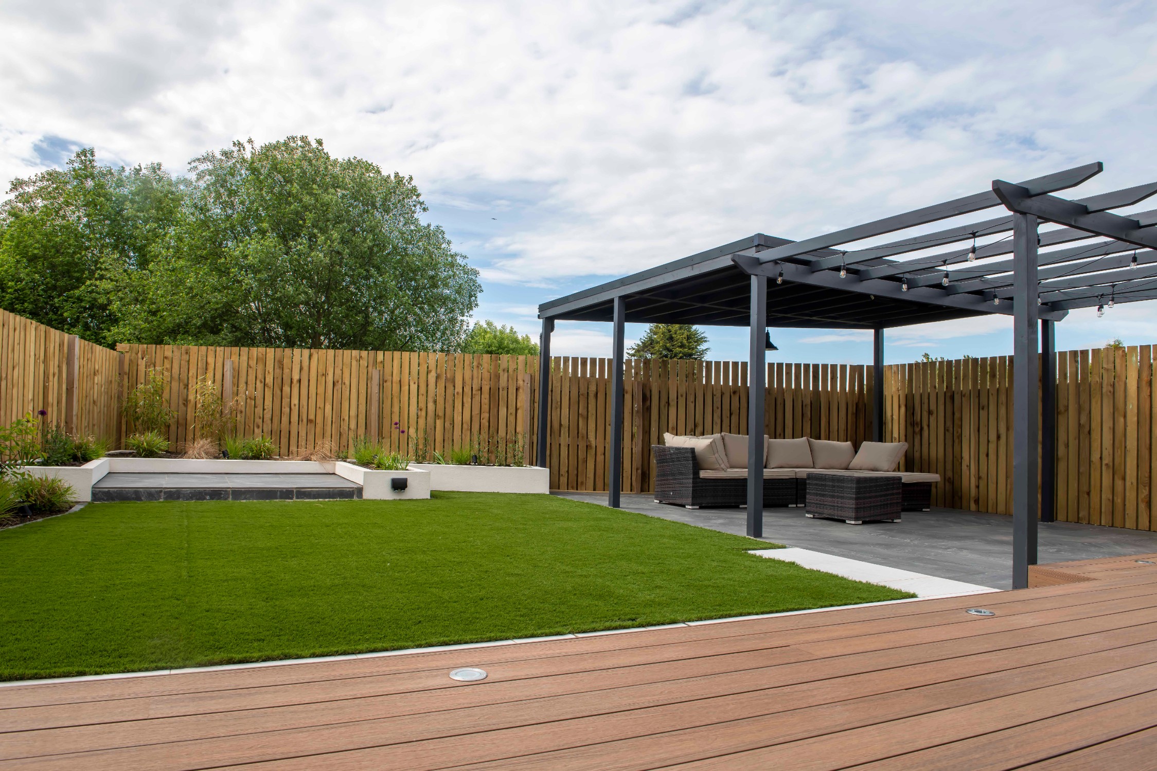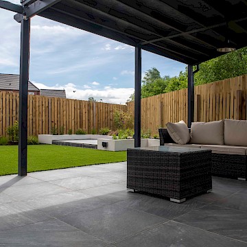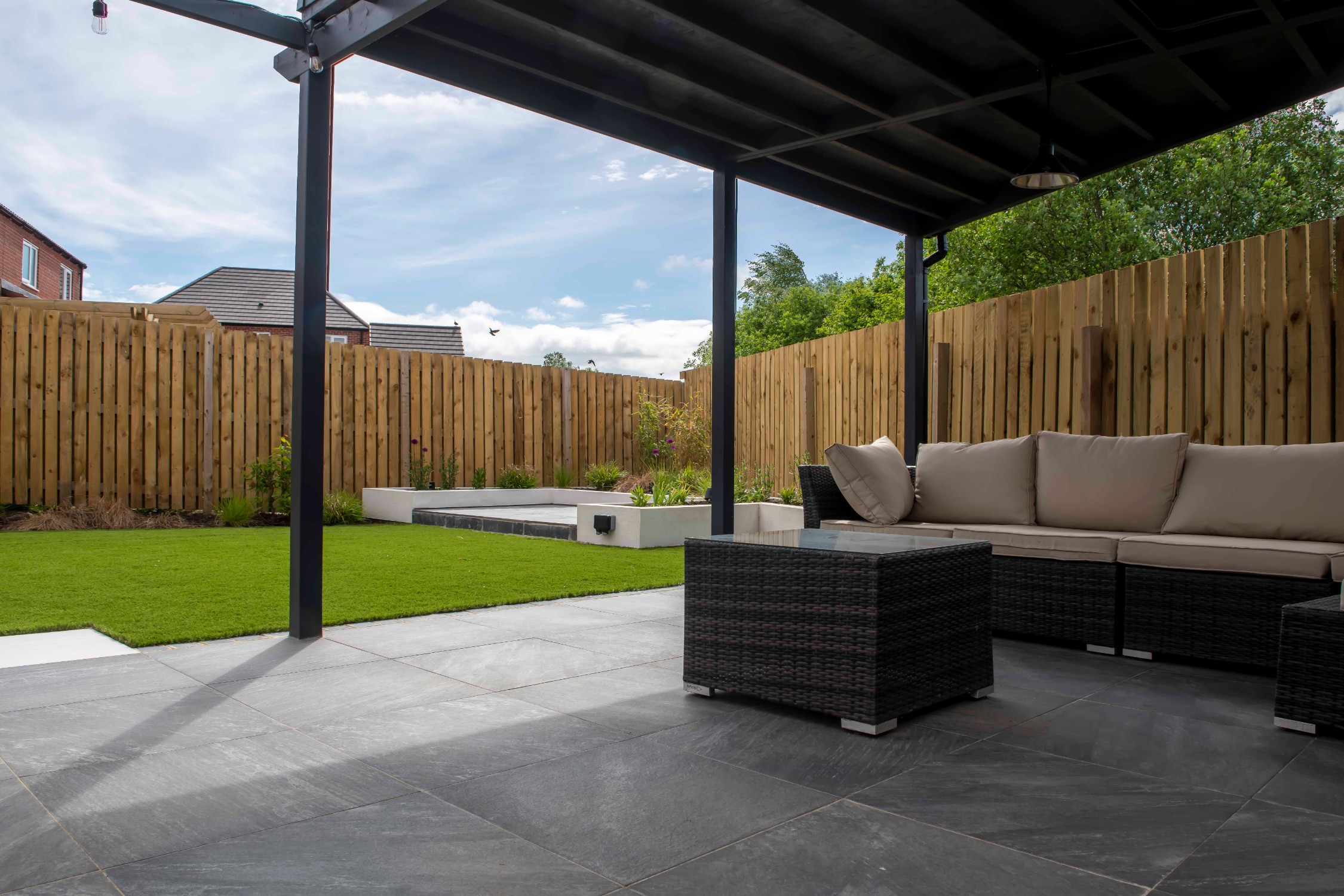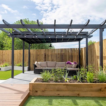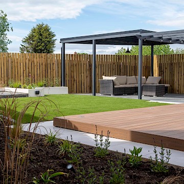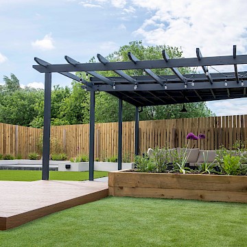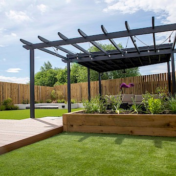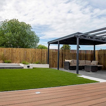 The mean seating and entertaining area is a sawn limestone patio housed under a bespoke gazebo and pergola combination. The allows for shelter but also allows dappled light through the pergola. The planters are rendered with Silicone White K-Rend, and artificial grass is used to reduce the levels of maintenance needed on the garden.