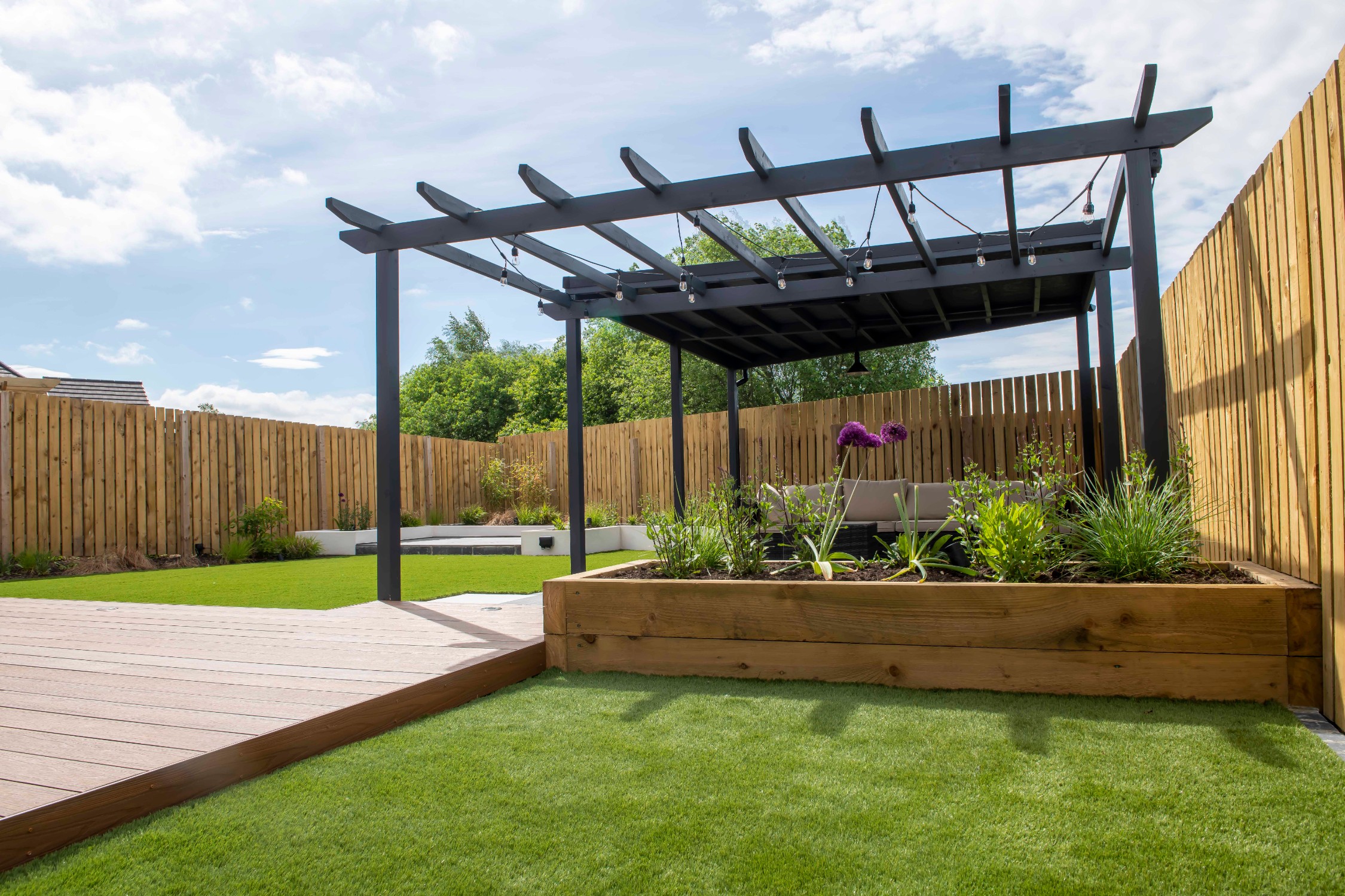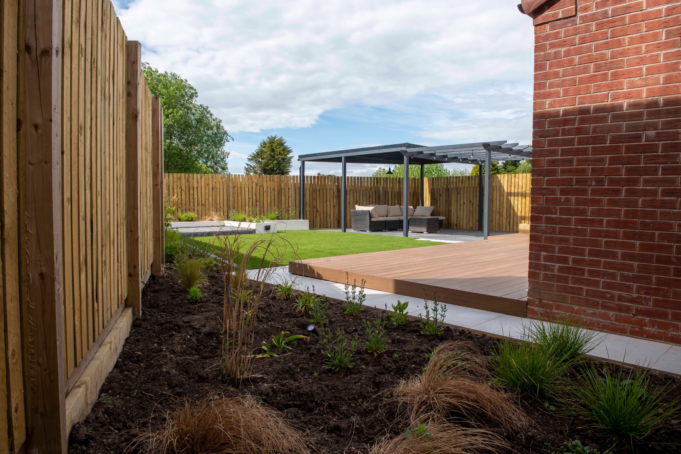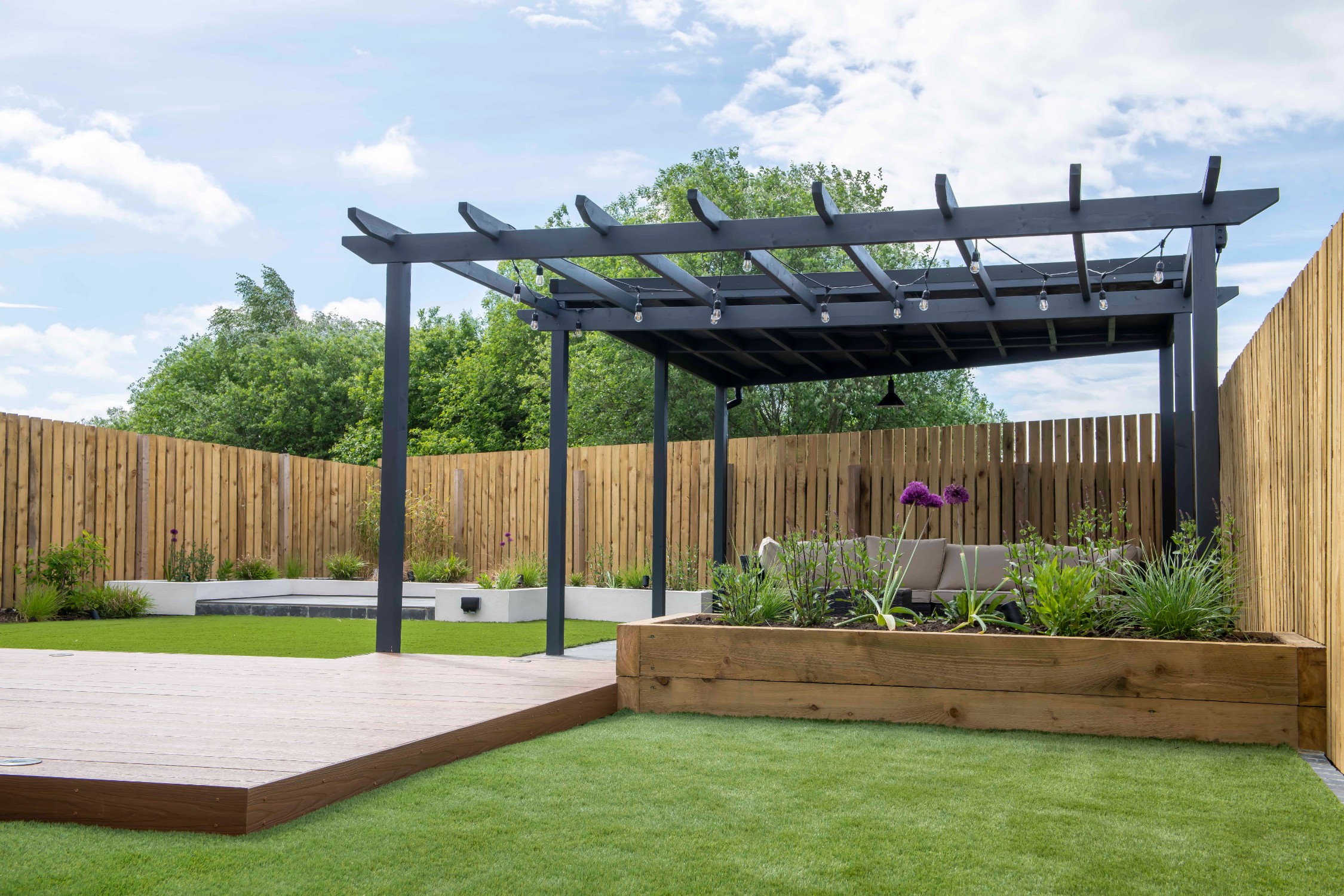 The mean seating and entertaining area is a sawn limestone patio housed under a bespoke gazebo and pergola combination. The allows for shelter but also allows dappled light through the pergola. The planters are rendered with Silicone White K-Rend, and artificial grass is used to reduce the levels of maintenance needed on the garden.