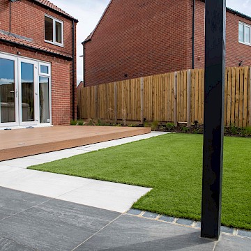This design is a contemporary solution to the design brief. The design uses geometric shapes to separate the different areas of the garden and maximise on the useable space. From the rear patio doors, the garden opens up to a composite decking area with built-in lighting. This is a safe and easy material to maintain.