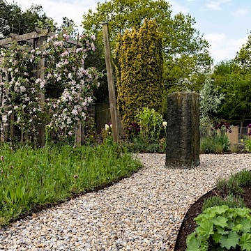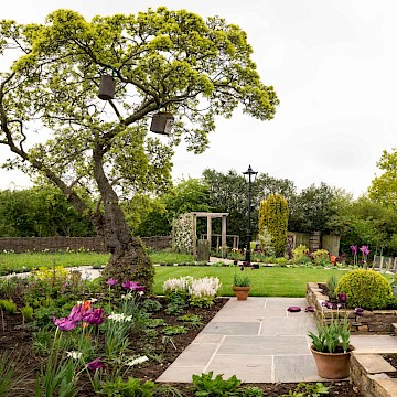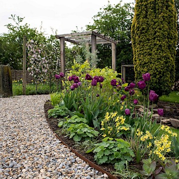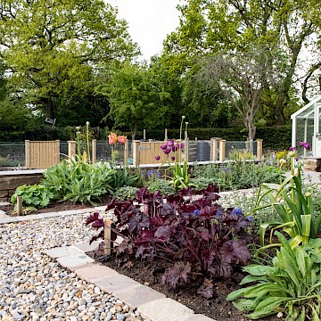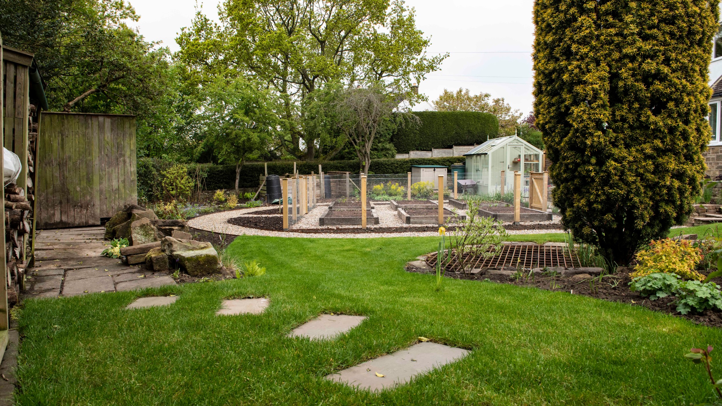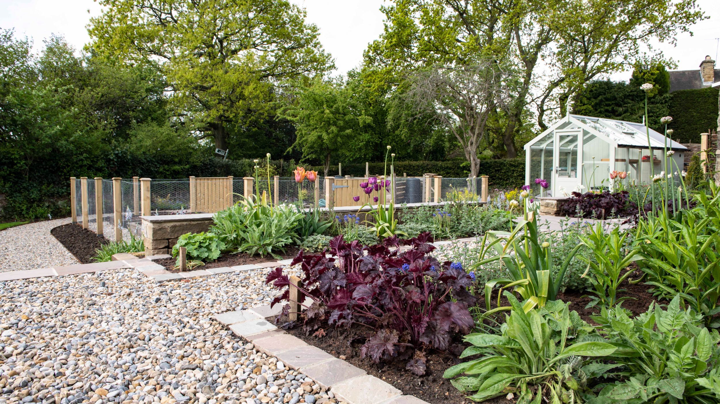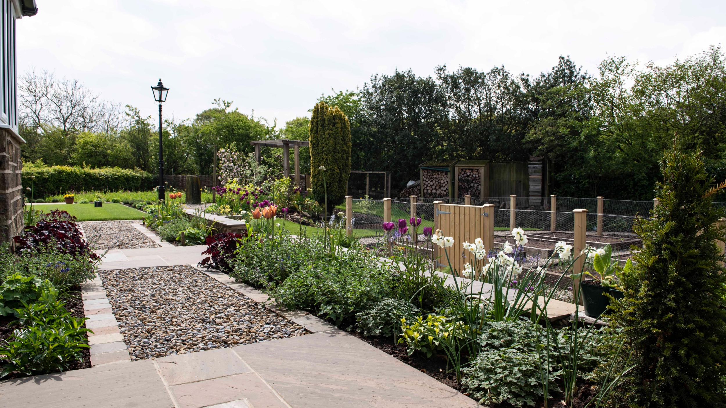 Designed by Tracy Foster, this North Leeds garden features a fenced vegetable plot, a wildflower area, and generous planting space throughout. The design thoughtfully incorporates existing features — including mature trees and even a historic milestone — giving the garden a strong sense of character and continuity. Gravel paths run through the space, ensuring easy, year-round access to every area.