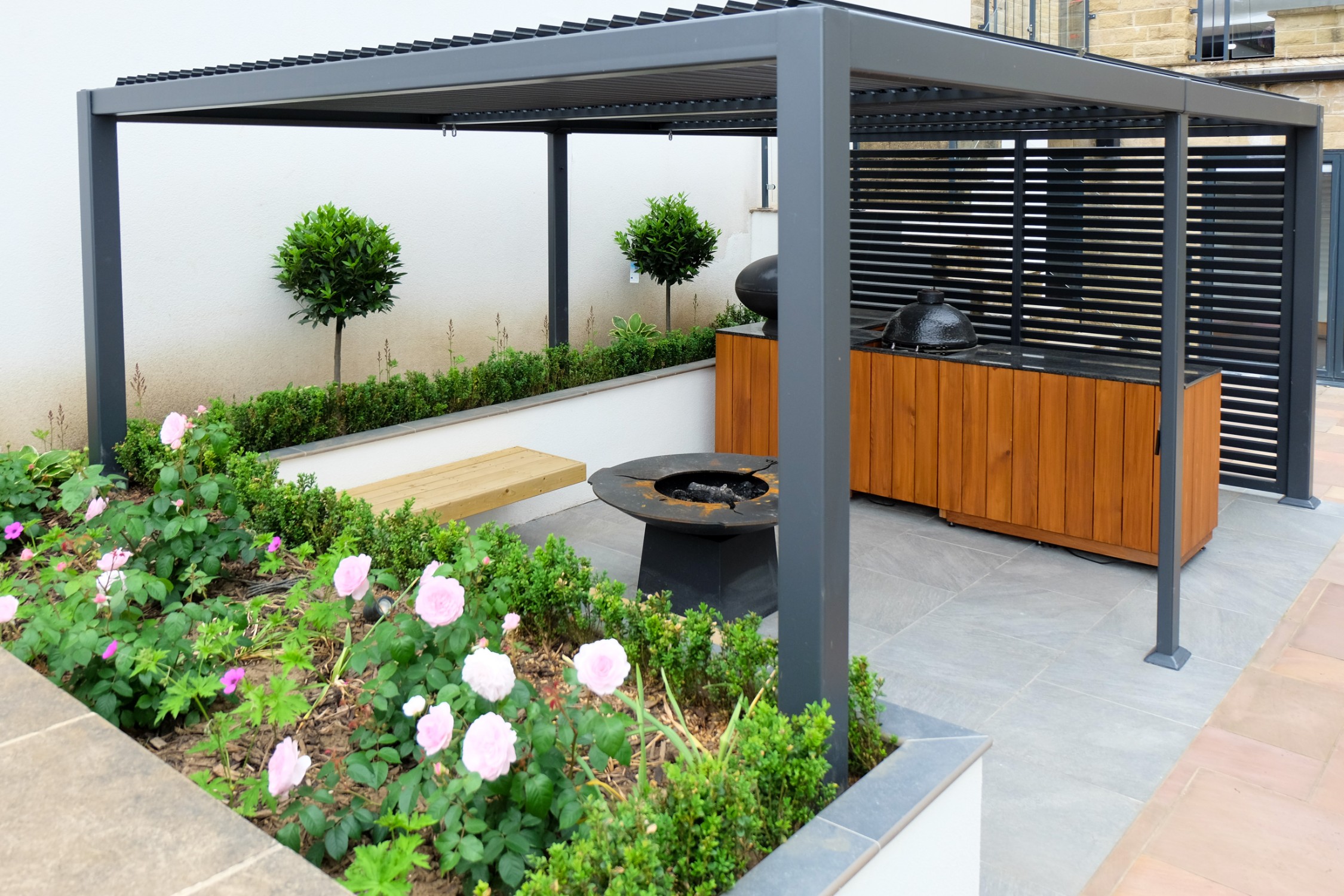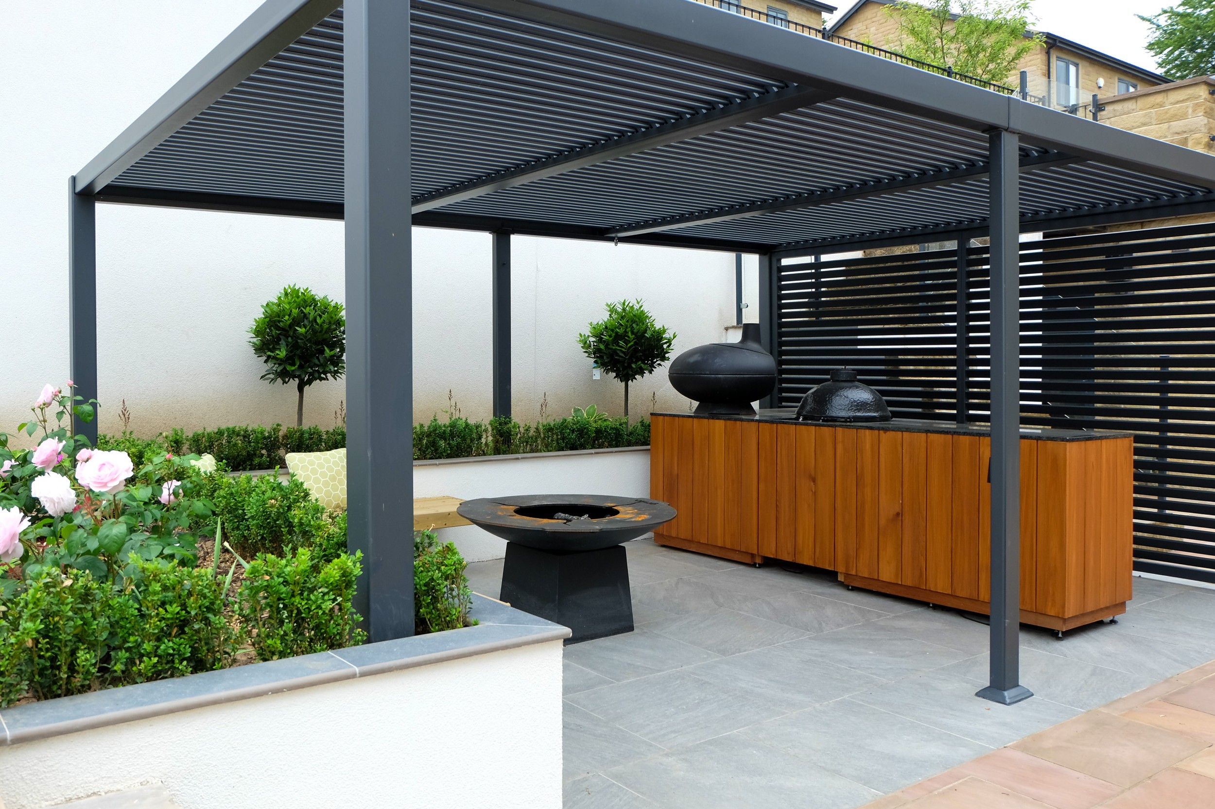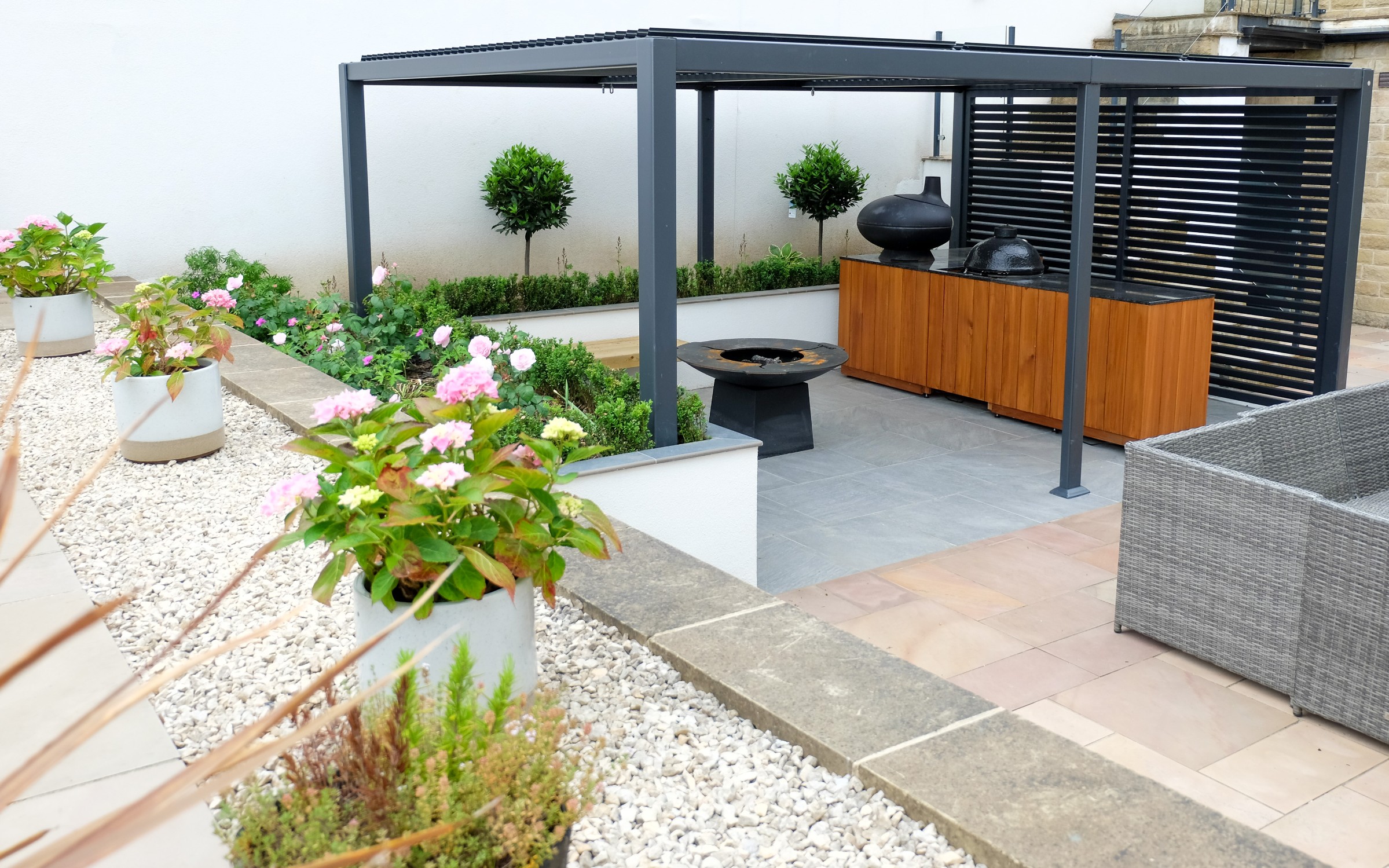 We installed an outdoor kitchen at this large property in Ilkley, transforming the space into a functional and stylish entertaining area. The existing stairway from the road was demolished and rebuilt to create additional room for a generous dining and social space. The design includes an aluminium pergola with electrically adjustable slats, bespoke floating seating integrated into the rendered walls, and a dedicated fire pit area for year-round use. Minimal planting behind the kitchen keeps the focus on the clean lines and contemporary features of the space.
