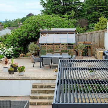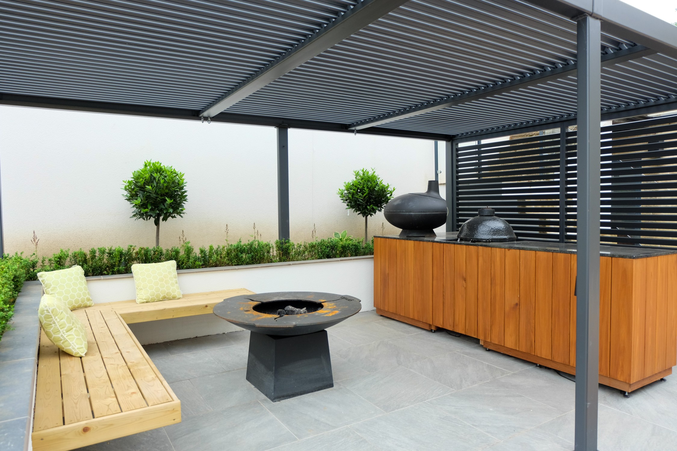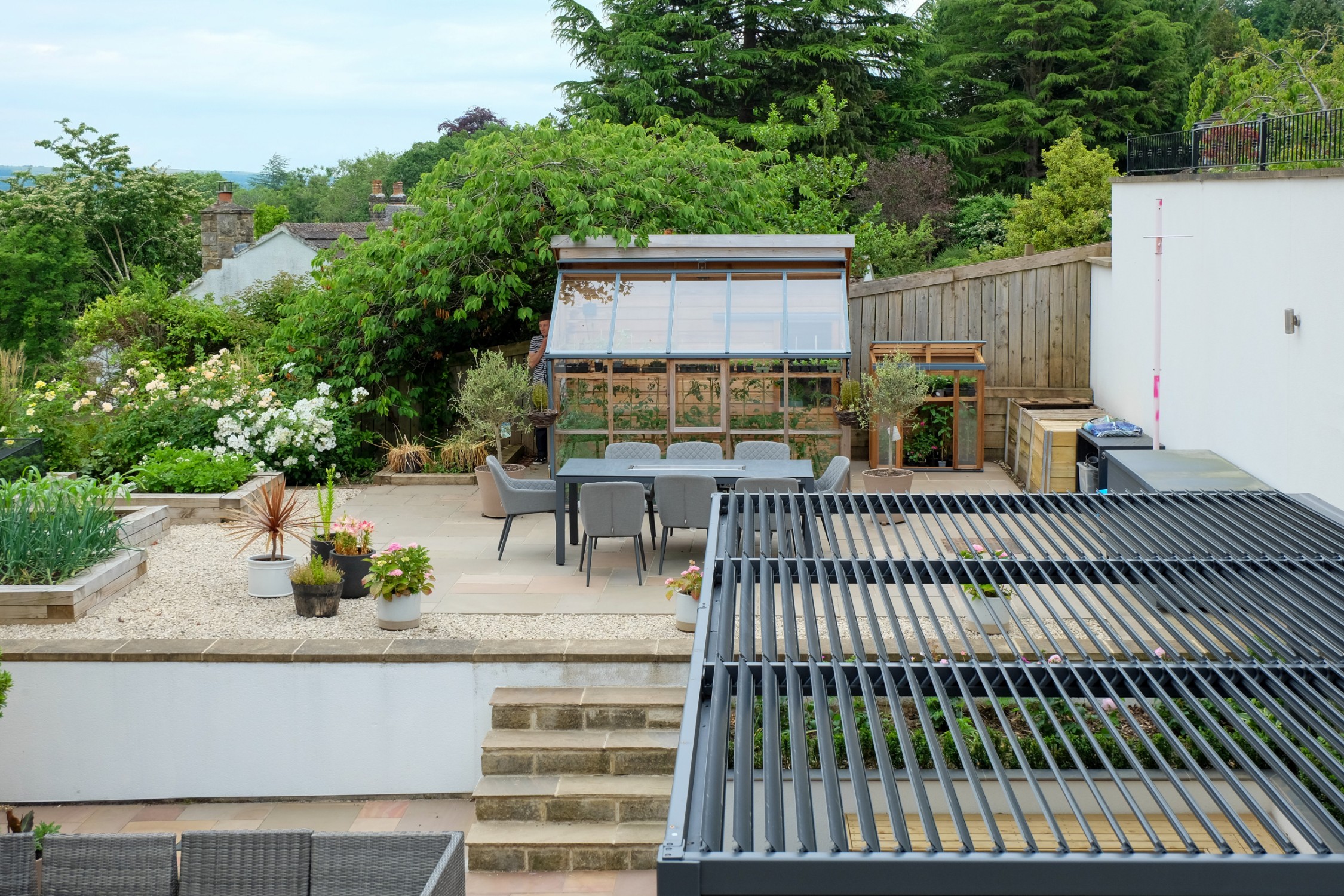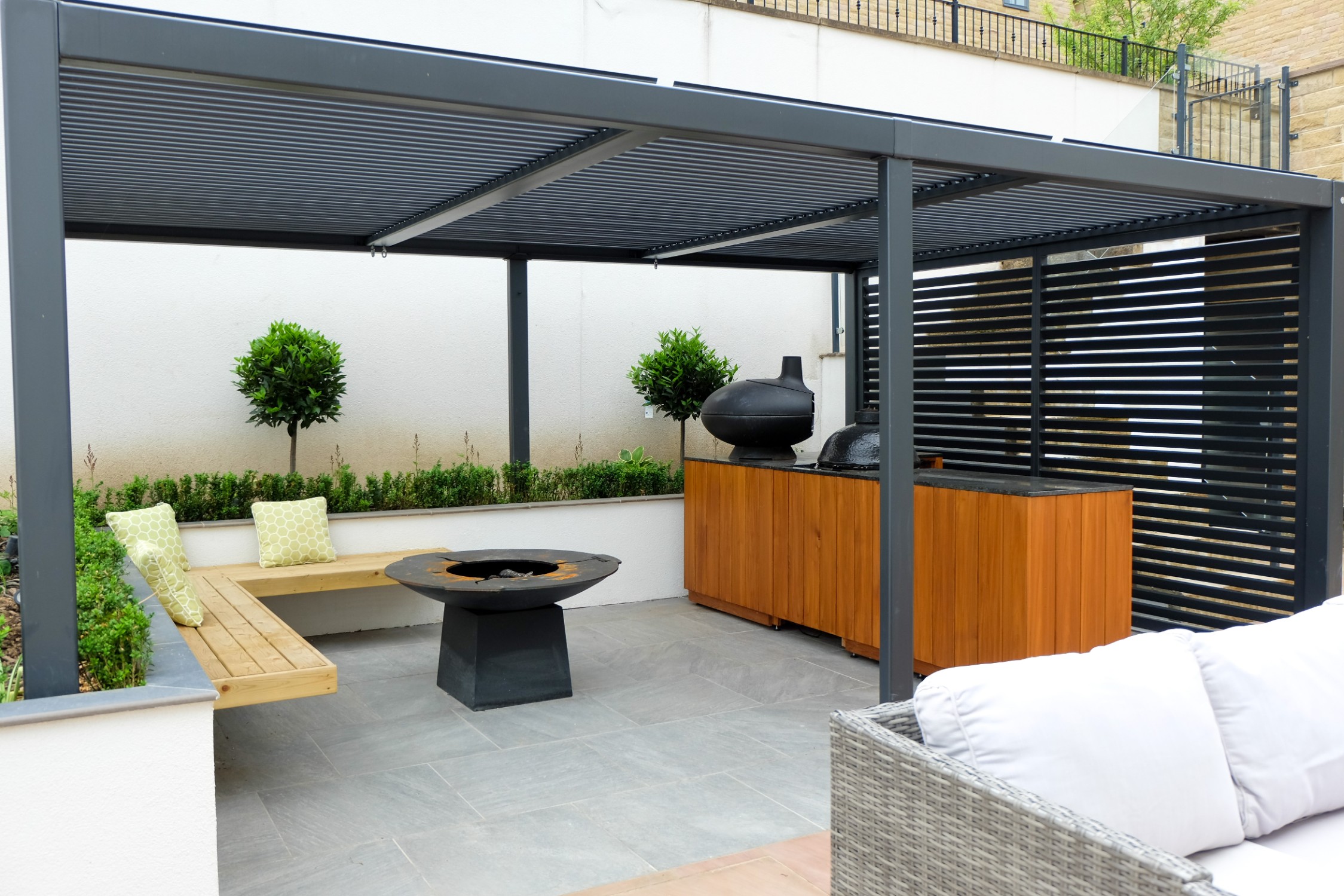 We installed an outdoor kitchen at this large property in Ilkley, transforming the space into a functional and stylish entertaining area. The existing stairway from the road was demolished and rebuilt to create additional room for a generous dining and social space. The design includes an aluminium pergola with electrically adjustable slats, bespoke floating seating integrated into the rendered walls, and a dedicated fire pit area for year-round use. Minimal planting behind the kitchen keeps the focus on the clean lines and contemporary features of the space.