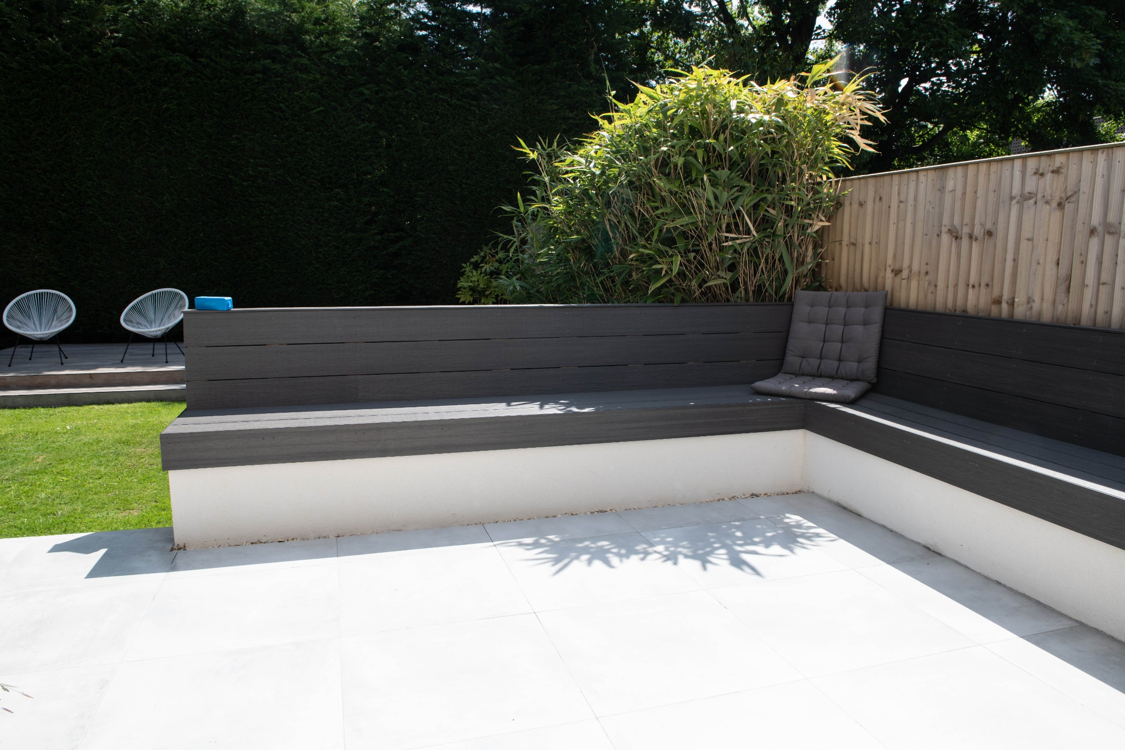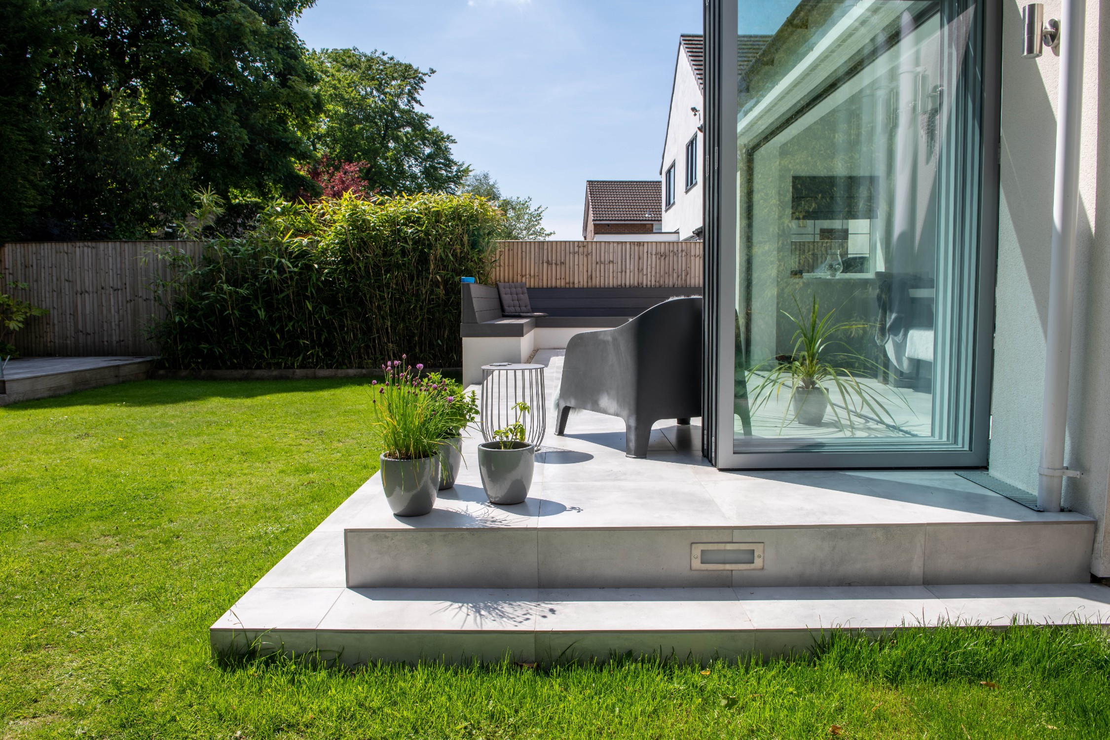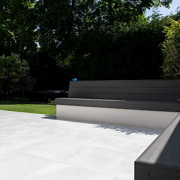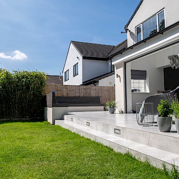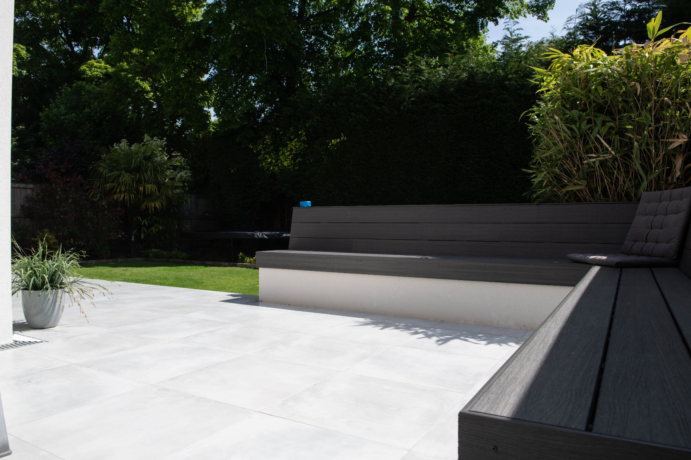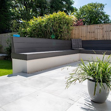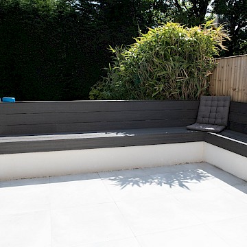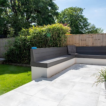 In this project, our client wanted a practical patio area that could be accessed directly from their bi-fold doors. Porcelain paving was selected for its durable, low-maintenance surface and clean contemporary finish. We constructed a reinforced concrete base to ensure long-term stability before laying the tiles, and installed bespoke composite seating finished with K-Rend render to create a cohesive and functional outdoor space.