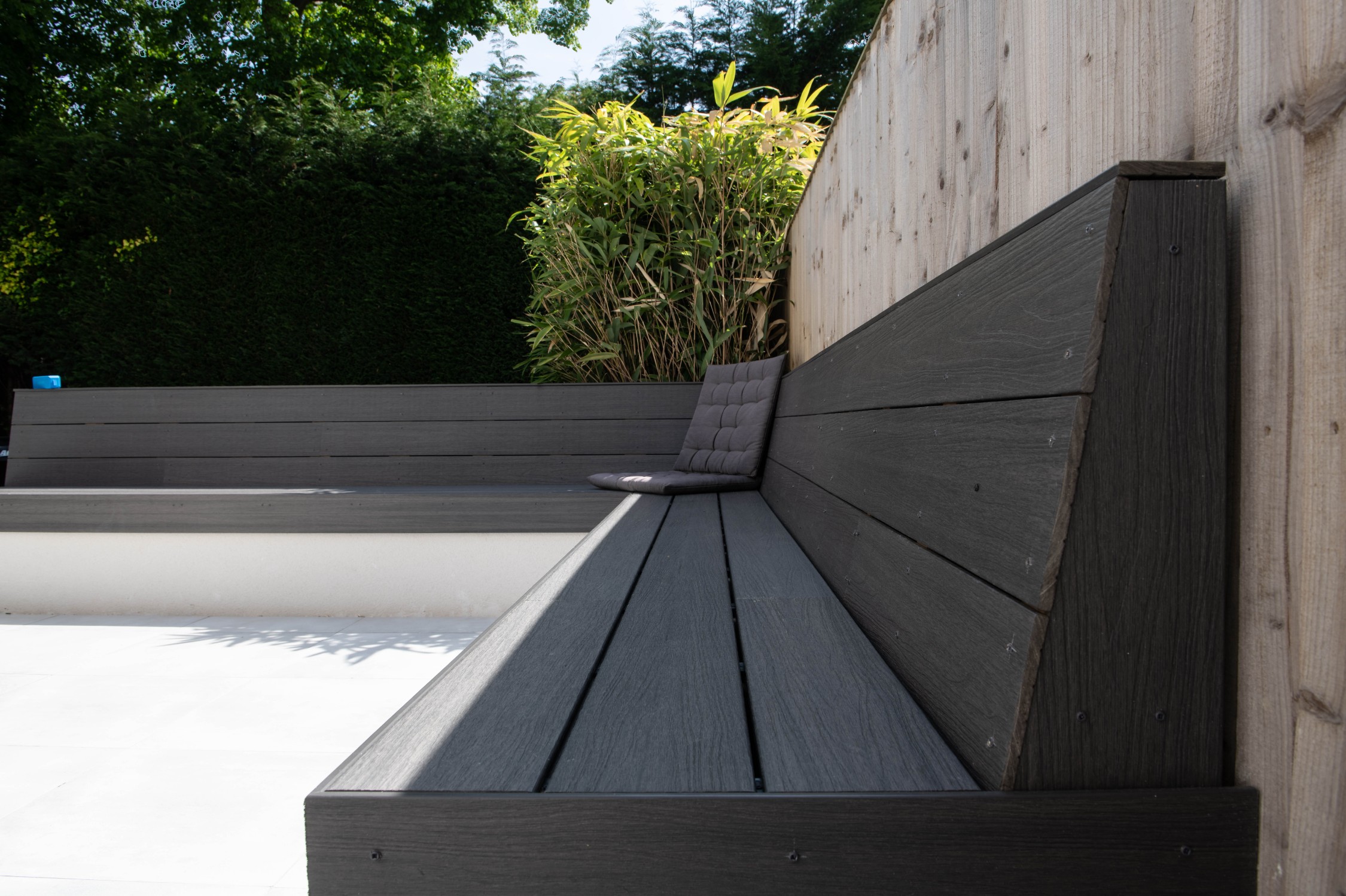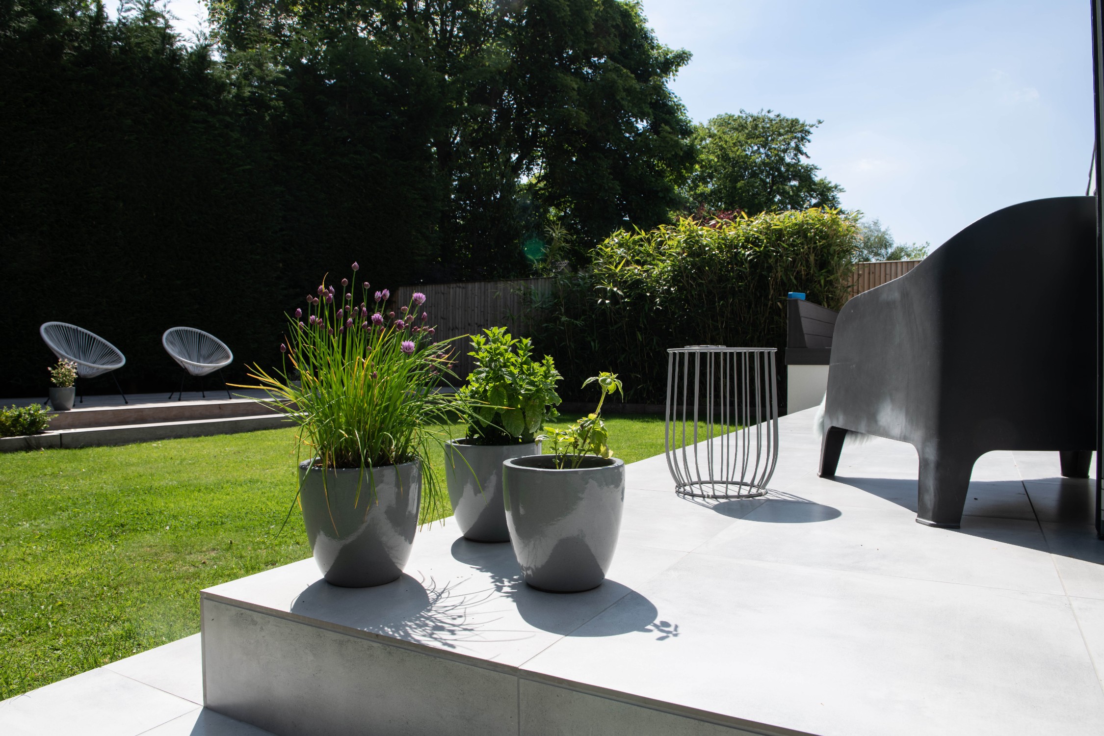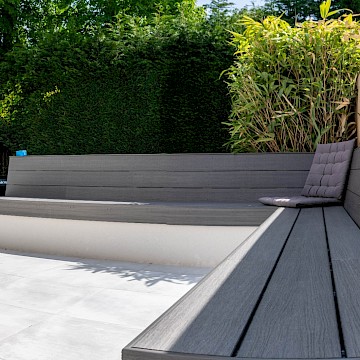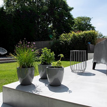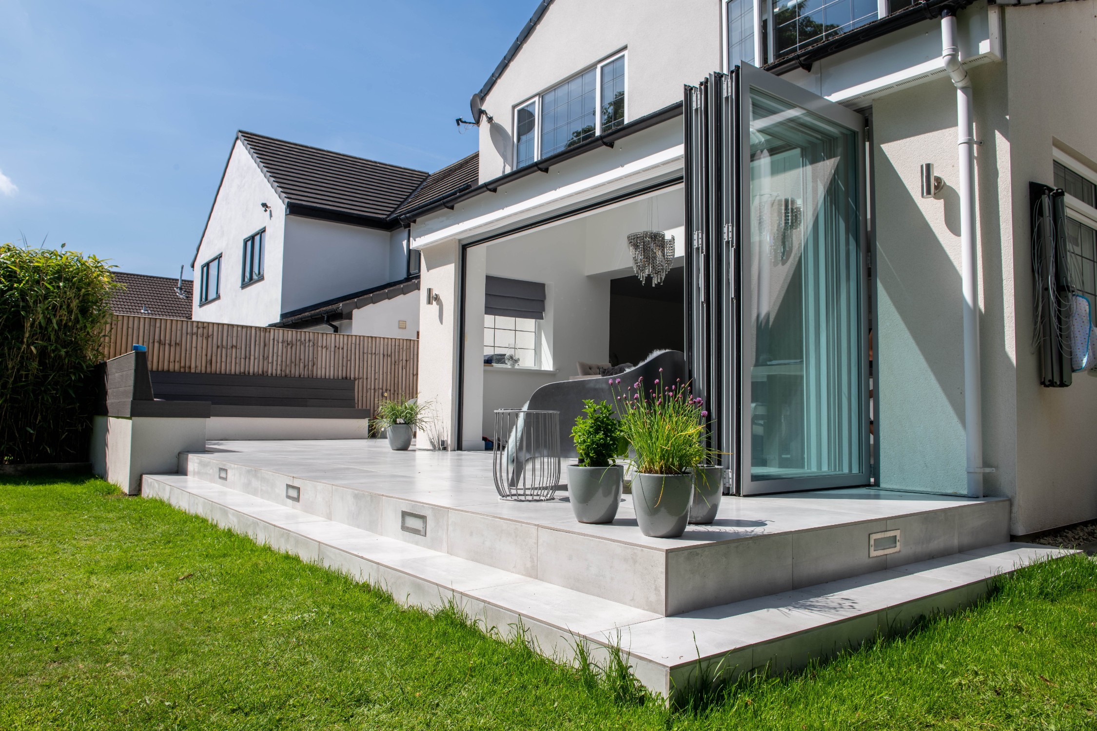 In this project, our client wanted a practical patio area that could be accessed directly from their bi-fold doors. Porcelain paving was selected for its durable, low-maintenance surface and clean contemporary finish. We constructed a reinforced concrete base to ensure long-term stability before laying the tiles, and installed bespoke composite seating finished with K-Rend render to create a cohesive and functional outdoor space.