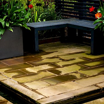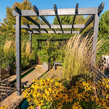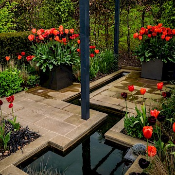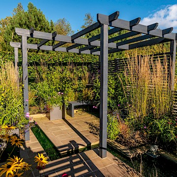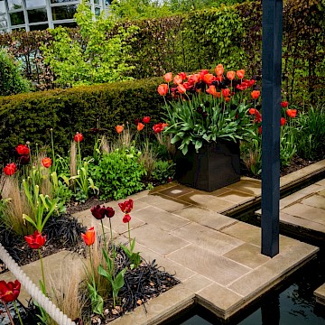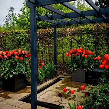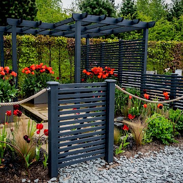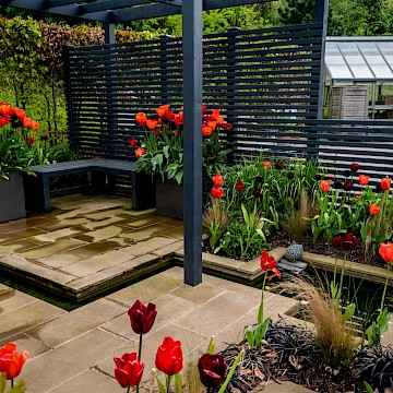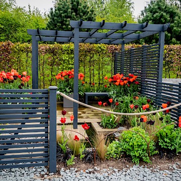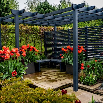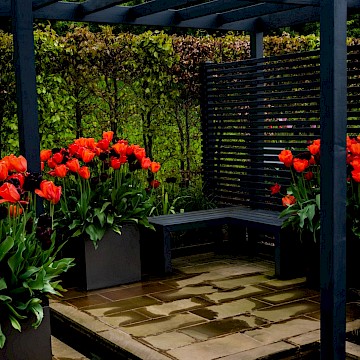 Garden is a permanent garden packed with features to help our local hedgehogs. This garden has a contemporary style. The red tulips provide a striking contrast against the dark grey pergola and horizontal slatted fencing, which were painted using Garden Shades Urban Slate by Cuprinol.
