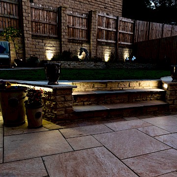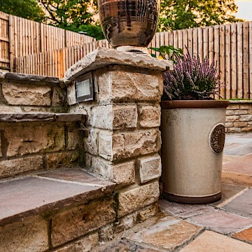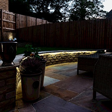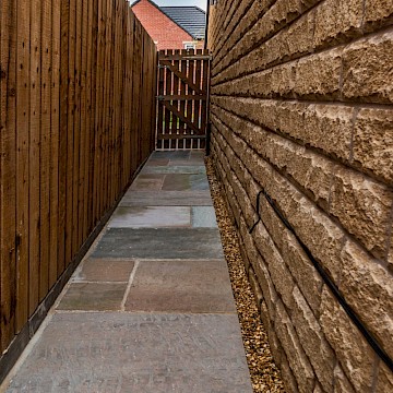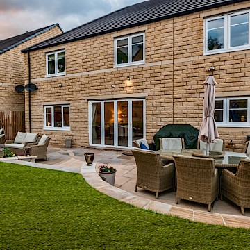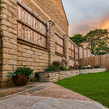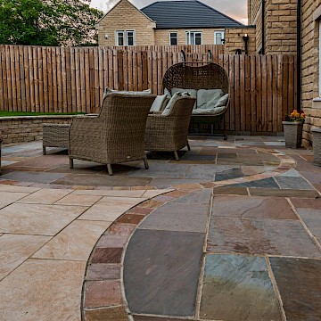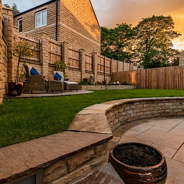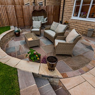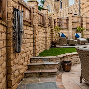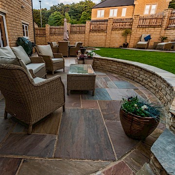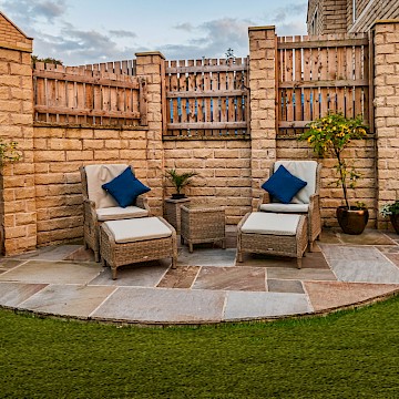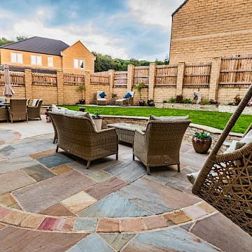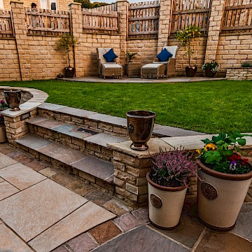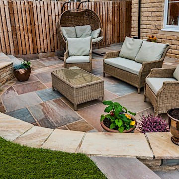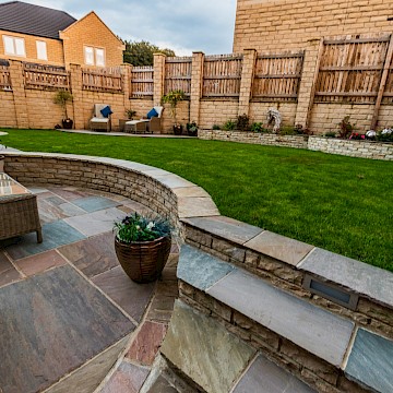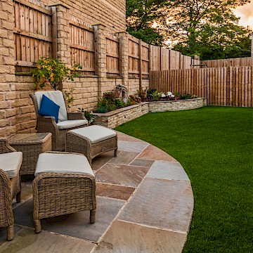 Our client moved into a newly built home with a sloping back garden and wanted a functional outdoor space that combined a lawn with a patio for relaxation.
