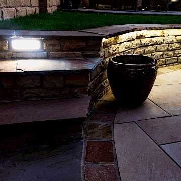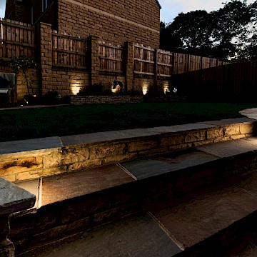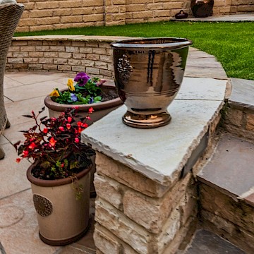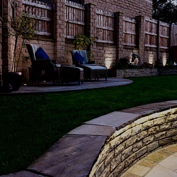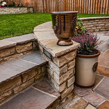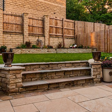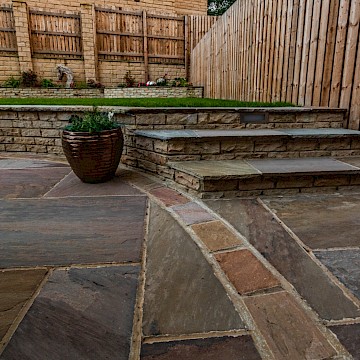 The design divided the garden into two distinct levels. The lower tier featured a stylish patio, blending Indian sandstone and porcelain paving to emphasize the garden’s interlocking shapes. The upper tier offered a lush green space, raised planting beds, and an additional seating area positioned to capture the evening sun.