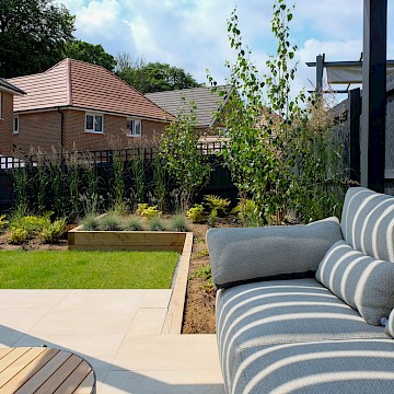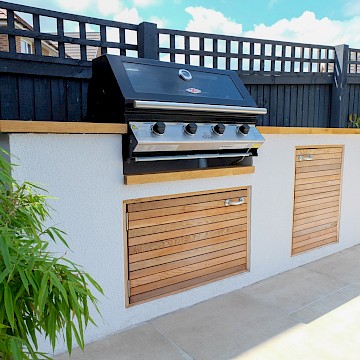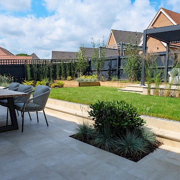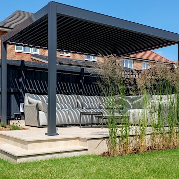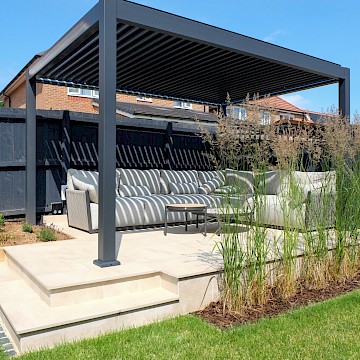 We created three tiers in the garden to maximise the usability of the area. The lower area is perfect for entertaining, with space for a large dining table. We constructed a bespoke outdoor kitchen area with storage cupboards and worktop space. The top patio area is a great space for relaxing and enjoying the evening sun. We installed an electric pergola over this patio. This pergola has moving panels which allows you to adjust the amount of light that comes through.