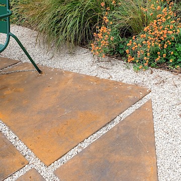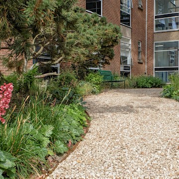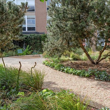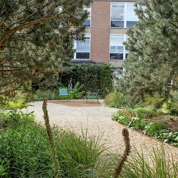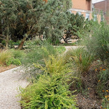 The Stroke Recovery garden at Chapel Allerton Hospital was designed as a tranquil and accessible space for stroke survivors. Having survived a stroke, garden designer Miria Harris, used her personal experience to inform this peaceful garden space. At its heart stands a large existing birch tree, around which the garden was thoughtfully arranged. A winding path leads from the hospital’s ground floor access into the garden, laid with Yorkshire Cream gravel on StablePAVE gravel grids to ensure stability and ease of use for wheelchair users. The air is filled with the pungent scent of pine, creating a calming and restorative atmosphere.