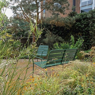 A standout feature of the garden is the crooked trees, chosen as symbols of the journey of a stroke survivor, representing resilience and transformation. All the plants, along with a metal structure originally used as a bridge at the RHS Chelsea Flower Show, were transported and repurposed into a feature seating area. This meaningful project was made possible through funding from the Stroke Association.